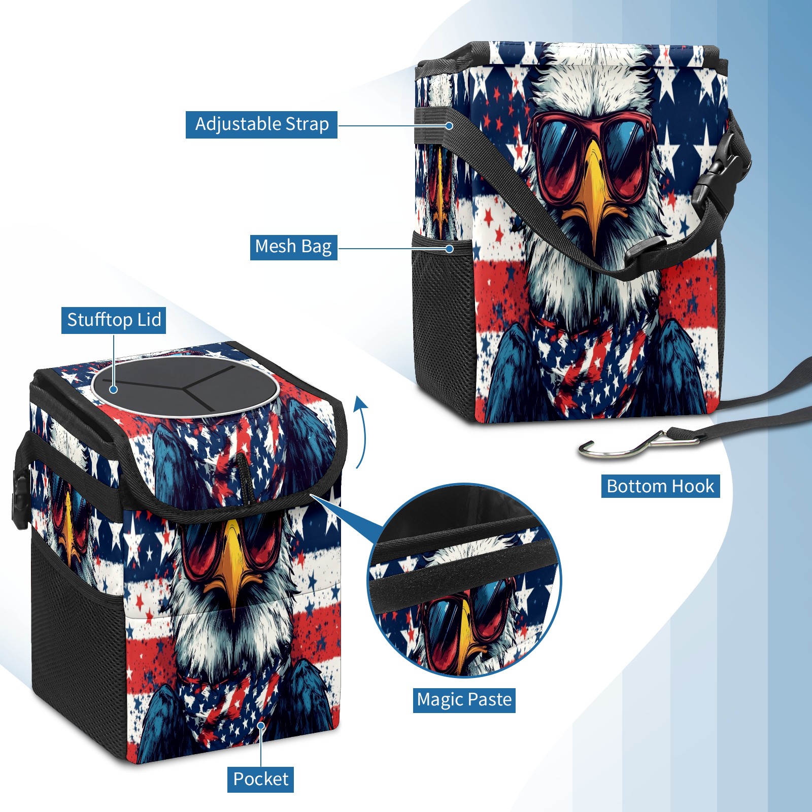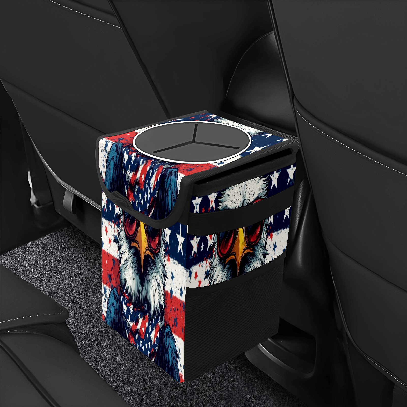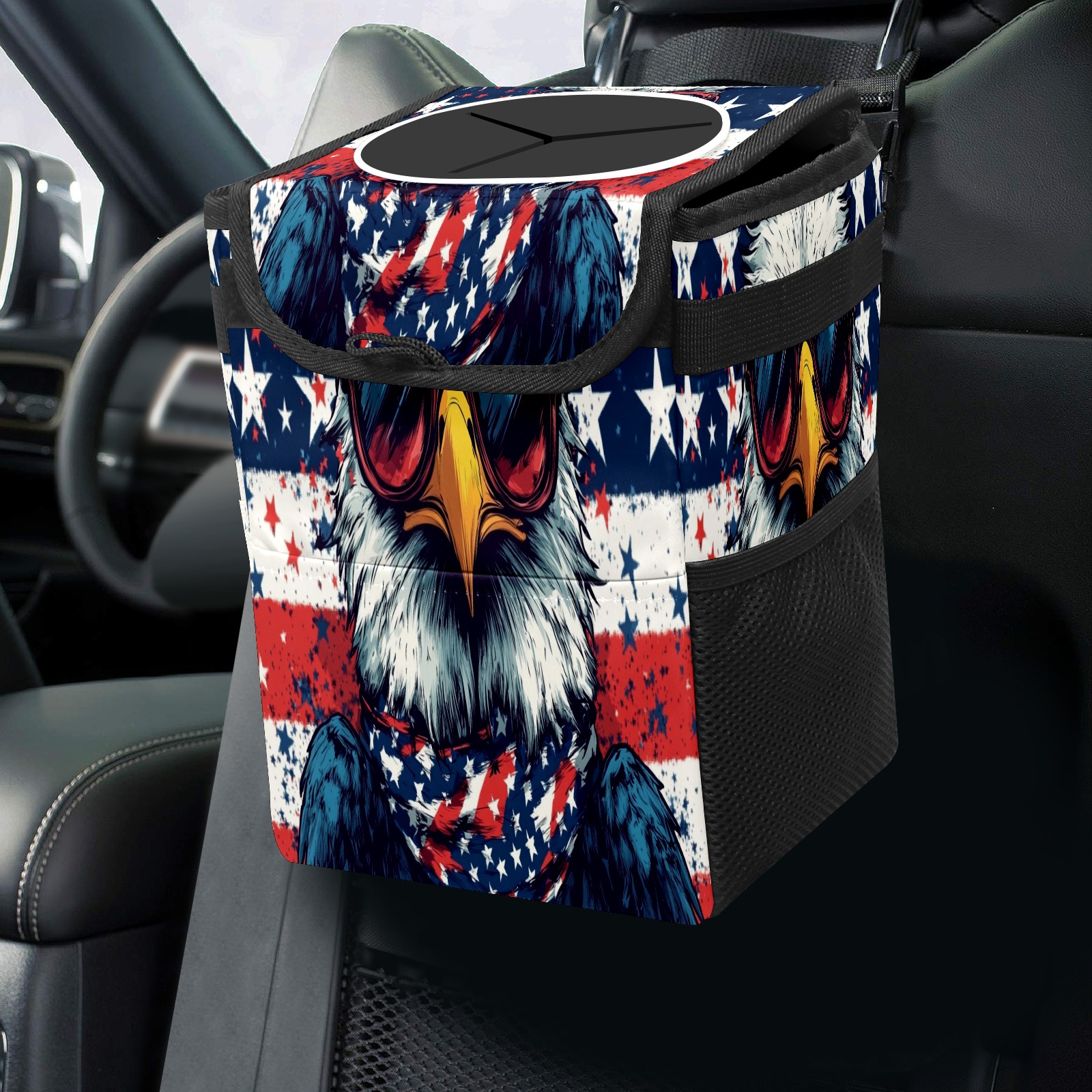 Car Trash Can with Lid, Small Portable Hanging Automotive Garbage Bin for Vehicles, Leakproof Waste Bag Container for SUV Truck Van Interior Auto Travel Road Trips(Eagle And American Flag)