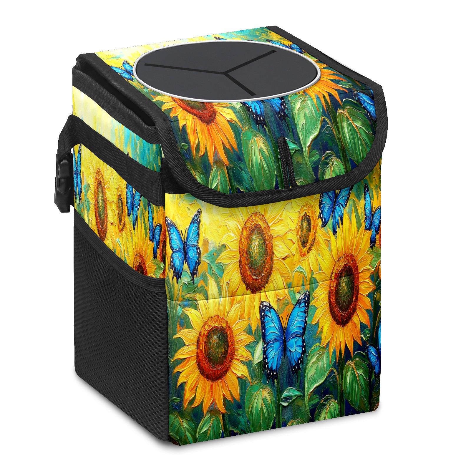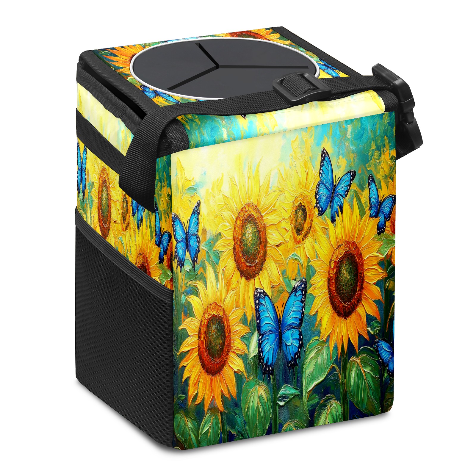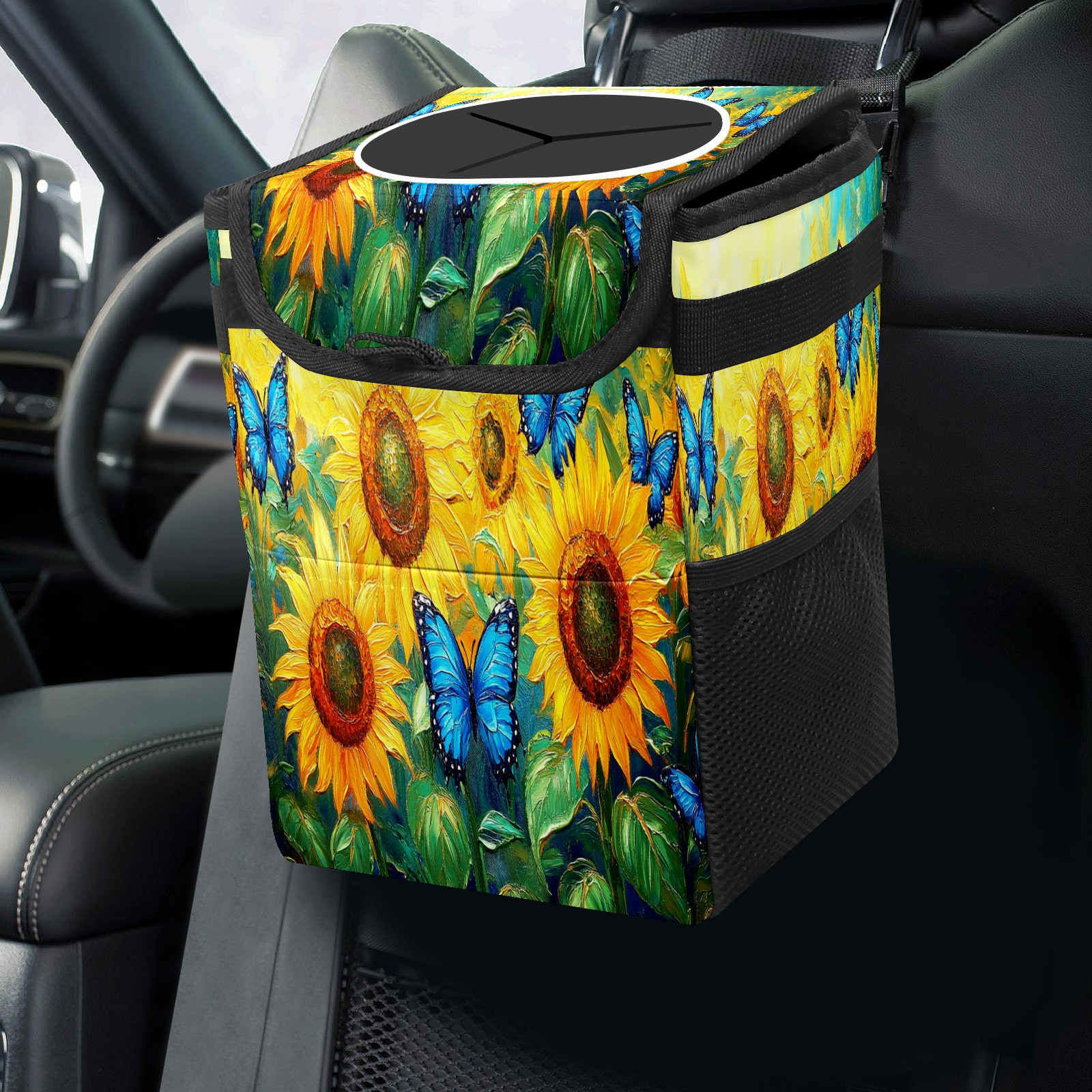 Car Trash Can with Lid, Small Portable Hanging Automotive Garbage Bin for Vehicles, Leakproof Waste Bag Container for SUV Truck Van Interior Auto Travel Road Trips(Sunflowers Butterflies)