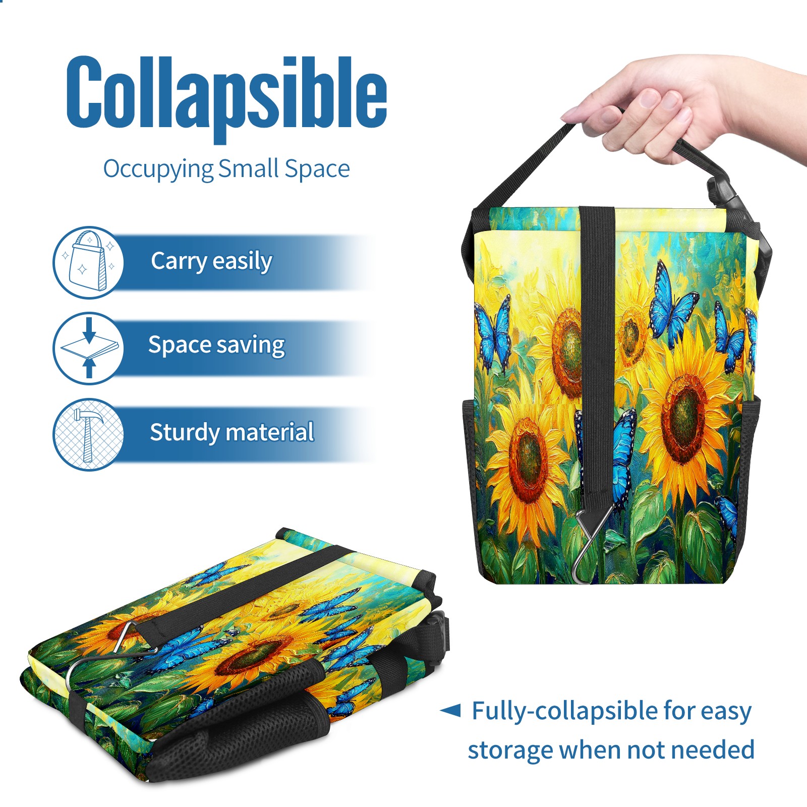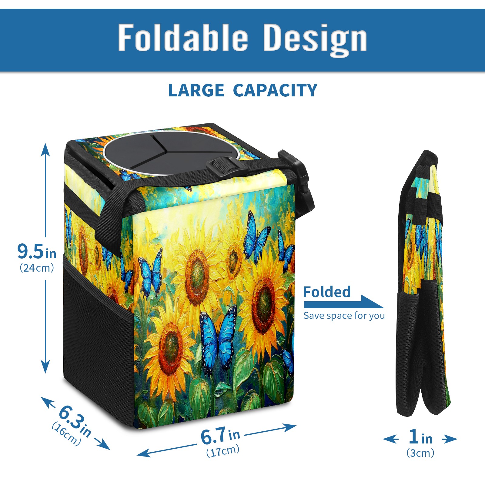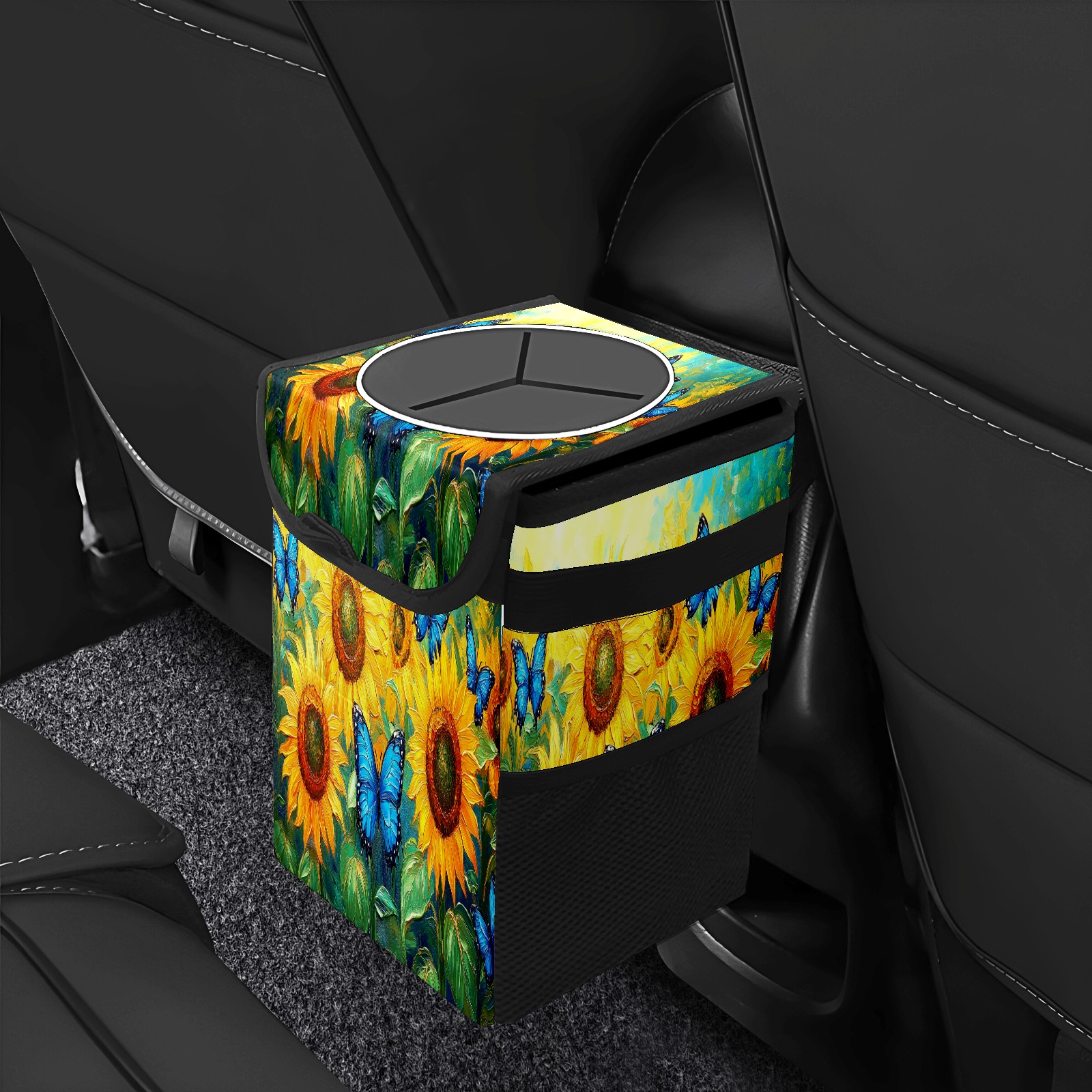 Car Trash Can with Lid, Small Portable Hanging Automotive Garbage Bin for Vehicles, Leakproof Waste Bag Container for SUV Truck Van Interior Auto Travel Road Trips(Sunflowers Butterflies)