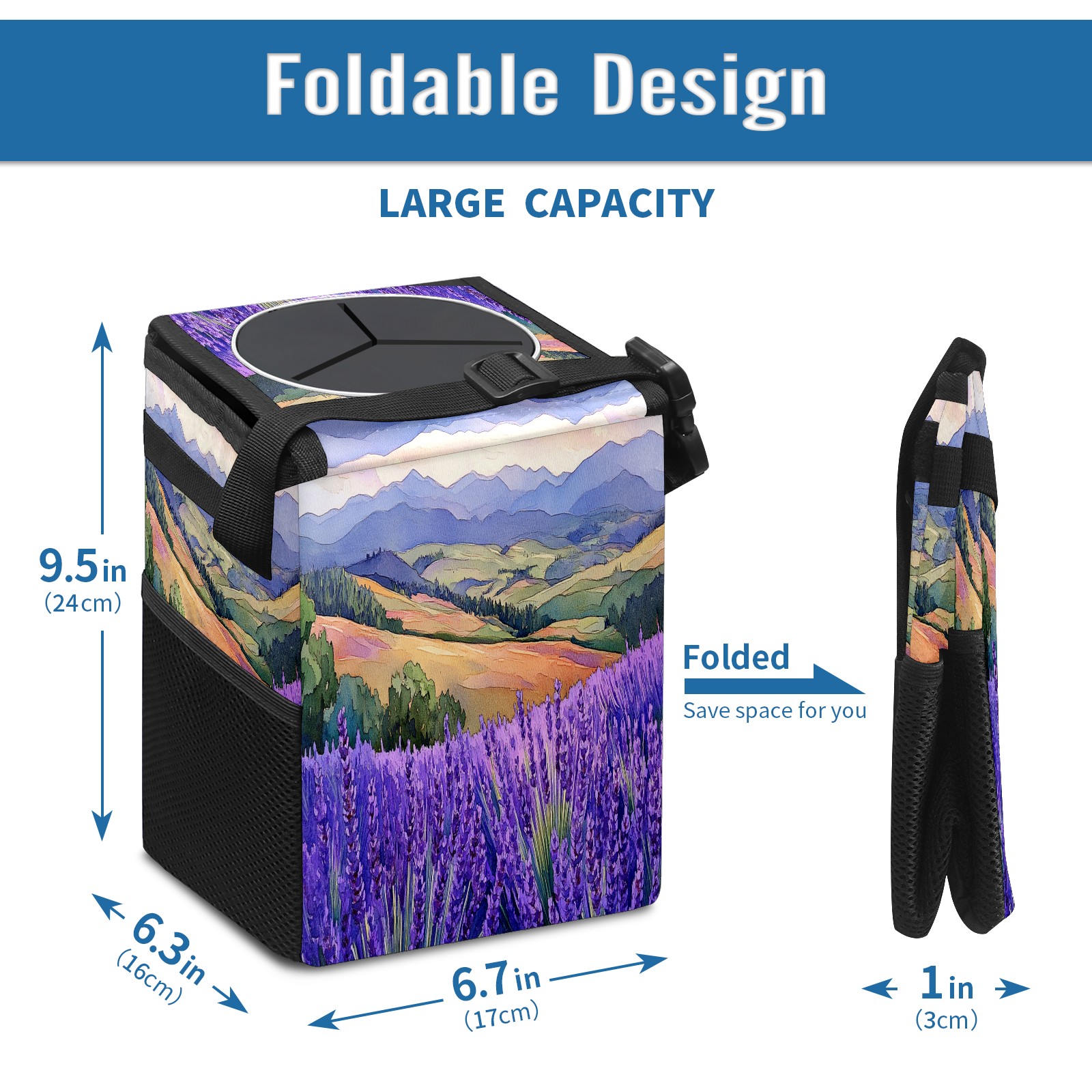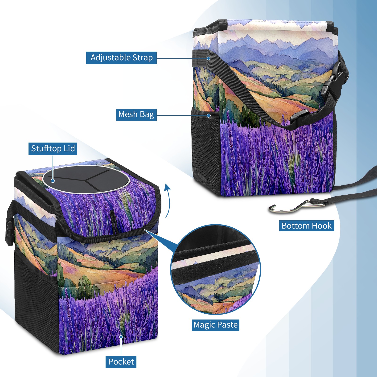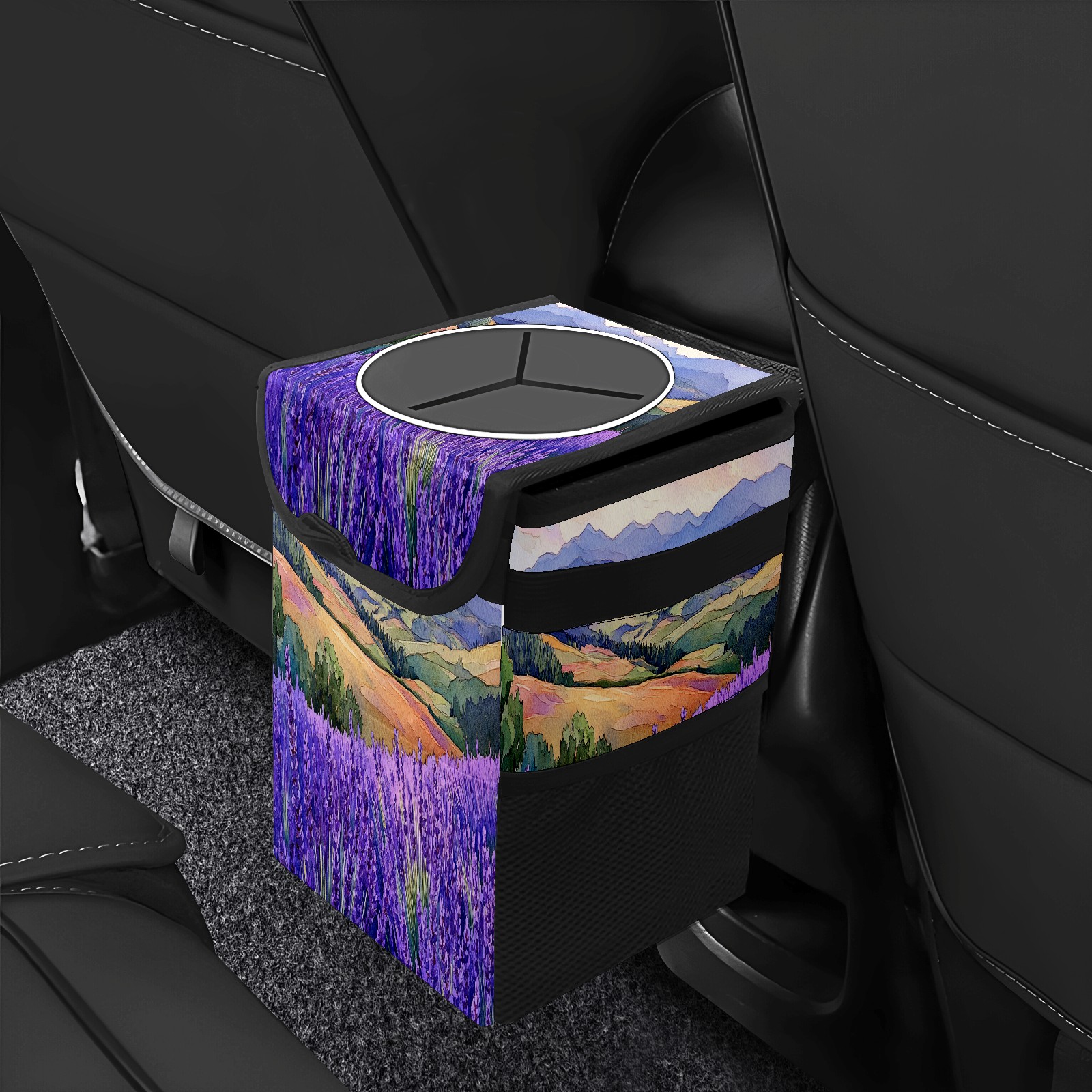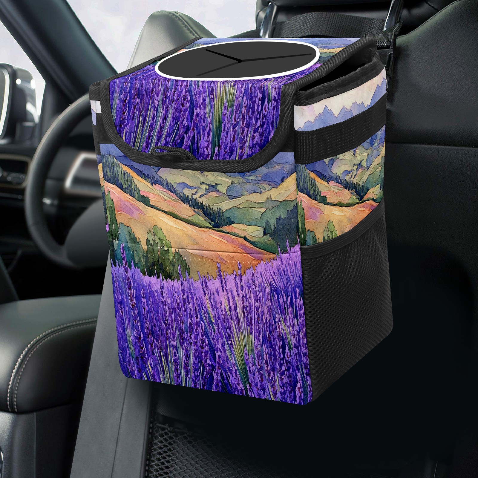 Car Trash Can with Lid, Small Portable Hanging Automotive Garbage Bin for Vehicles, Leakproof Waste Bag Container for SUV Truck Van Interior Auto Travel Road Trips(Lavender Field)