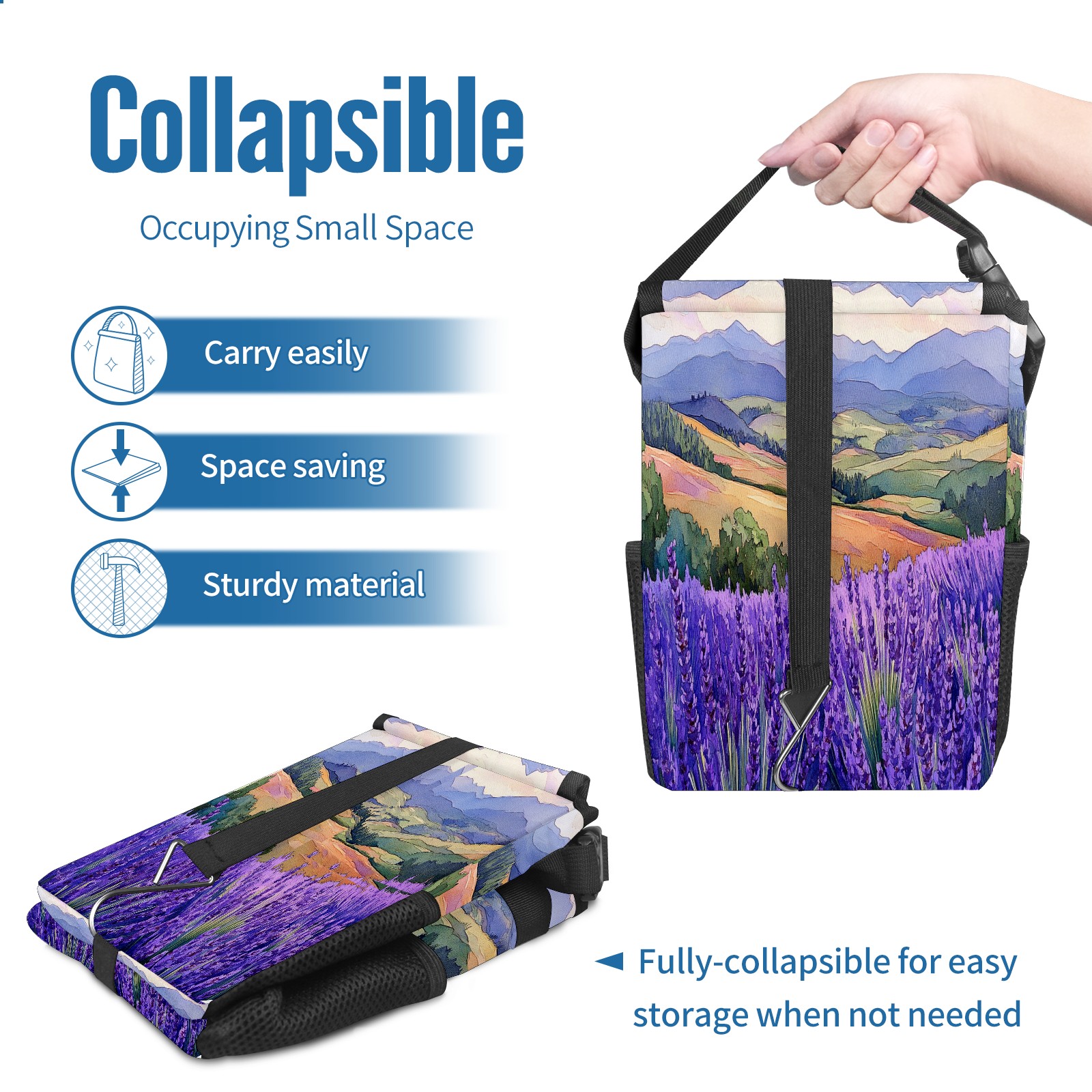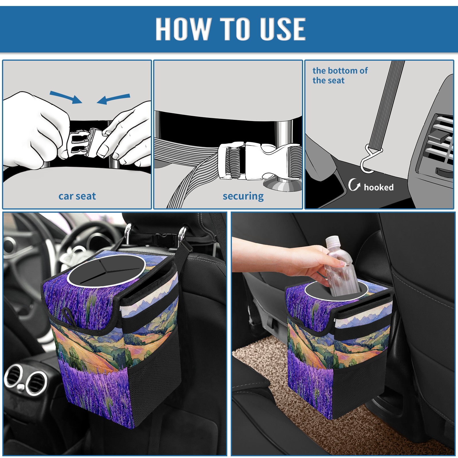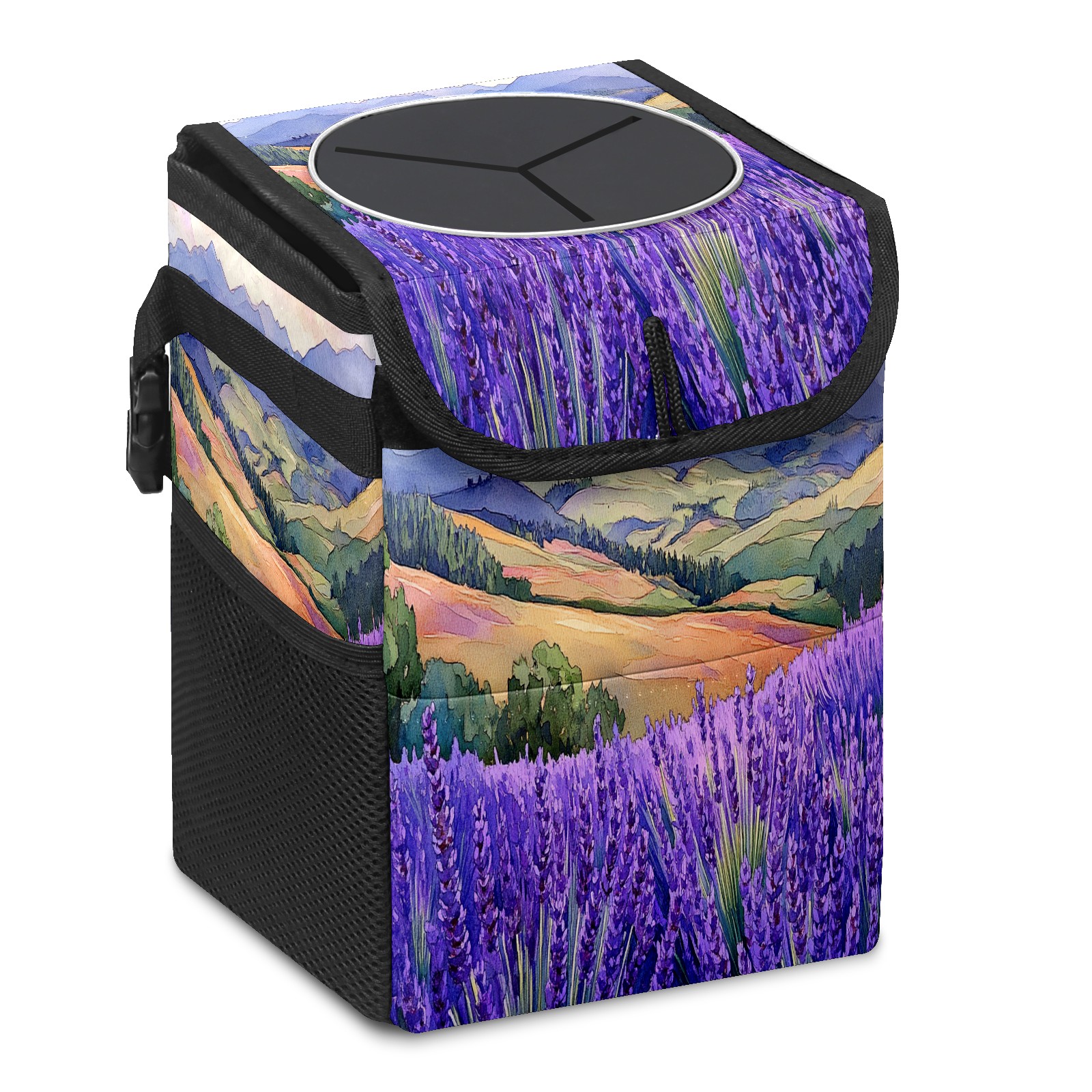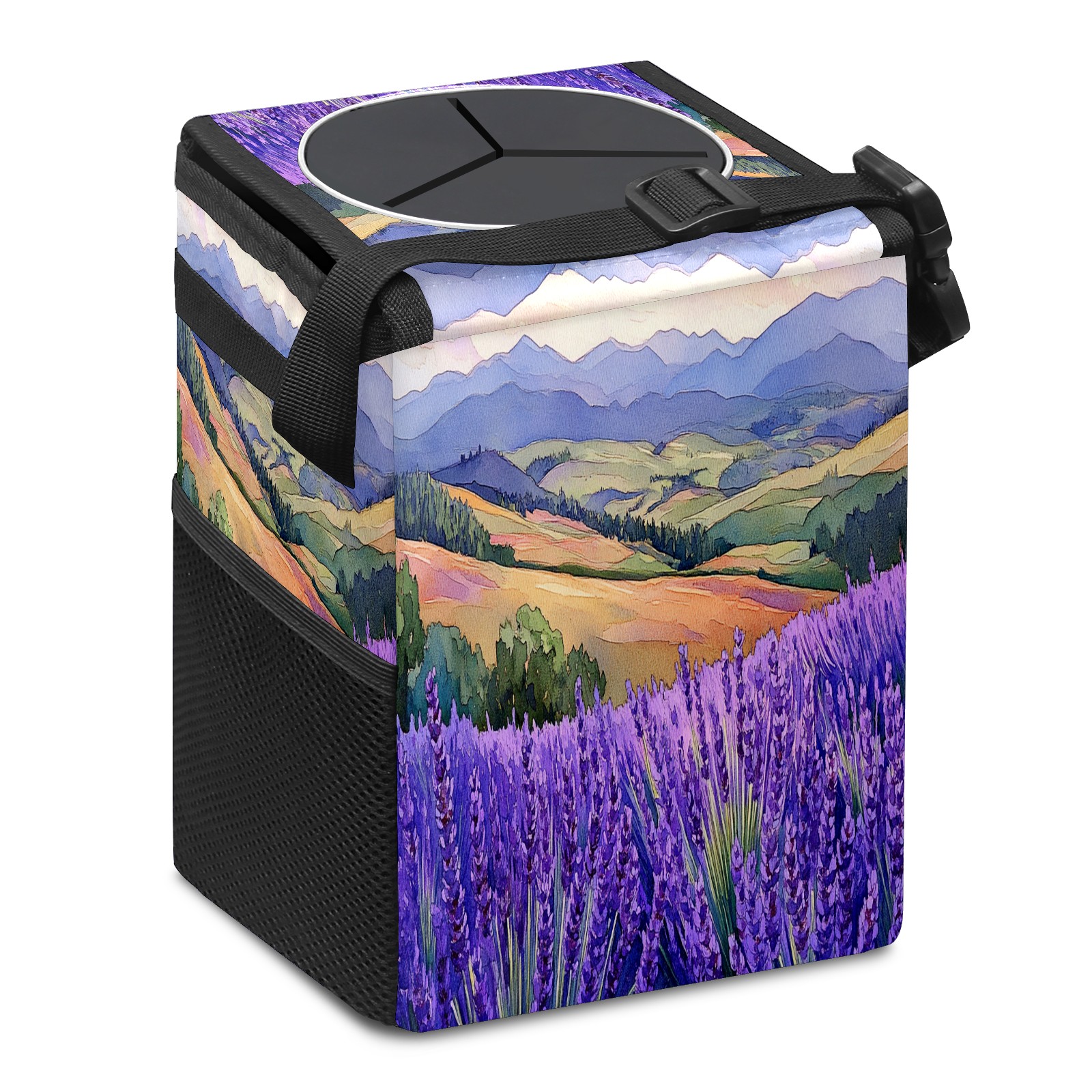 Car Trash Can with Lid, Small Portable Hanging Automotive Garbage Bin for Vehicles, Leakproof Waste Bag Container for SUV Truck Van Interior Auto Travel Road Trips(Lavender Field)