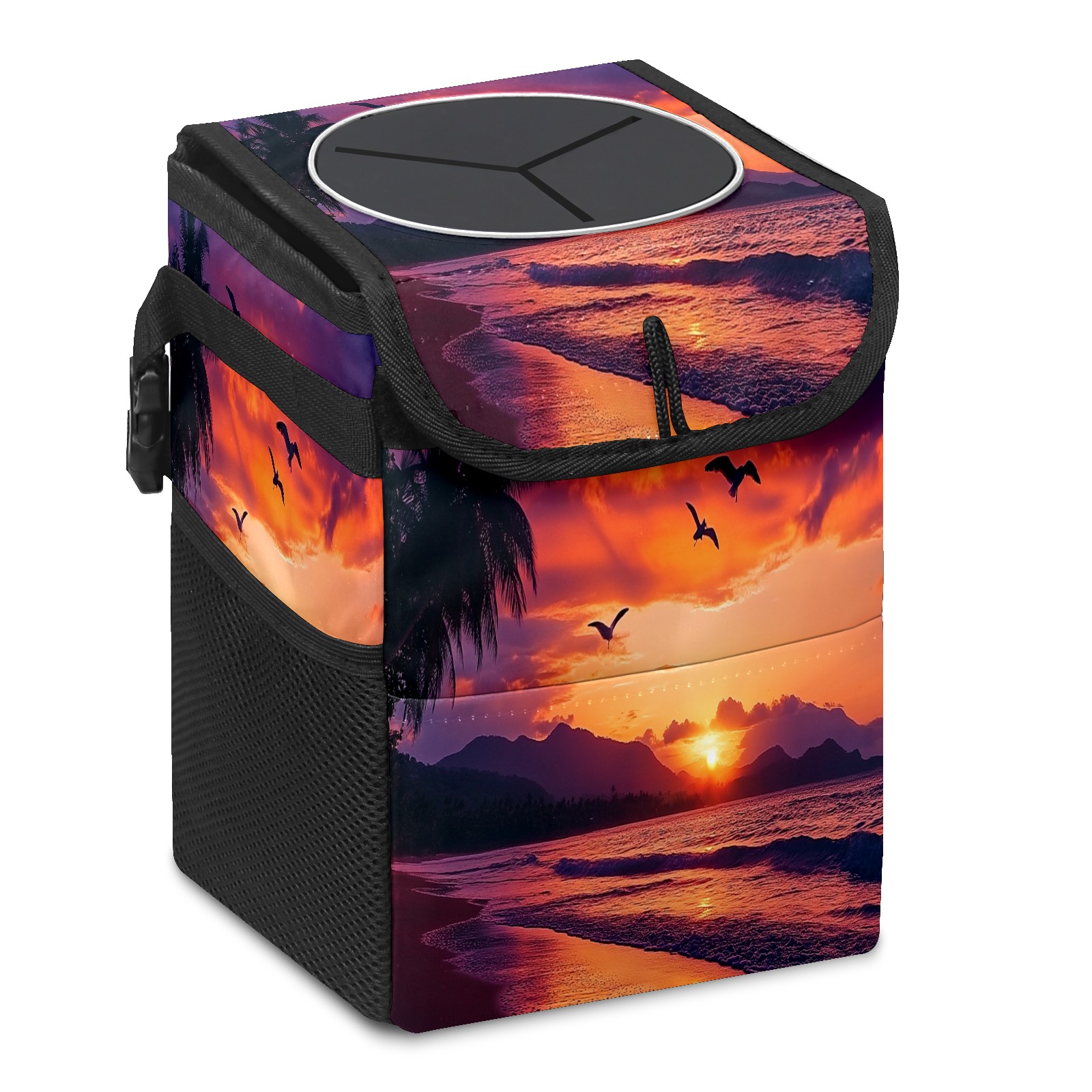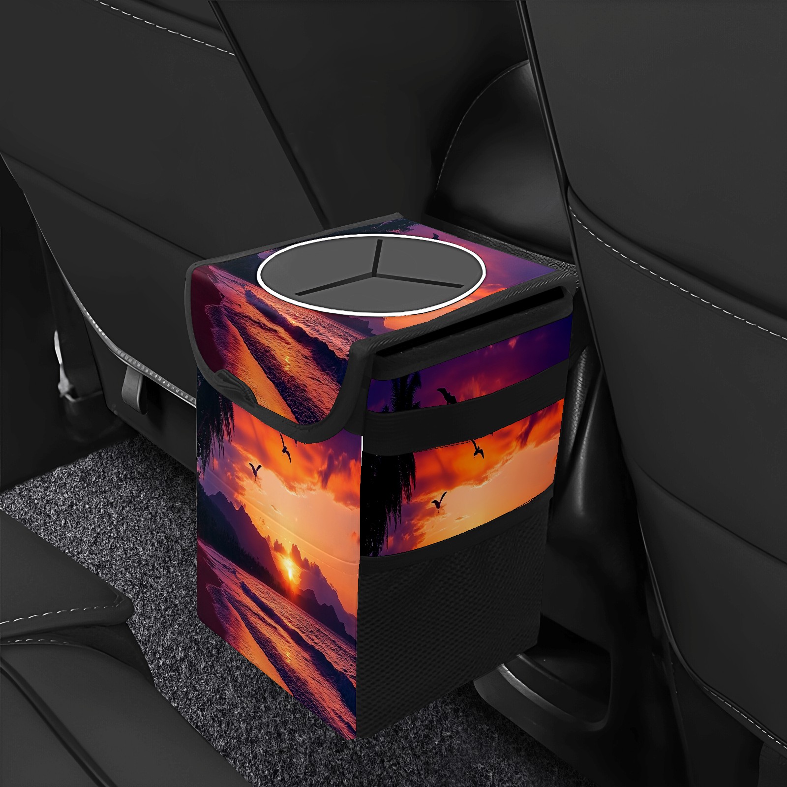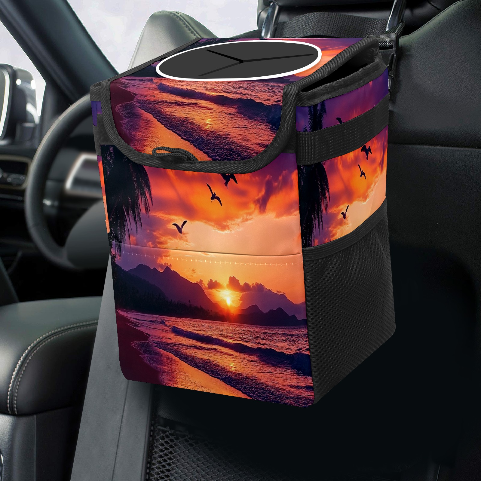 Car Trash Can with Lid, Small Portable Hanging Automotive Garbage Bin for Vehicles, Leakproof Waste Bag Container for SUV Truck Van Interior Auto Travel Road Trips(Sunset Seagulls Flying)