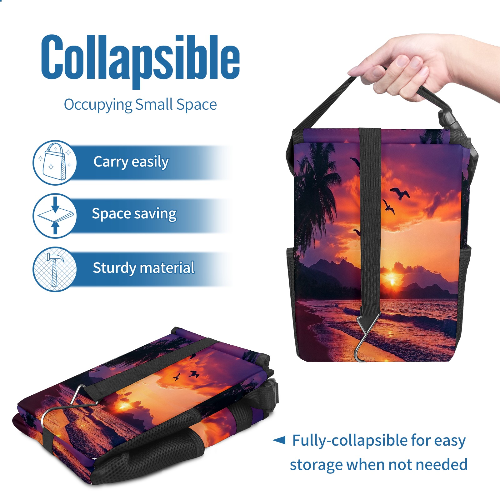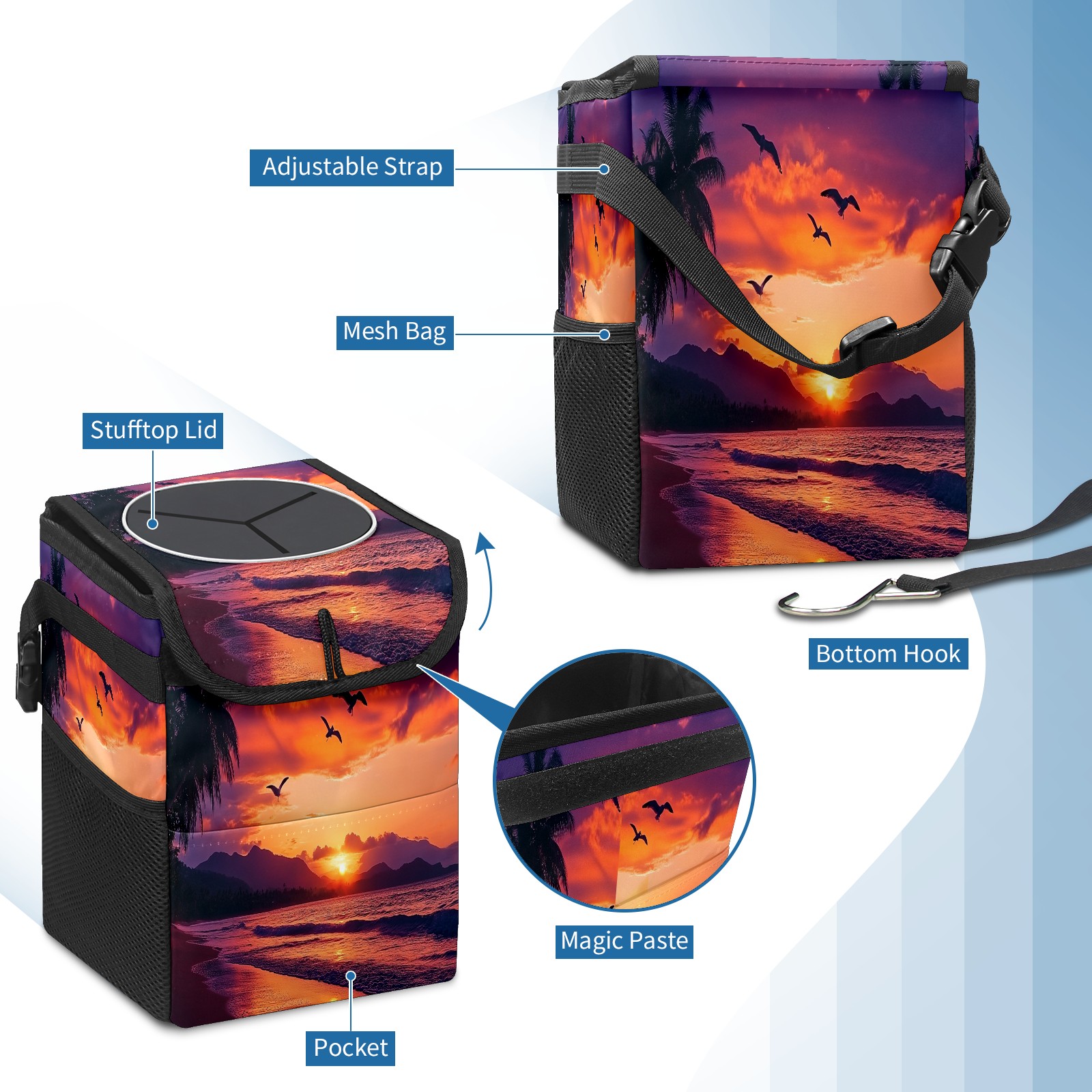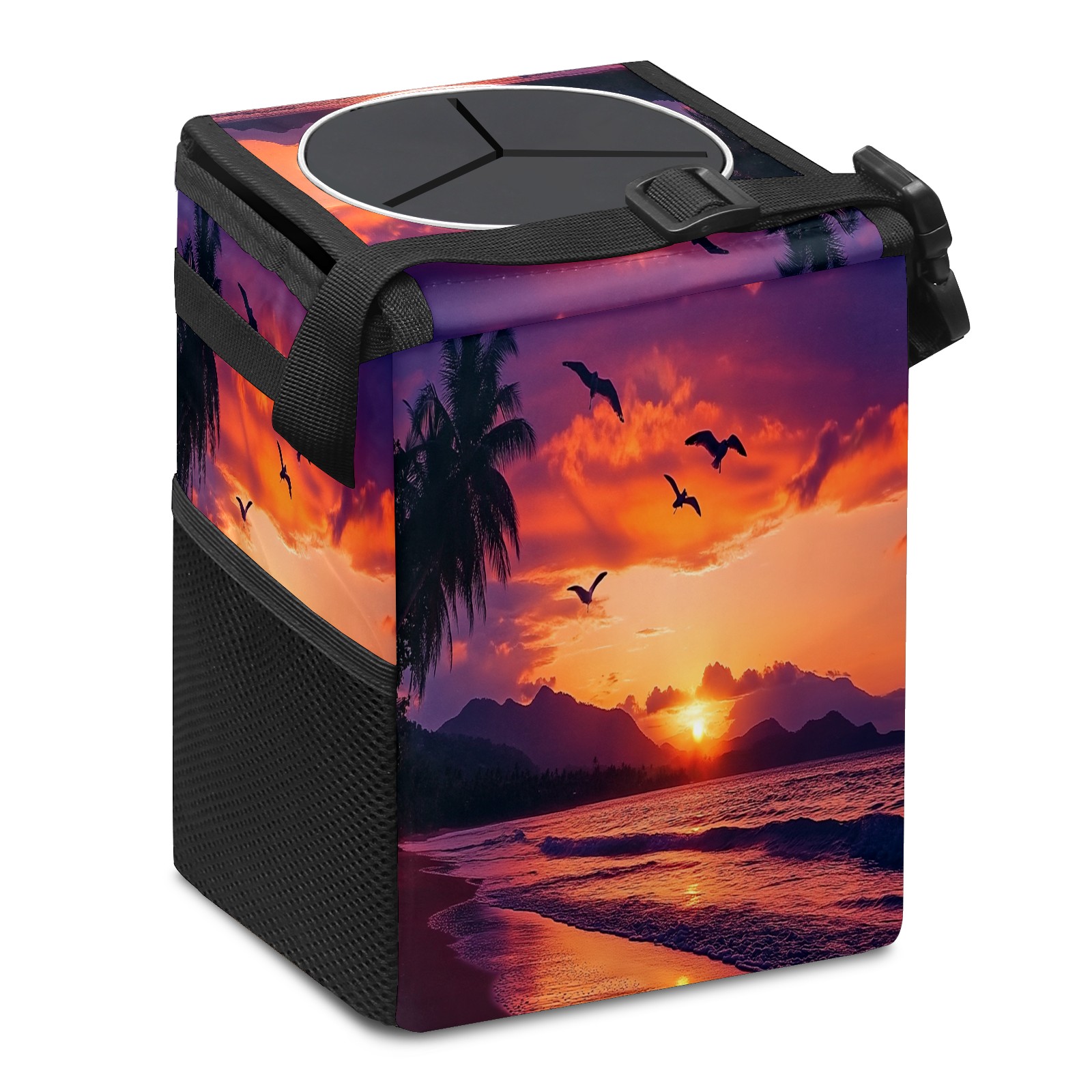 Car Trash Can with Lid, Small Portable Hanging Automotive Garbage Bin for Vehicles, Leakproof Waste Bag Container for SUV Truck Van Interior Auto Travel Road Trips(Sunset Seagulls Flying)