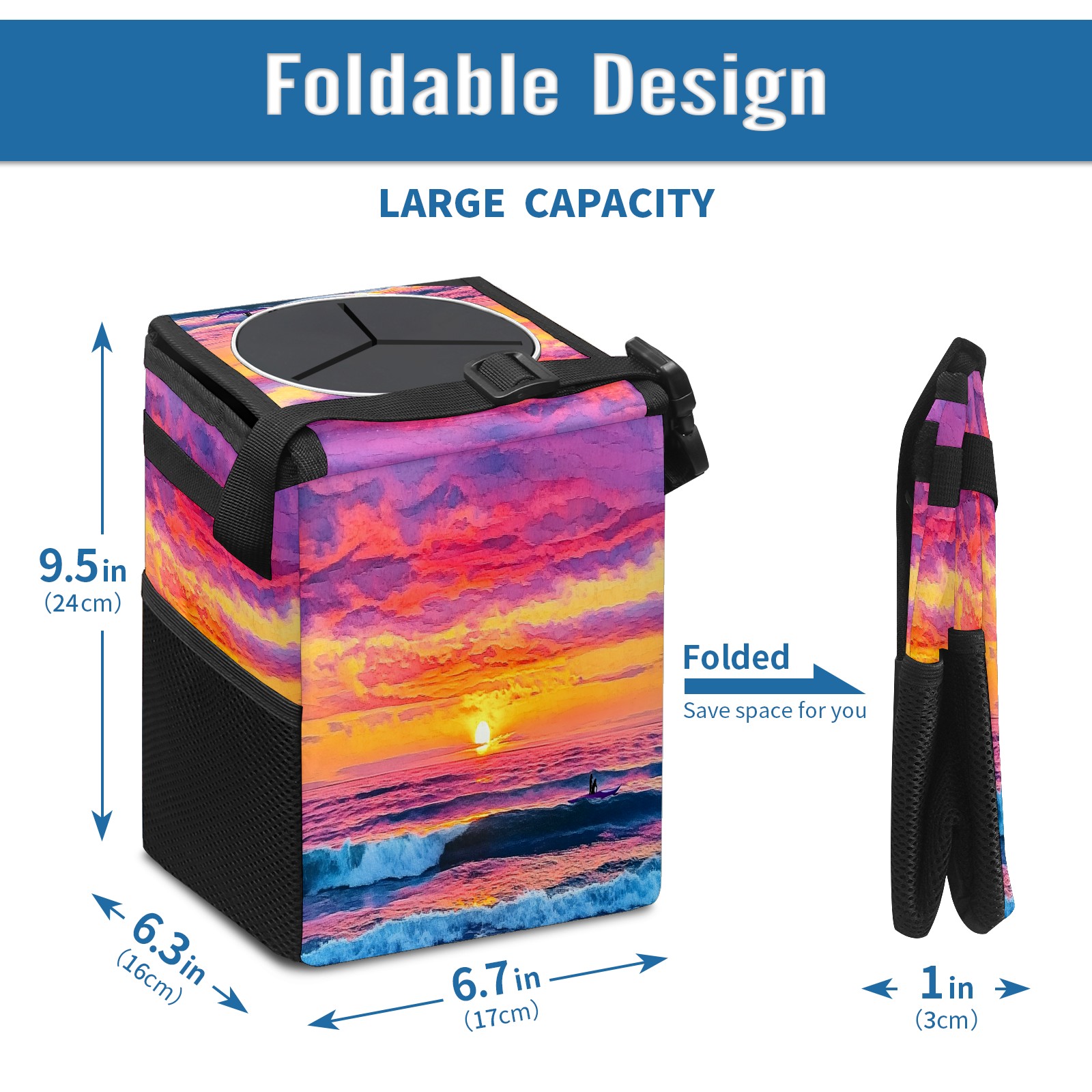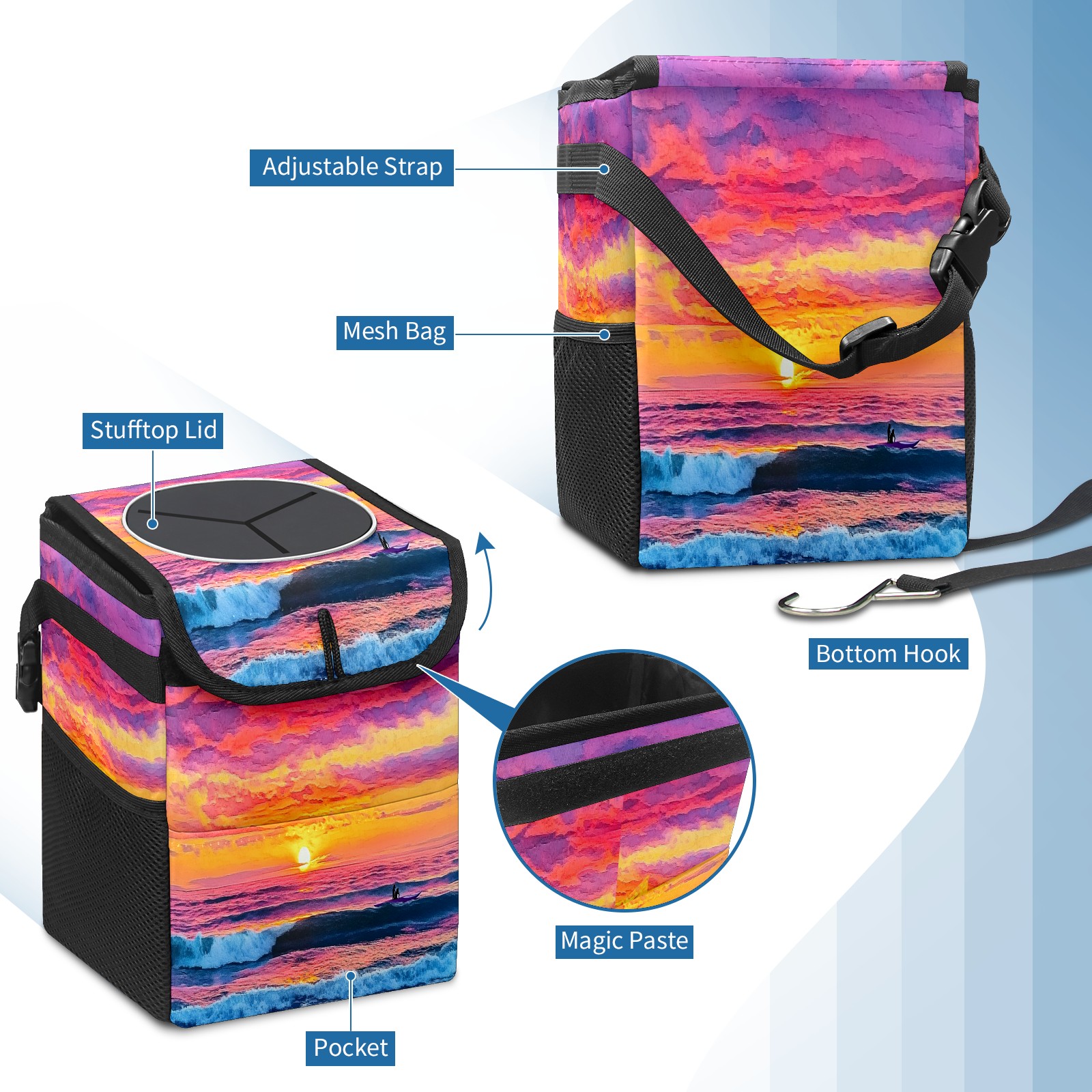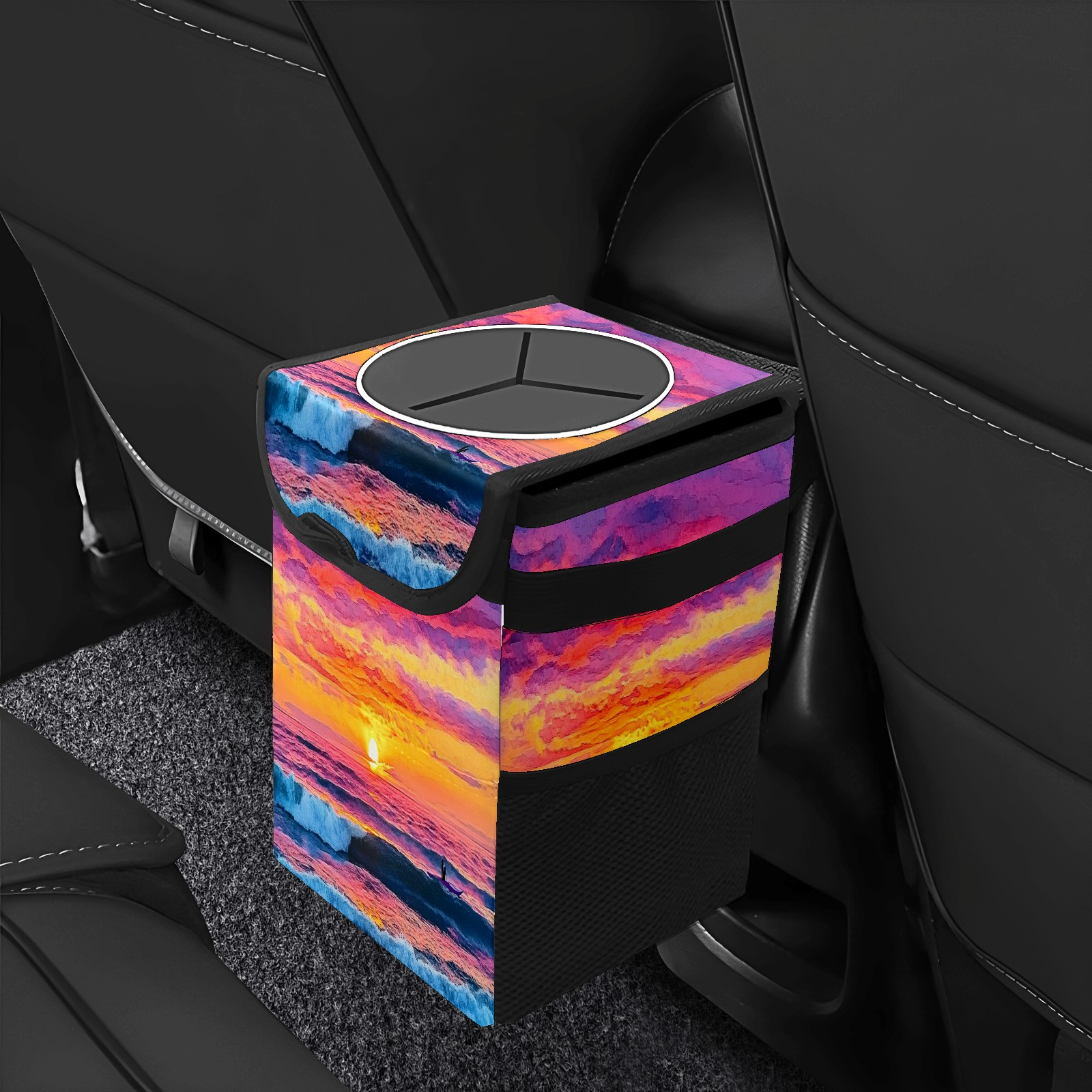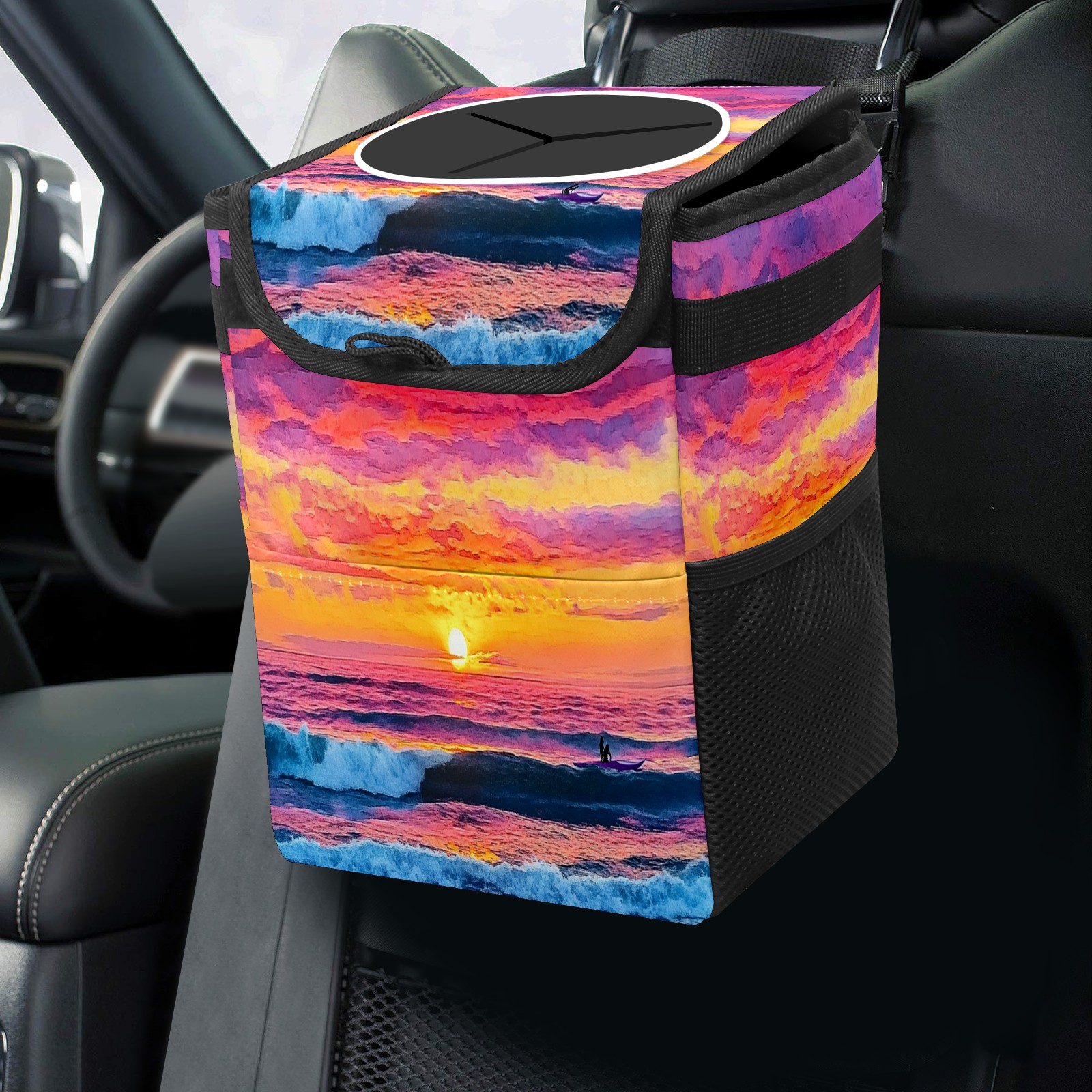 Car Trash Can with Lid, Small Portable Hanging Automotive Garbage Bin for Vehicles, Leakproof Waste Bag Container for SUV Truck Van Interior Auto Travel Road Trips(Orange Pink Sunset)