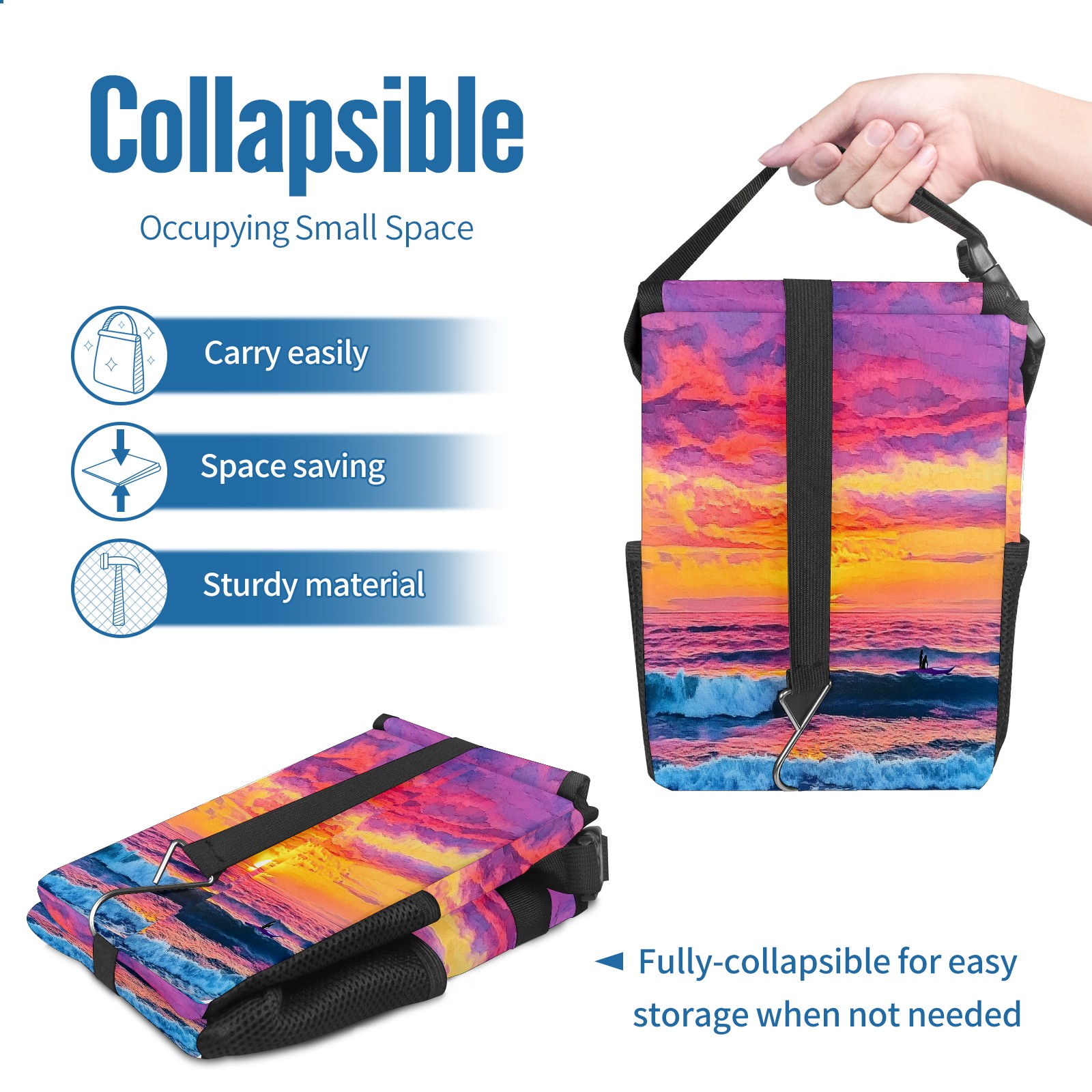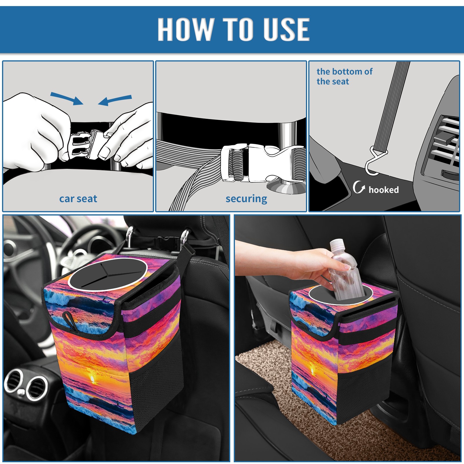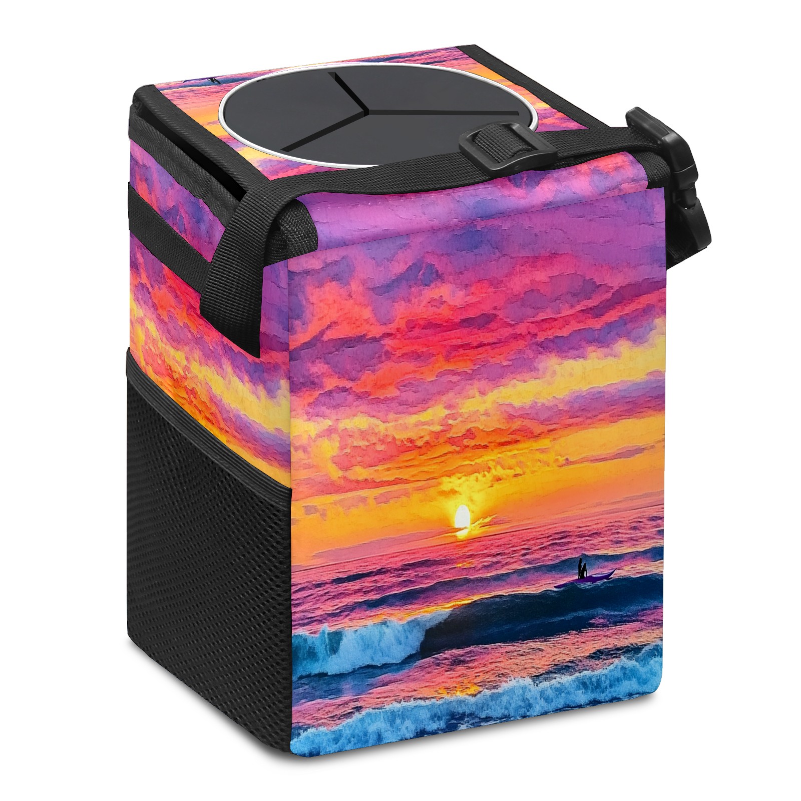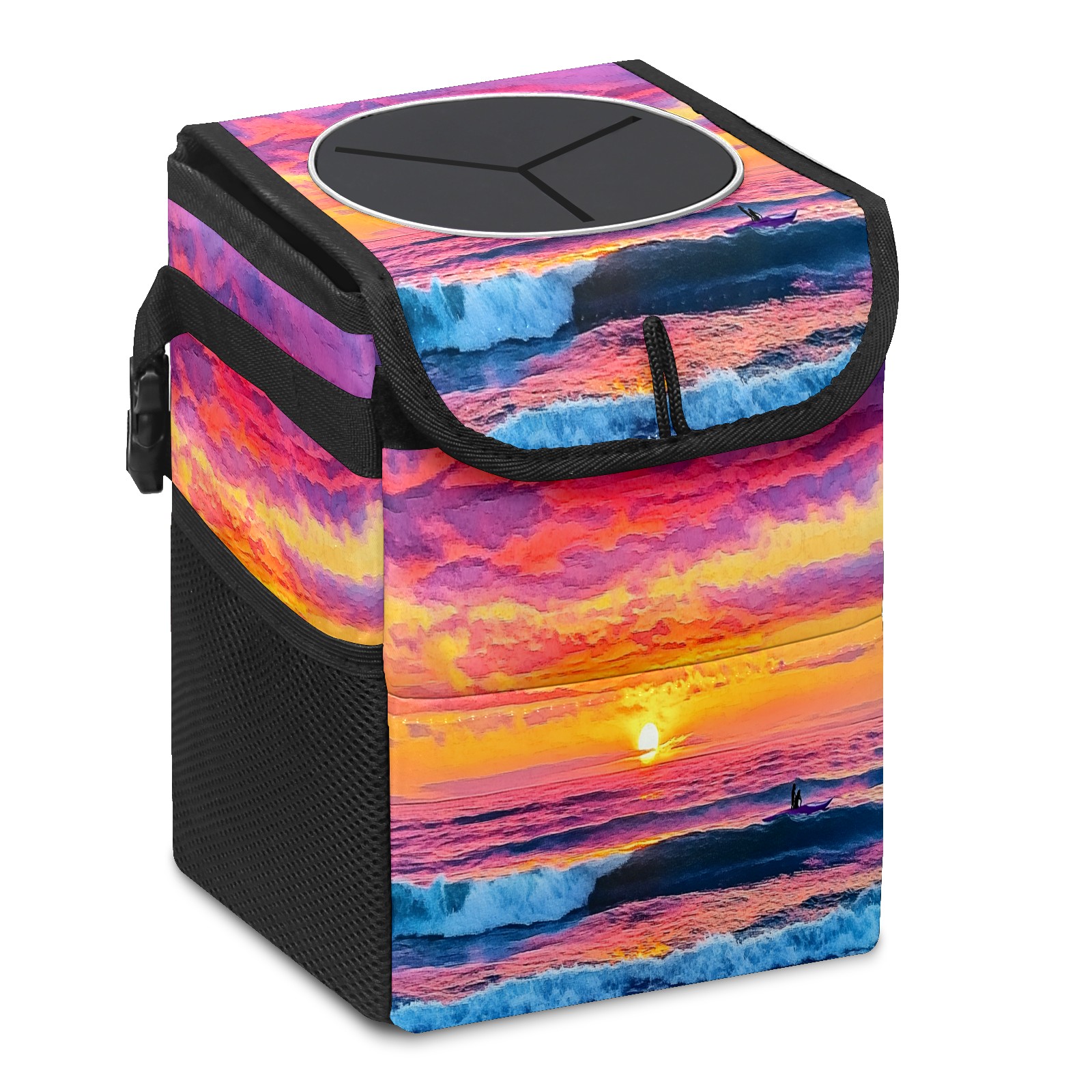 Car Trash Can with Lid, Small Portable Hanging Automotive Garbage Bin for Vehicles, Leakproof Waste Bag Container for SUV Truck Van Interior Auto Travel Road Trips(Orange Pink Sunset)