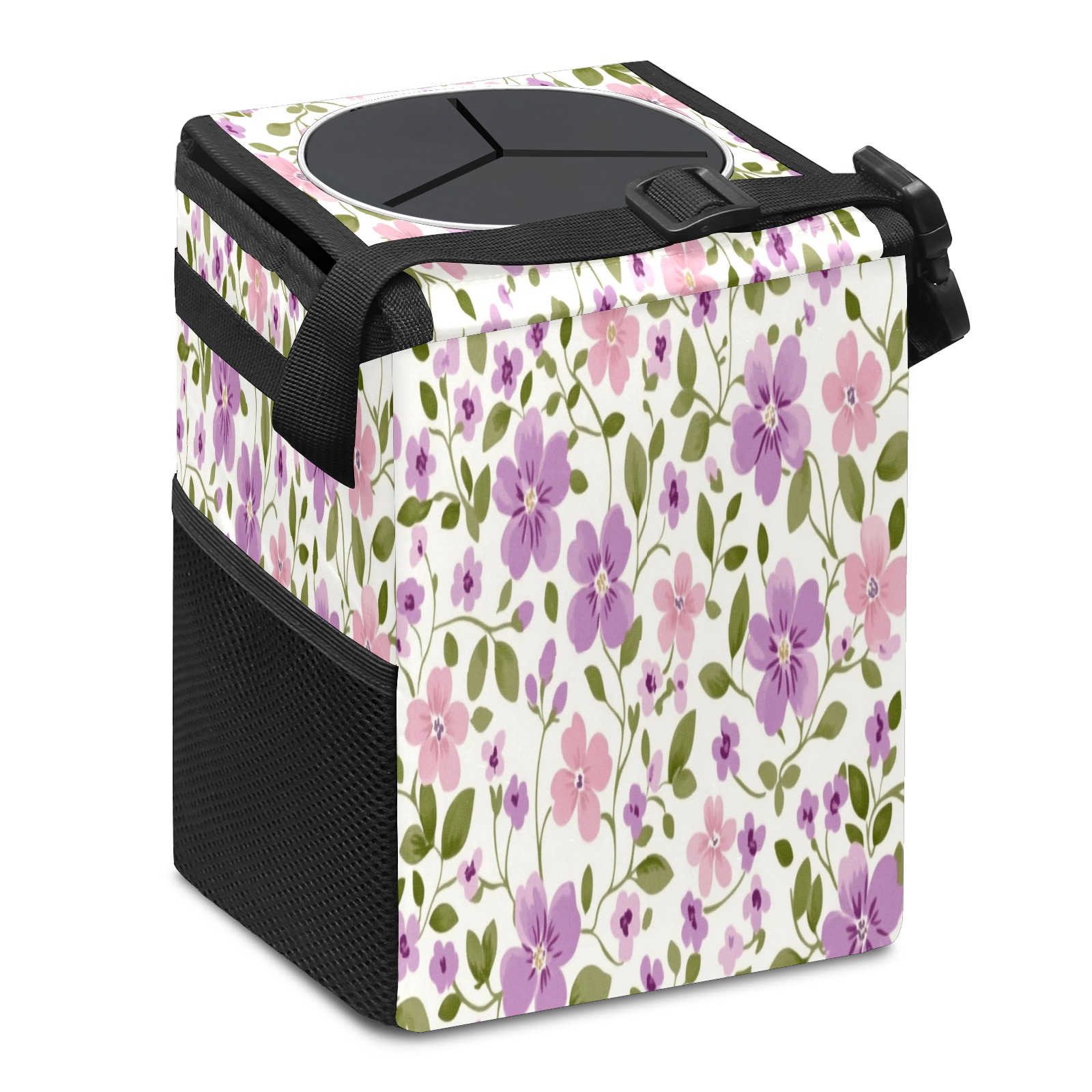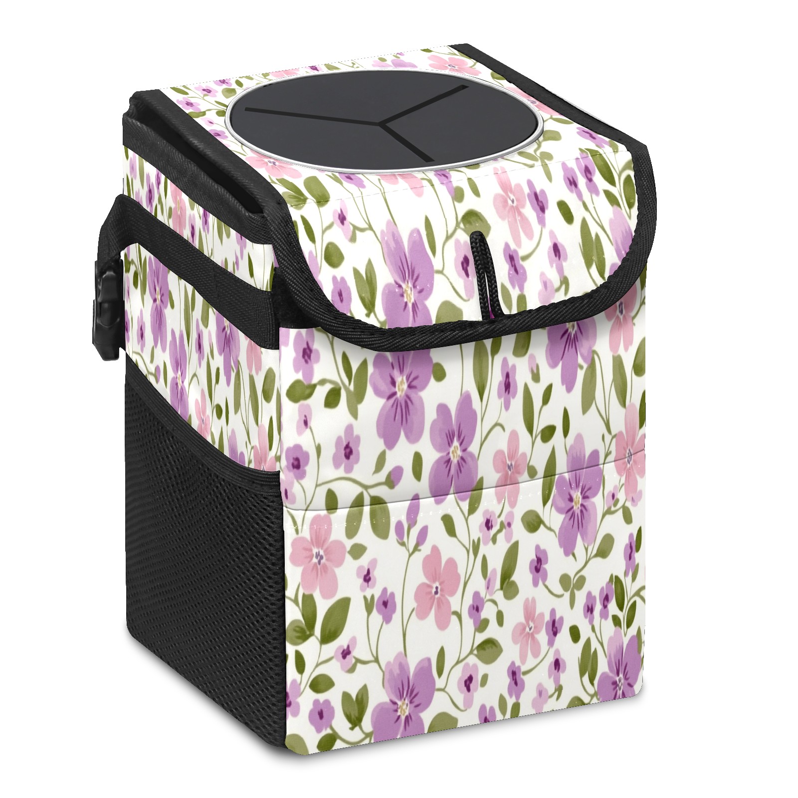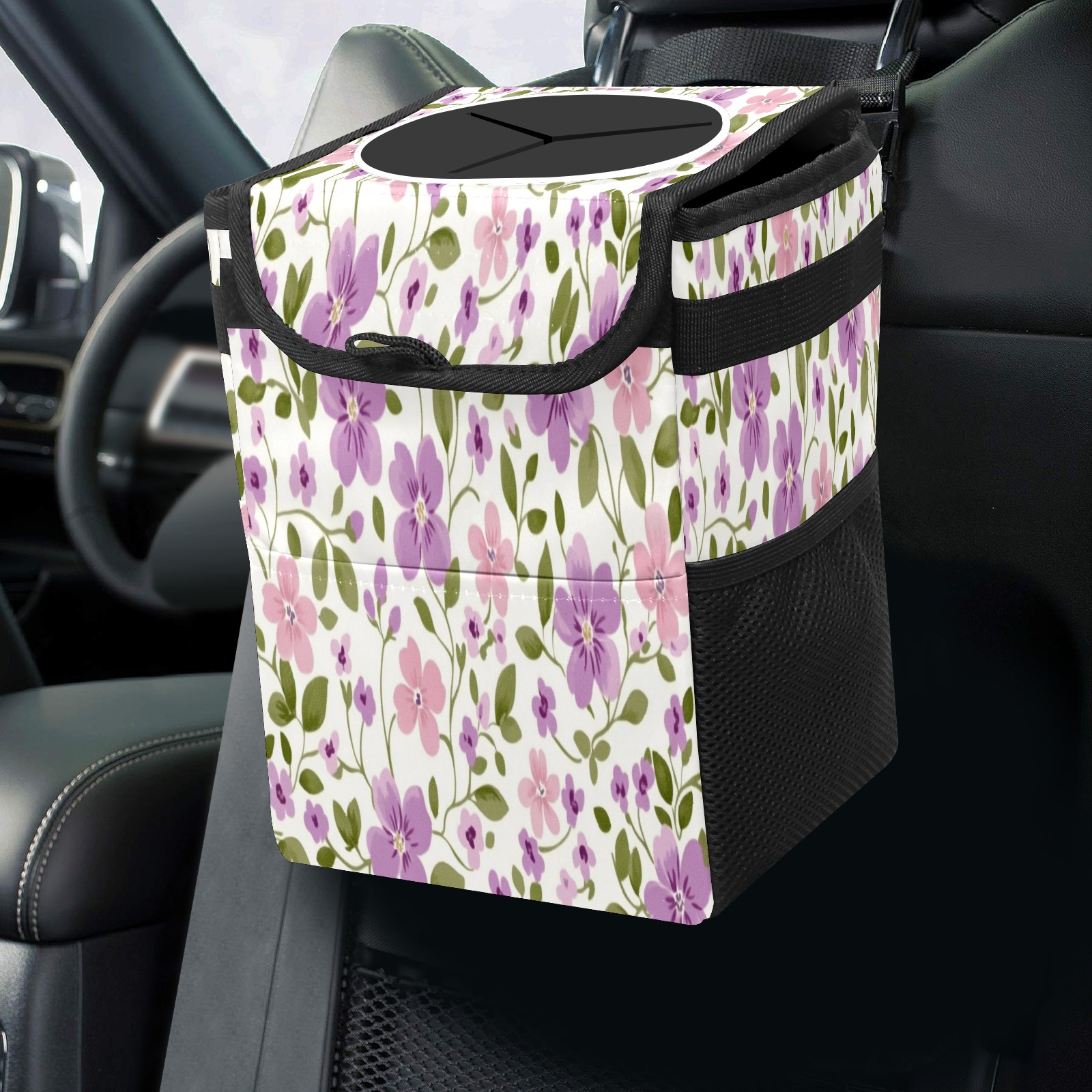 Car Trash Can with Lid, Small Portable Hanging Automotive Garbage Bin for Vehicles, Leakproof Waste Bag Container for SUV Truck Van Interior Auto Travel Road Trips(Small Purple Flowers)