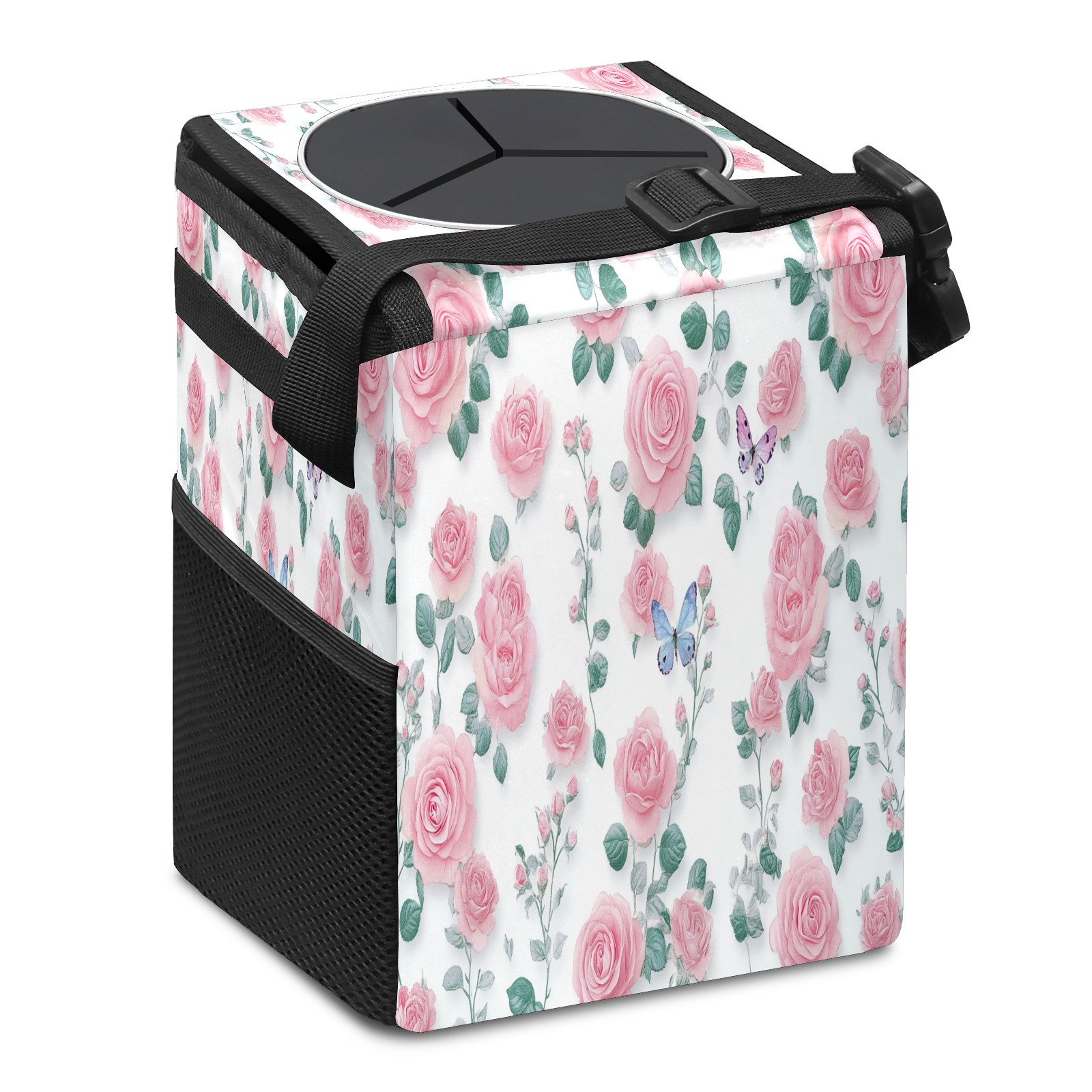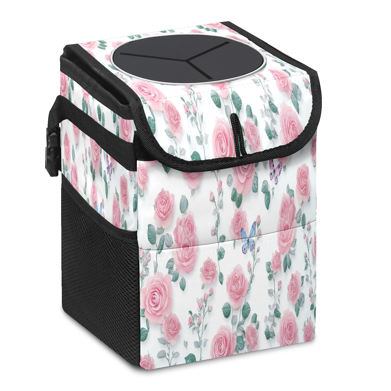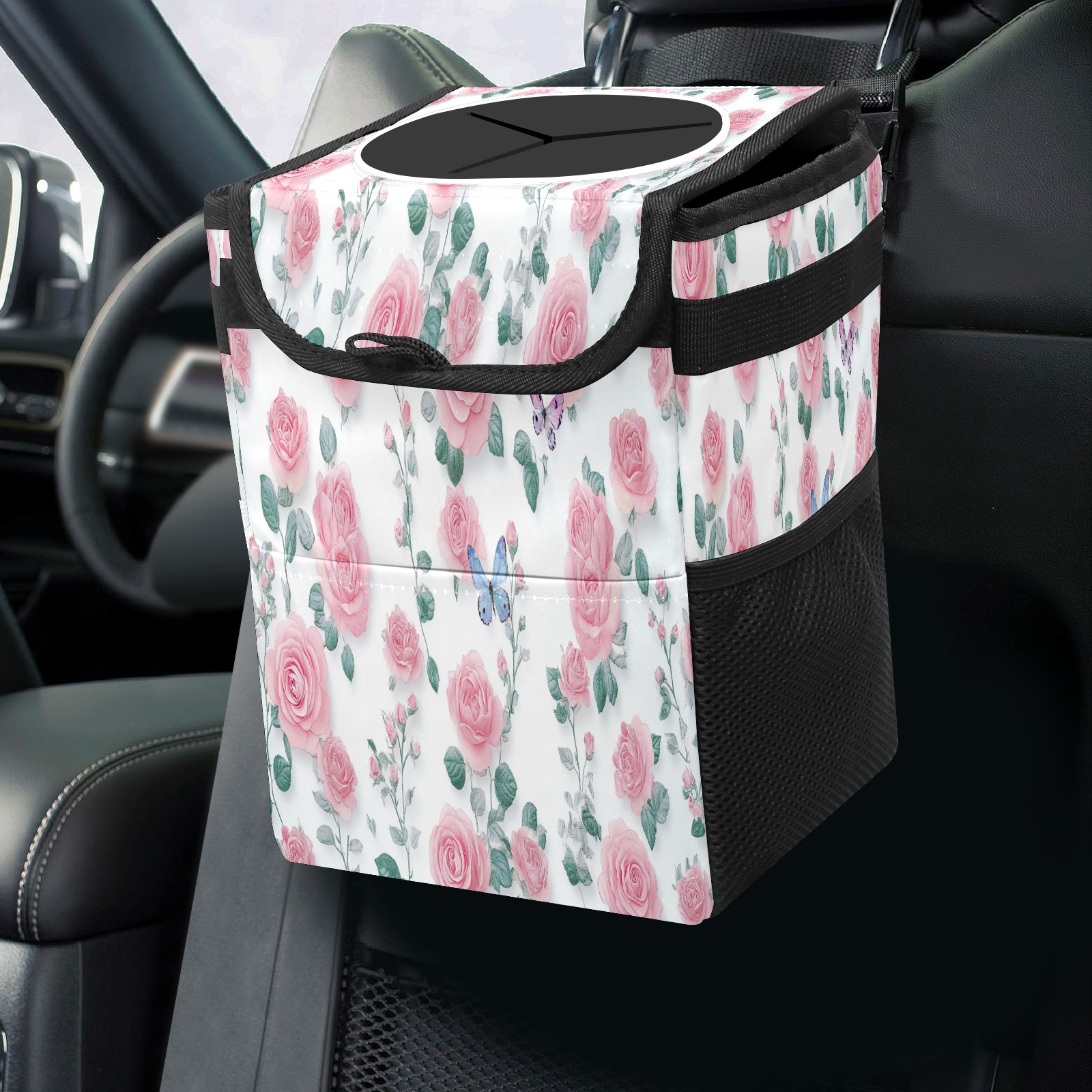Car Trash Can with Lid, Small Portable Hanging Automotive Garbage Bin for Vehicles, Leakproof Waste Bag Container for SUV Truck Van Interior Auto Travel Road Trips(Pink Green Small Roses)