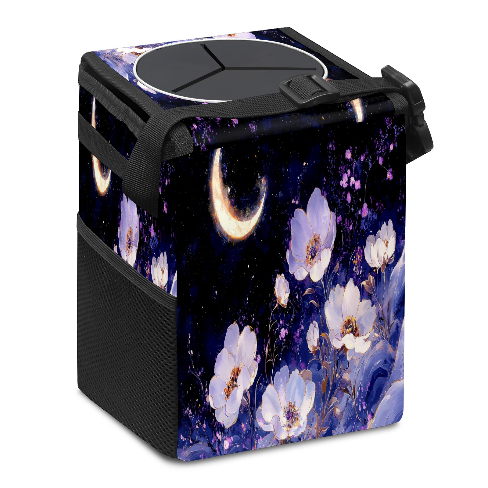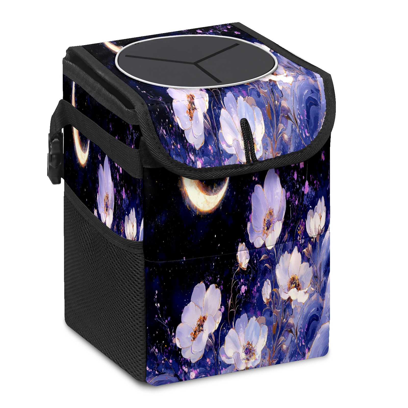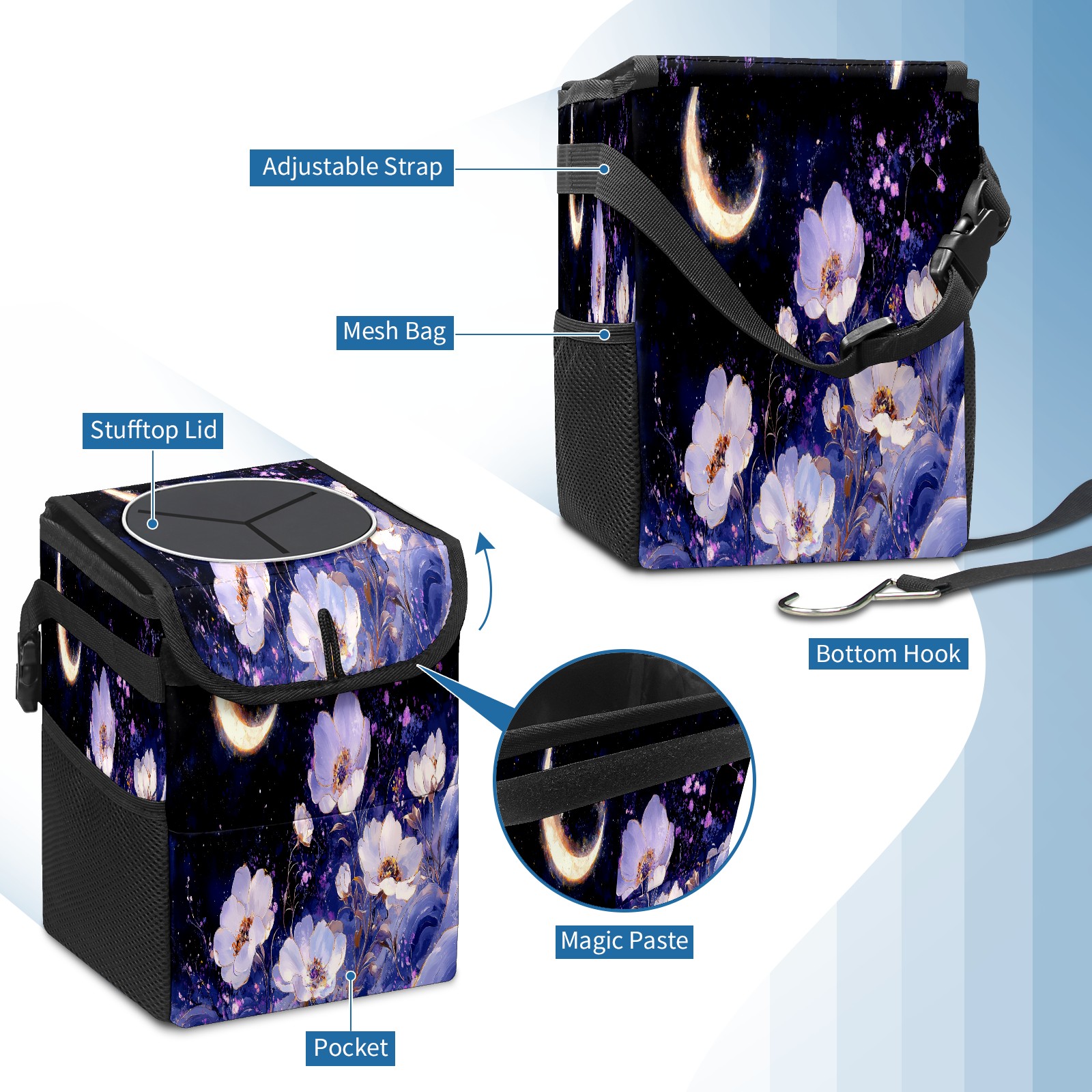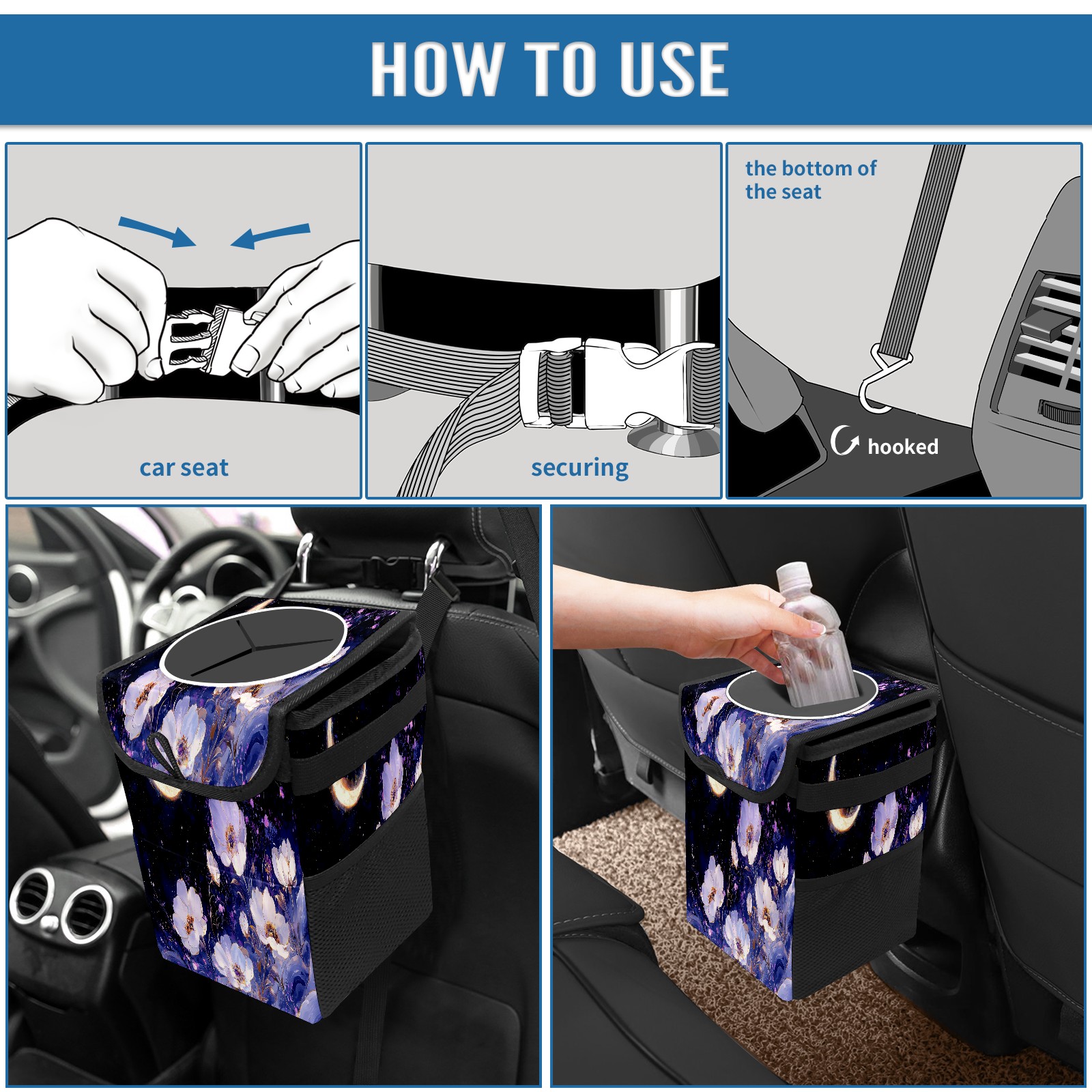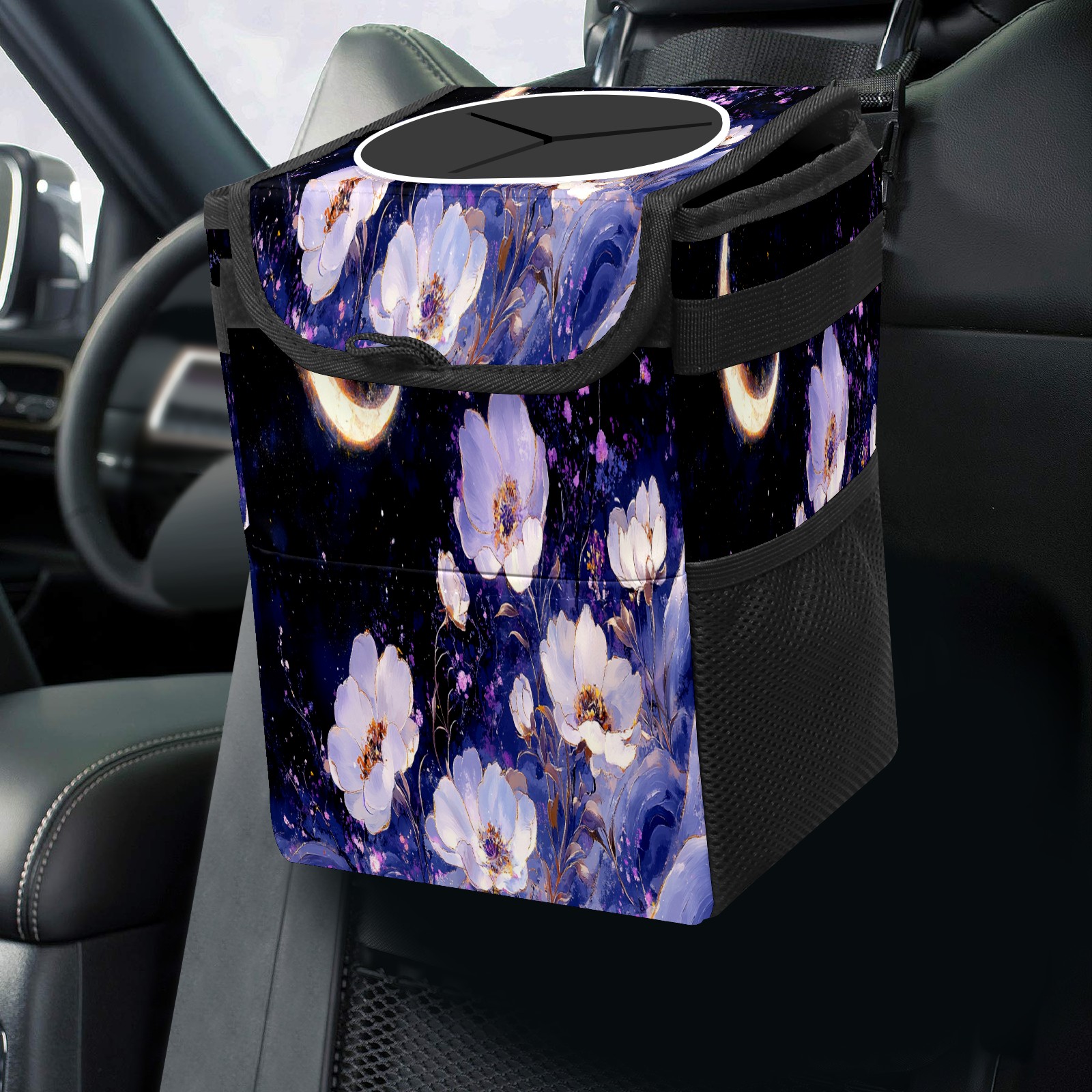 Car Trash Can with Lid, Small Portable Hanging Automotive Garbage Bin for Vehicles, Leakproof Waste Bag Container for SUV Truck Van Interior Auto Travel Road Trips(White And Purple Floral)