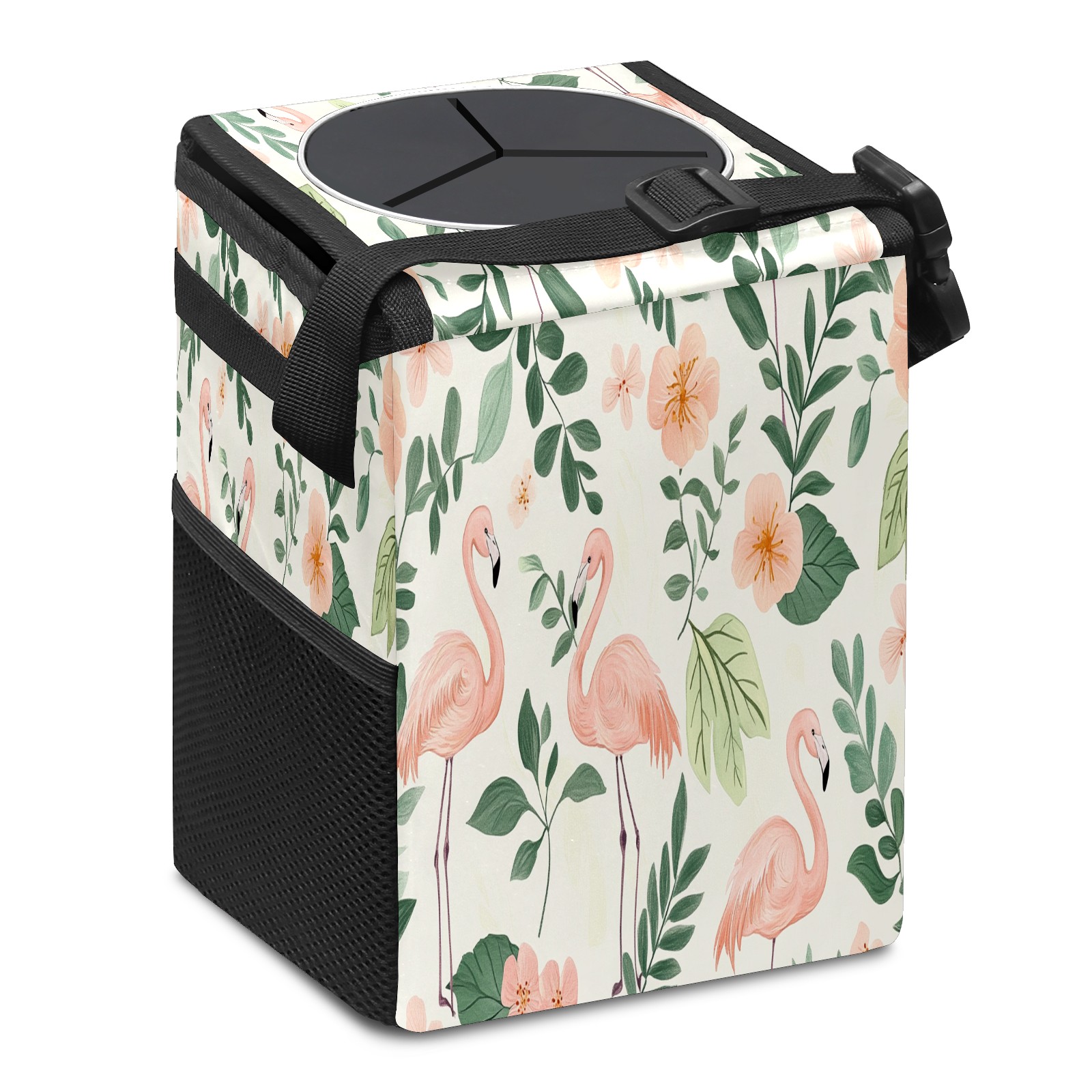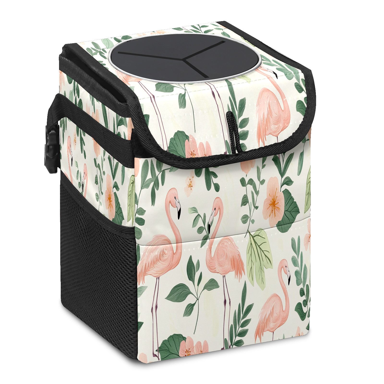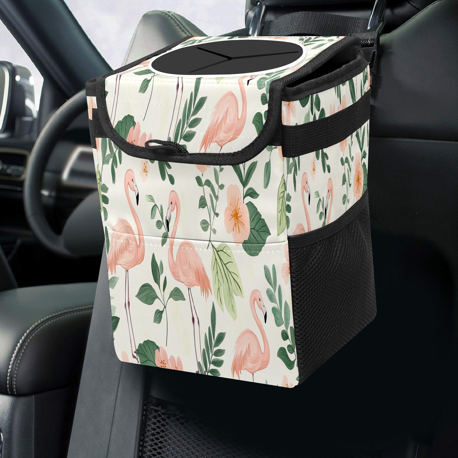 Car Trash Can with Lid, Small Portable Hanging Automotive Garbage Bin for Vehicles, Leakproof Waste Bag Container for SUV Truck Van Interior Auto Travel Road Trips(White Green Tropical Leaves Flamingo)
