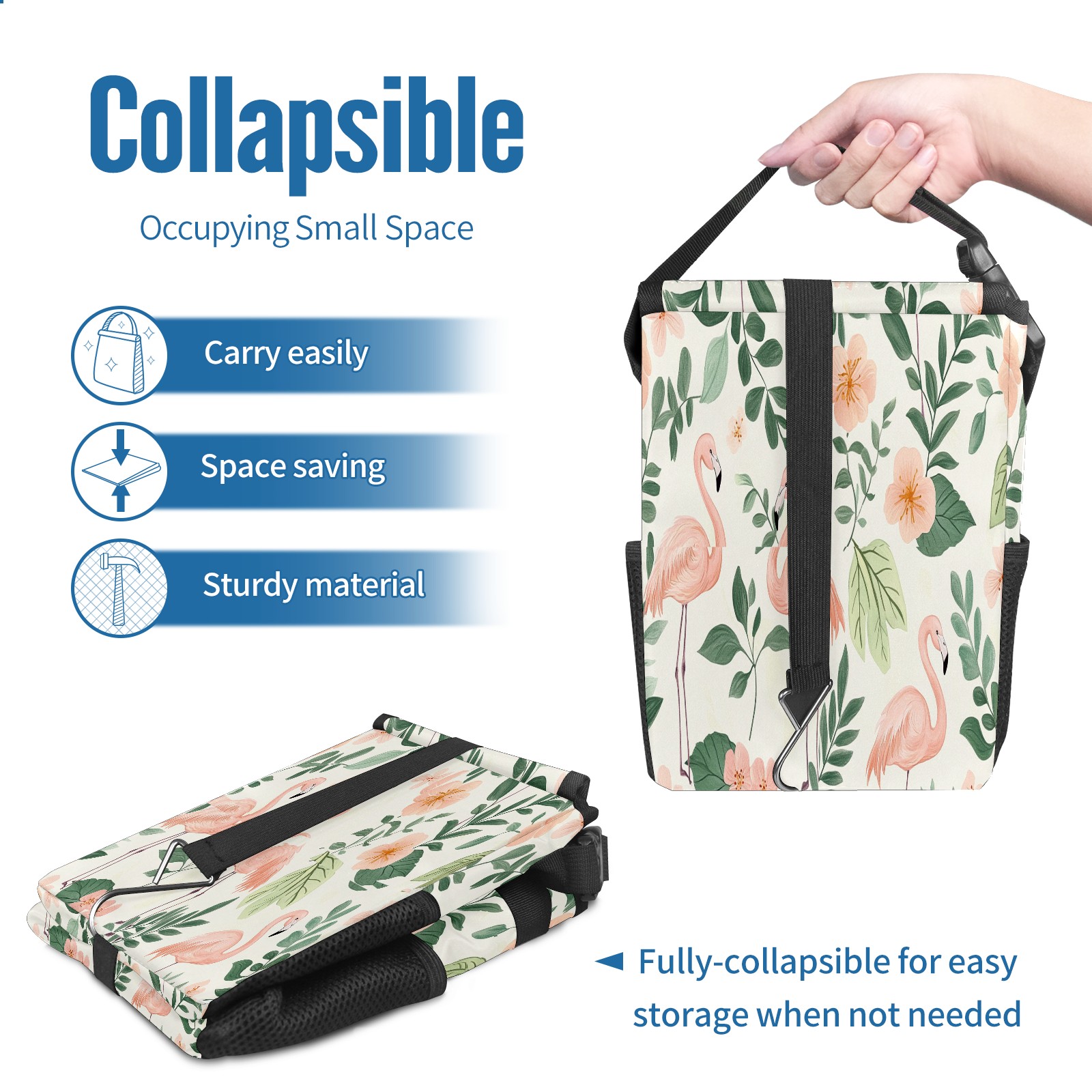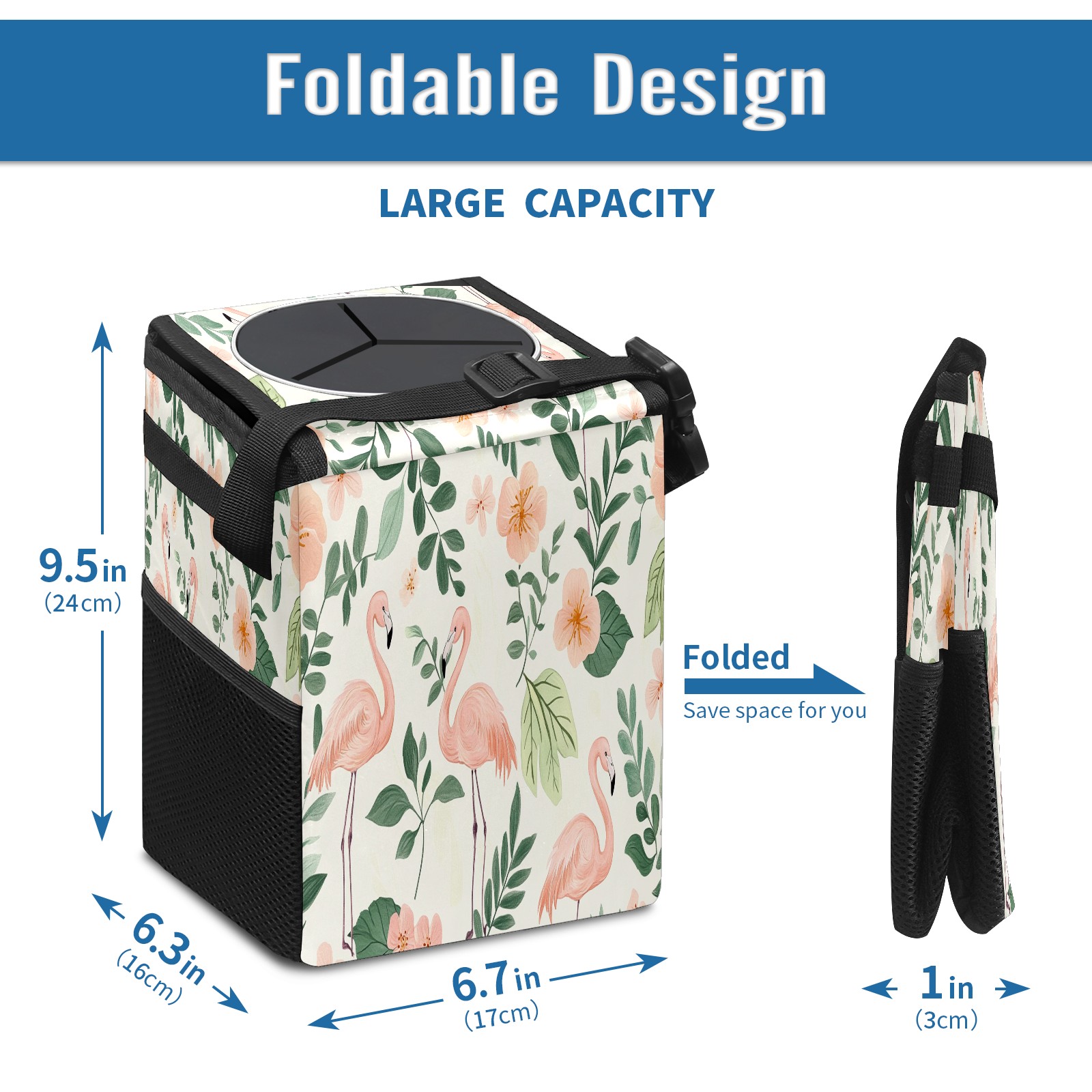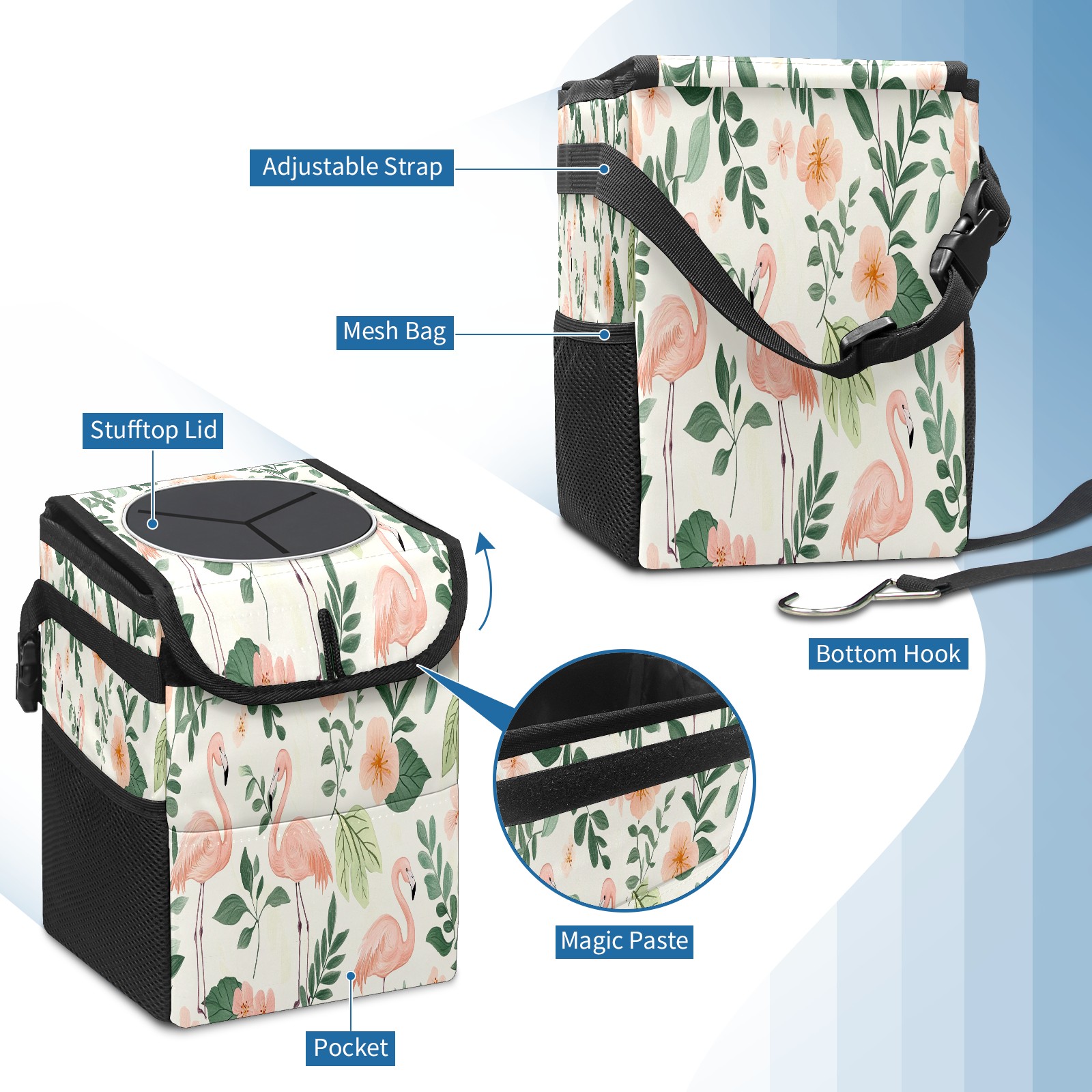 Car Trash Can with Lid, Small Portable Hanging Automotive Garbage Bin for Vehicles, Leakproof Waste Bag Container for SUV Truck Van Interior Auto Travel Road Trips(White Green Tropical Leaves Flamingo)