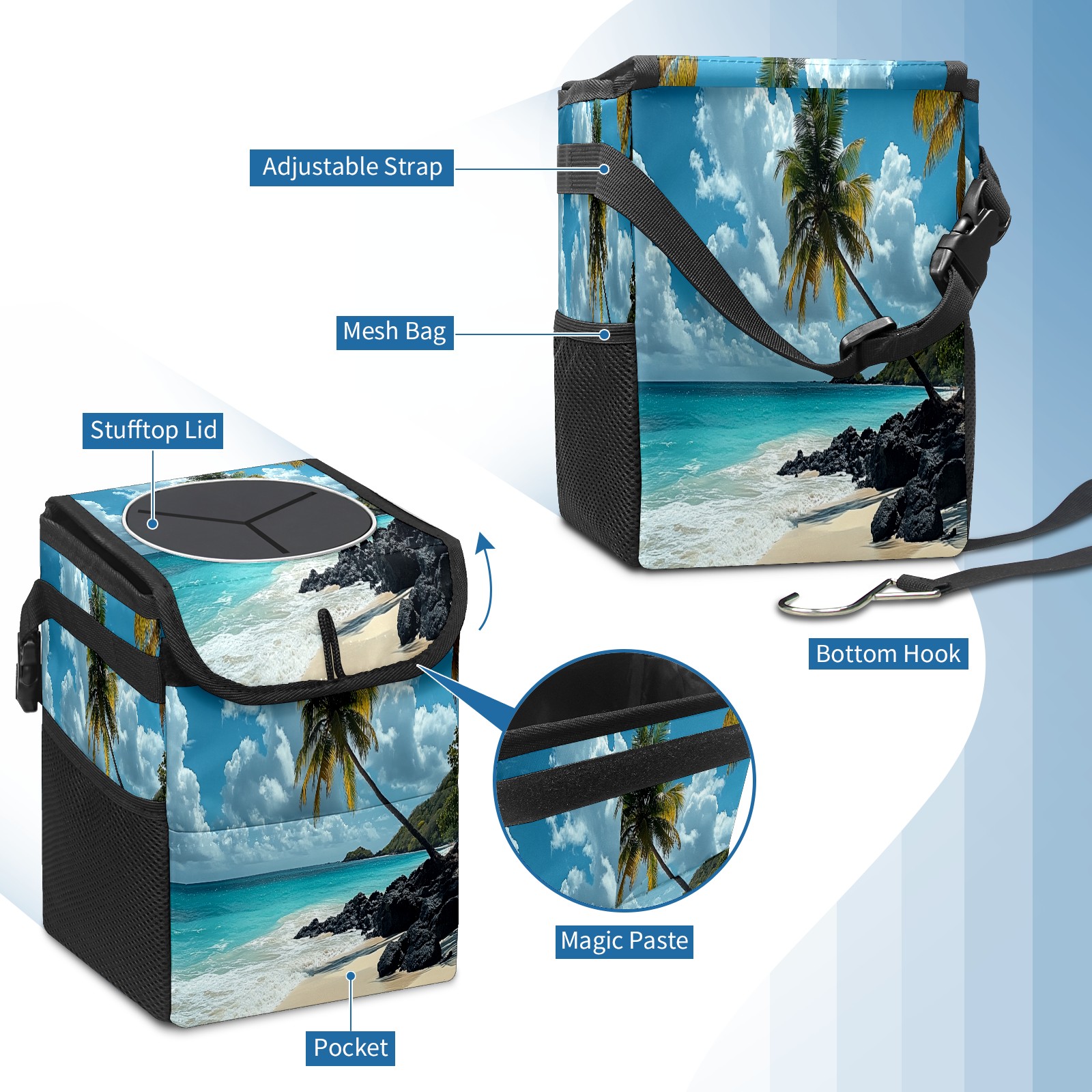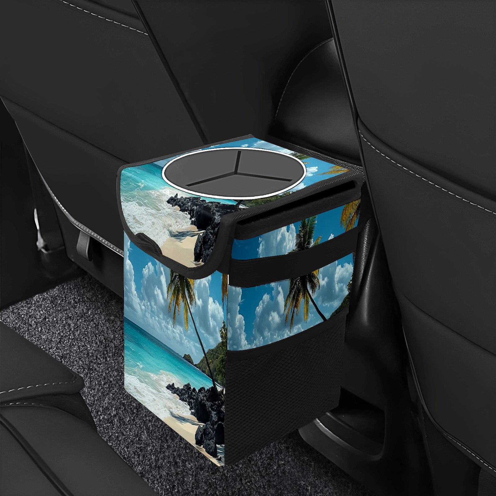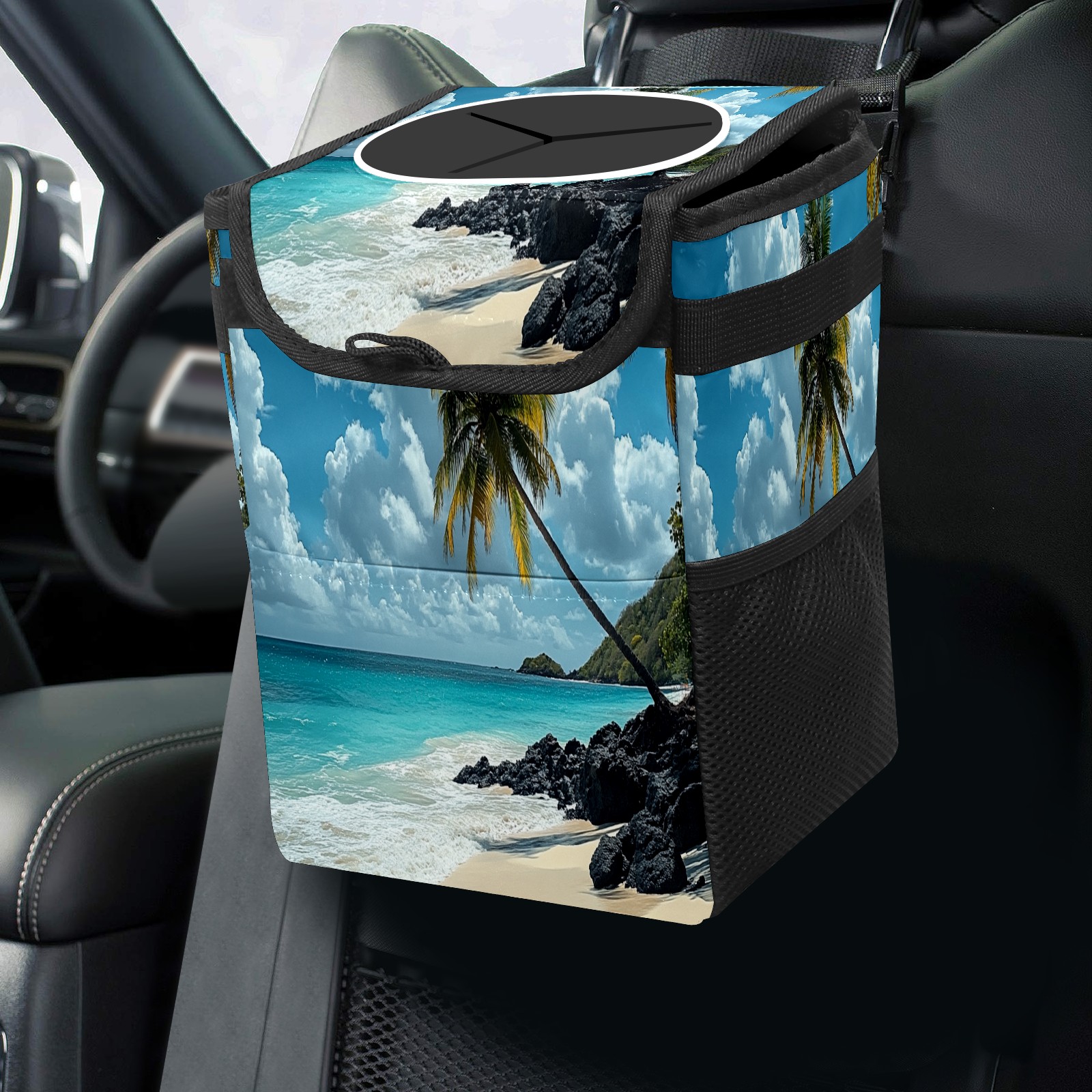 Car Trash Can with Lid, Small Portable Hanging Automotive Garbage Bin for Vehicles, Leakproof Waste Bag Container for SUV Truck Van Interior Auto Travel Road Trips(Beautiful Caribbean Beach)