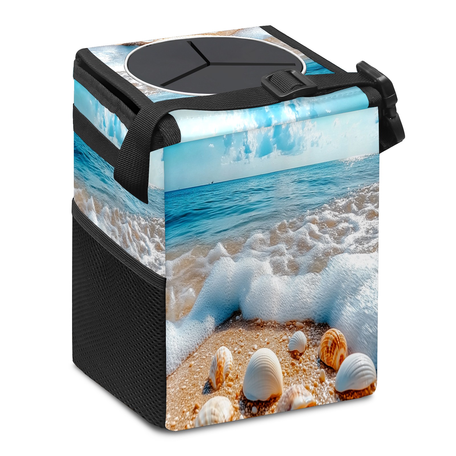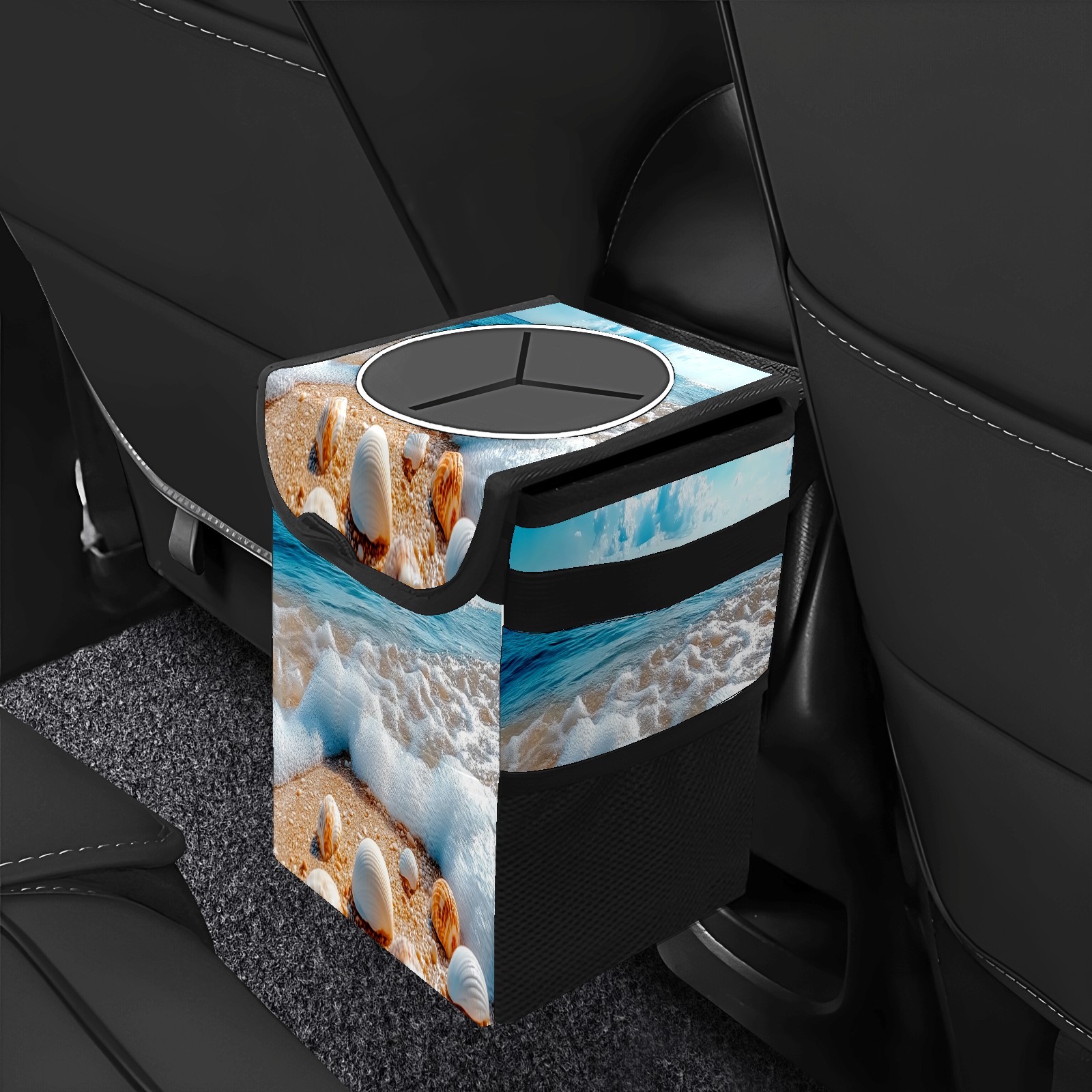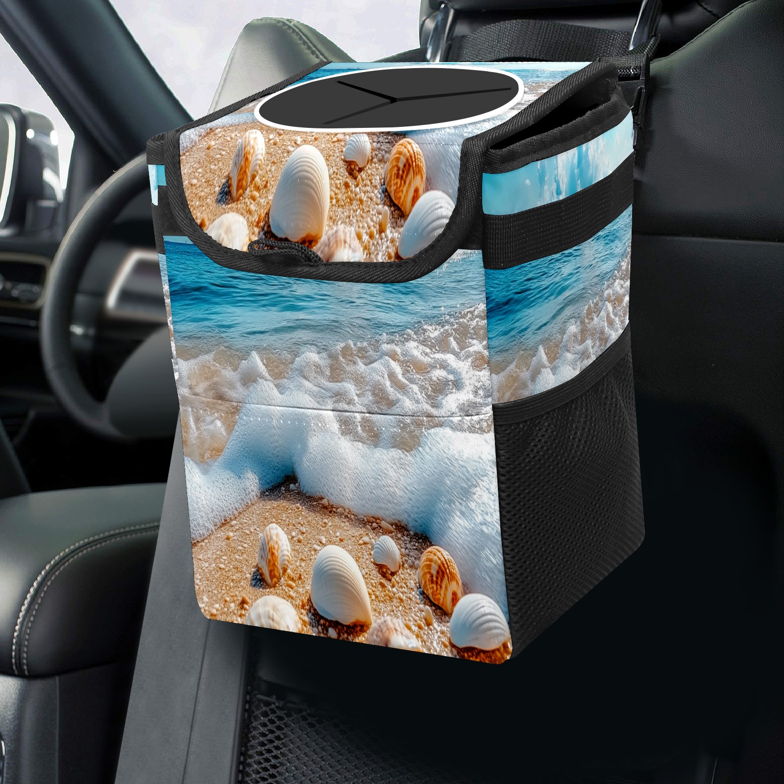 Car Trash Can with Lid, Small Portable Hanging Automotive Garbage Bin for Vehicles, Leakproof Waste Bag Container for SUV Truck Van Interior Auto Travel Road Trips(Beach With Shells Waves)
