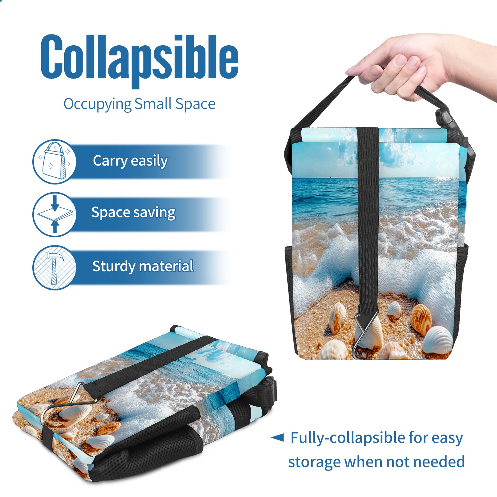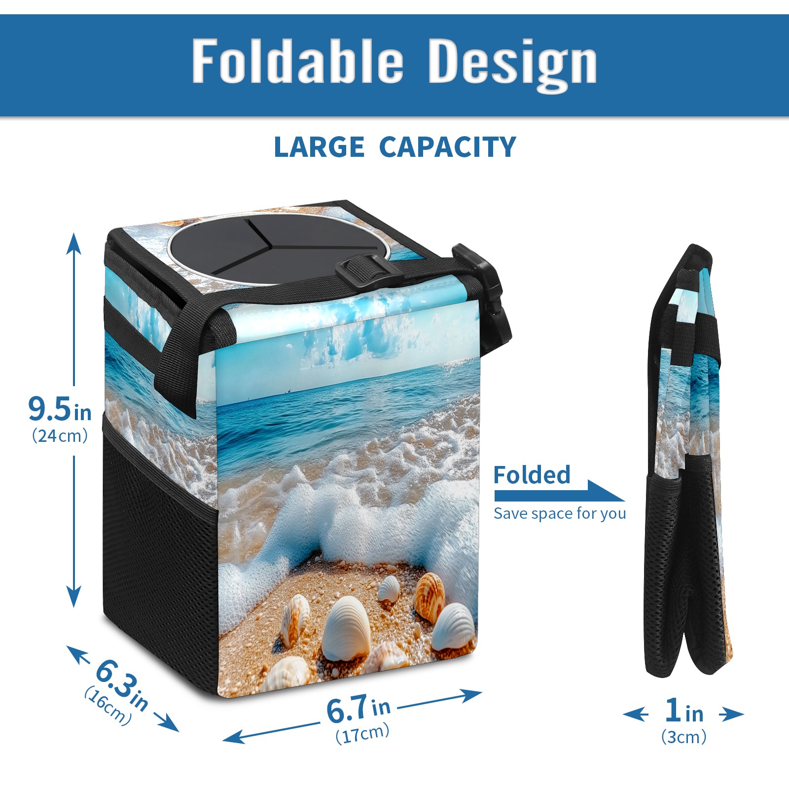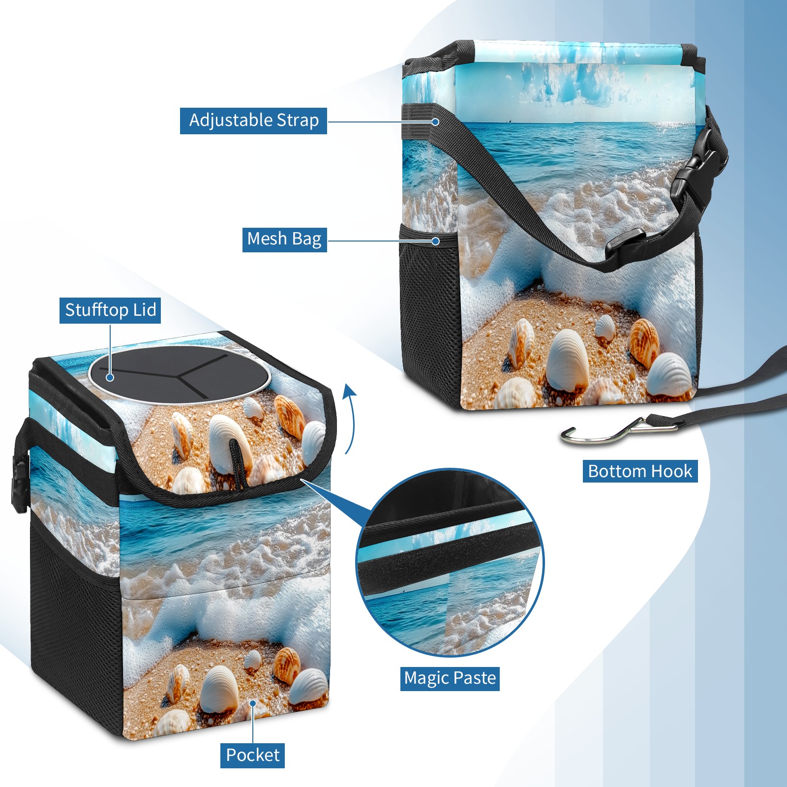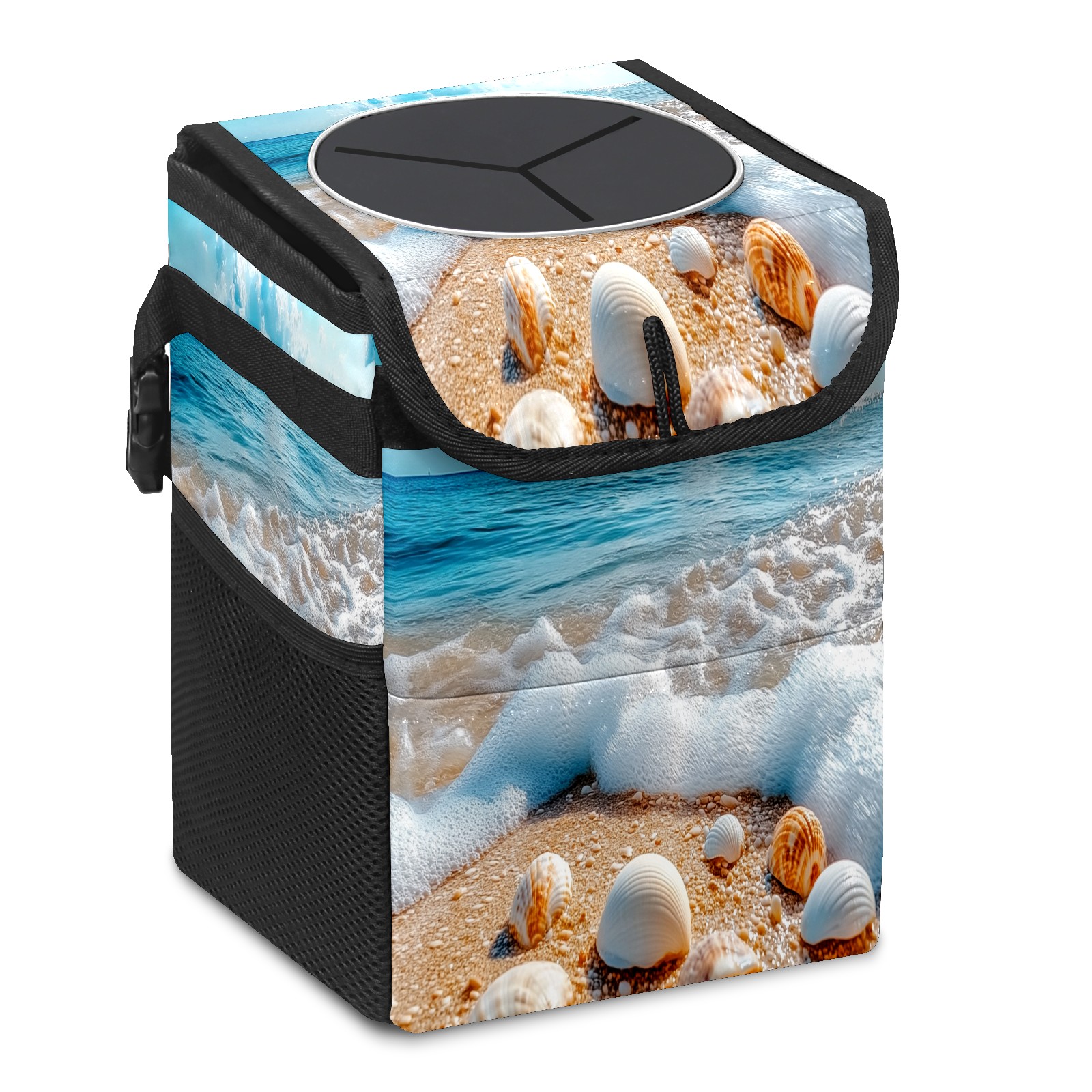 Car Trash Can with Lid, Small Portable Hanging Automotive Garbage Bin for Vehicles, Leakproof Waste Bag Container for SUV Truck Van Interior Auto Travel Road Trips(Beach With Shells Waves)
