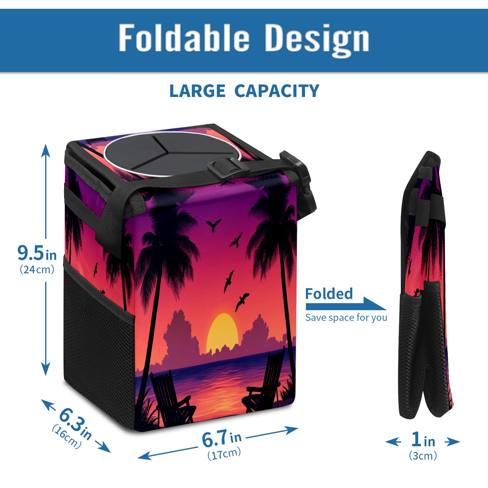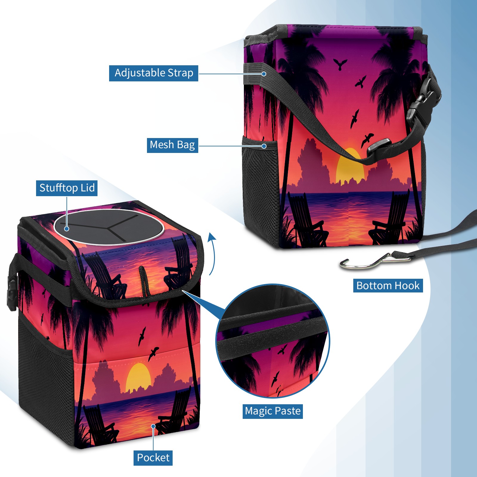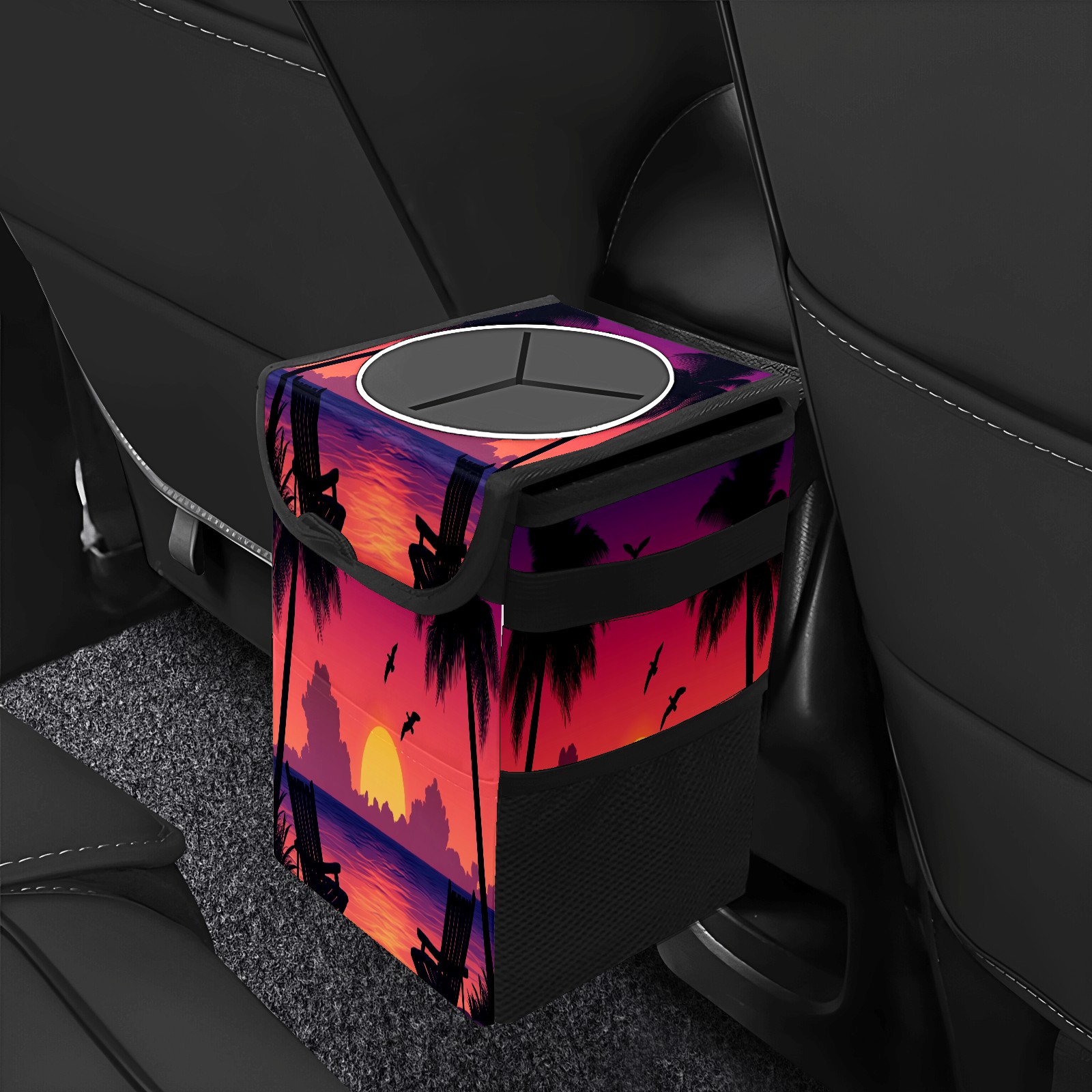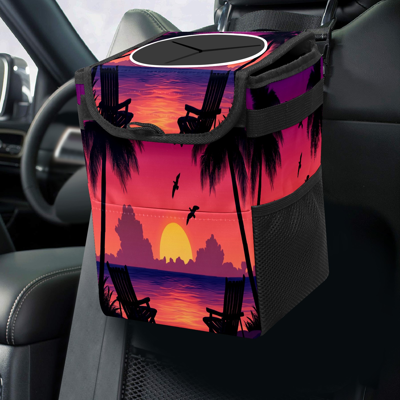 Car Trash Can with Lid, Small Portable Hanging Automotive Garbage Bin for Vehicles, Leakproof Waste Bag Container for SUV Truck Van Interior Auto Travel Road Trips(Purple Sunset Seagull)