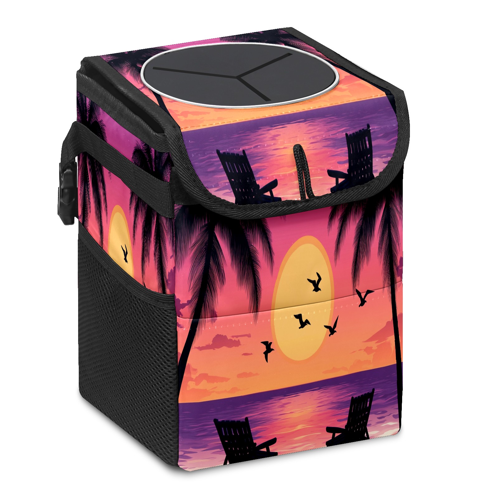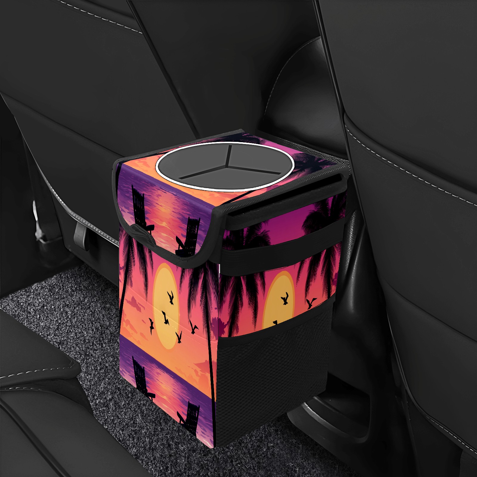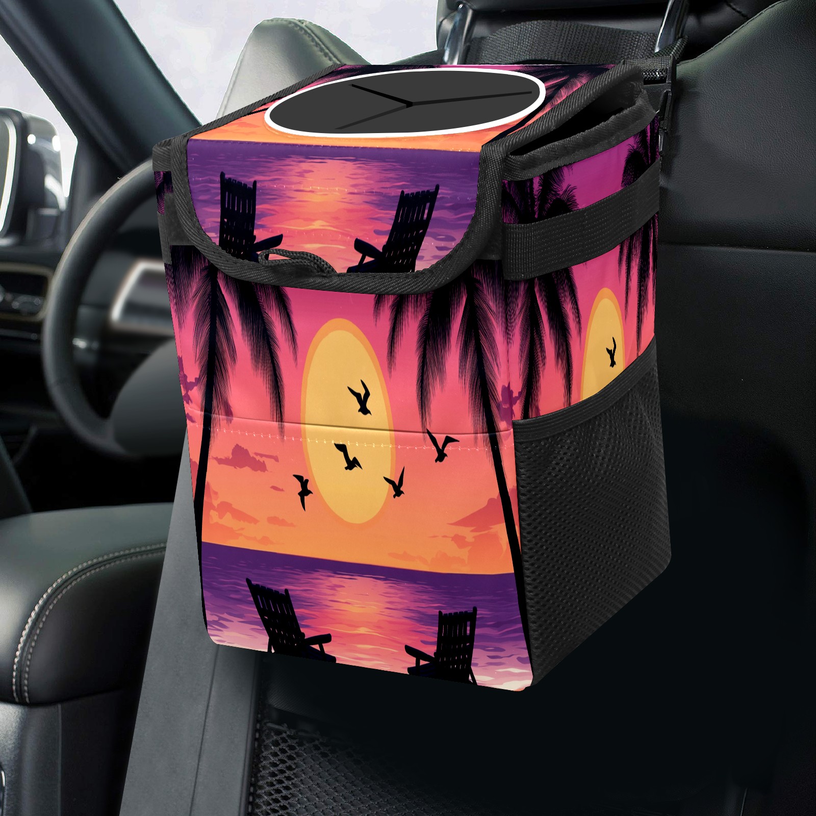 Car Trash Can with Lid, Small Portable Hanging Automotive Garbage Bin for Vehicles, Leakproof Waste Bag Container for SUV Truck Van Interior Auto Travel Road Trips(Purple Orange Sunset Seagull)