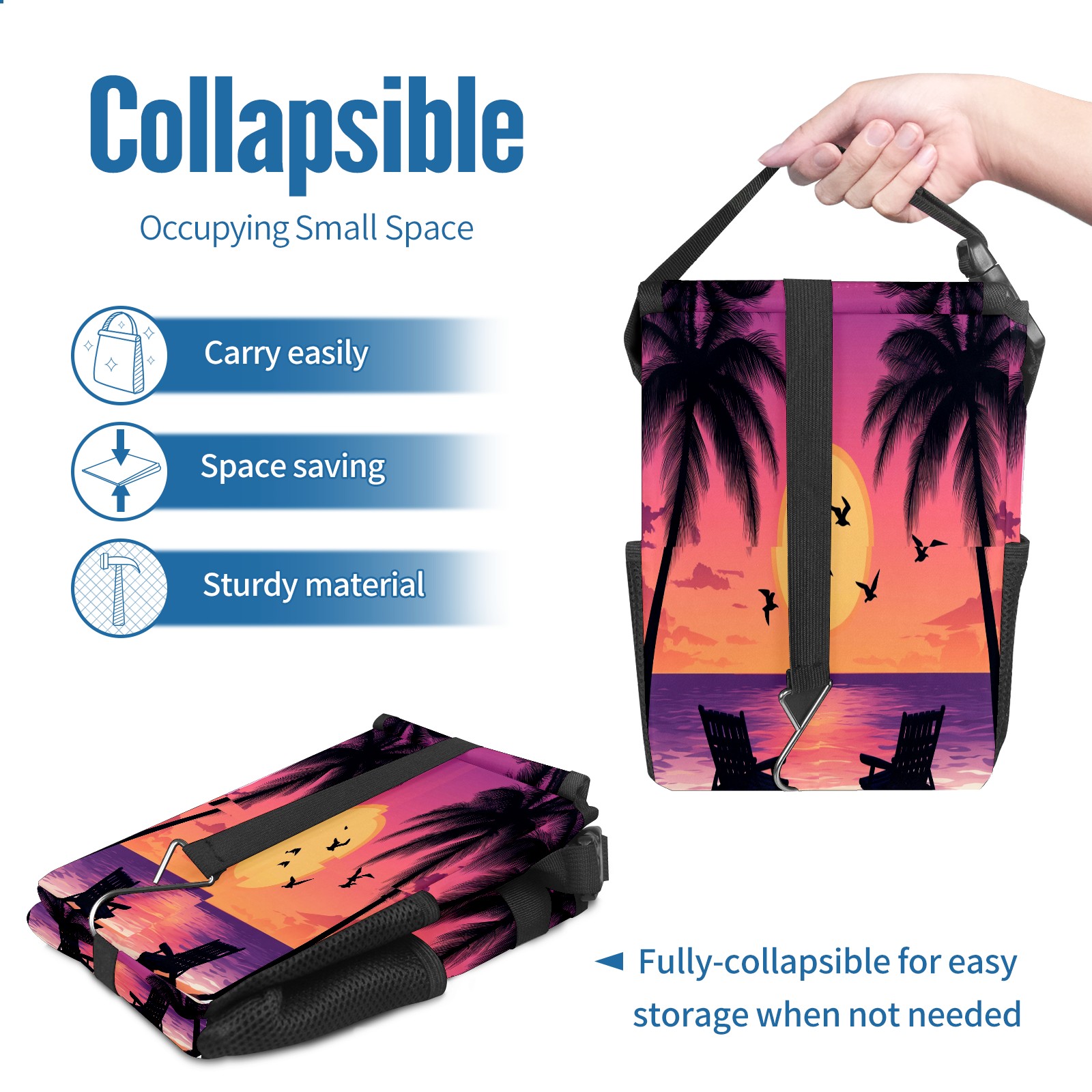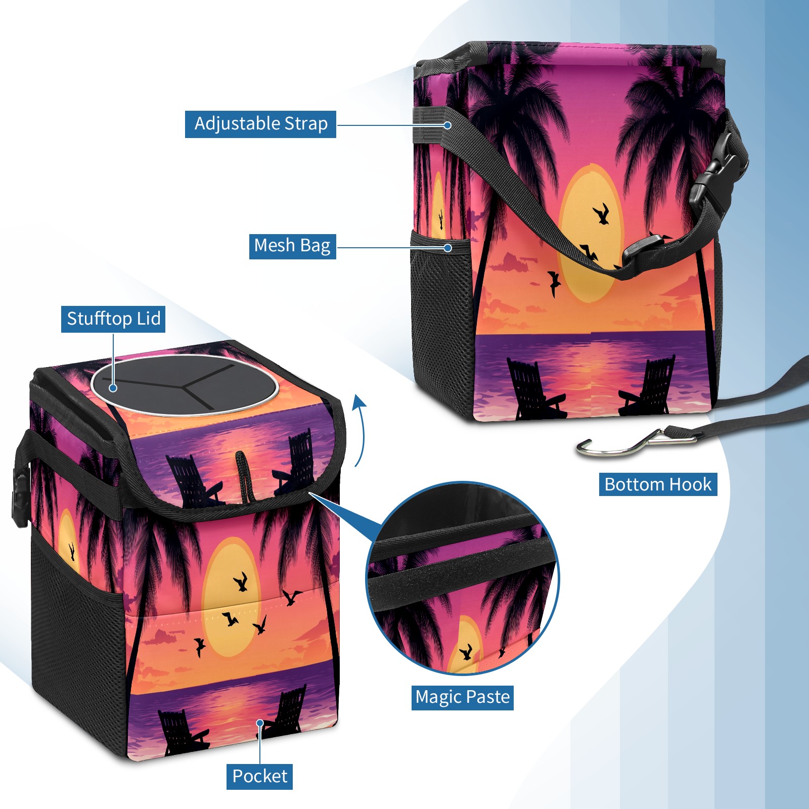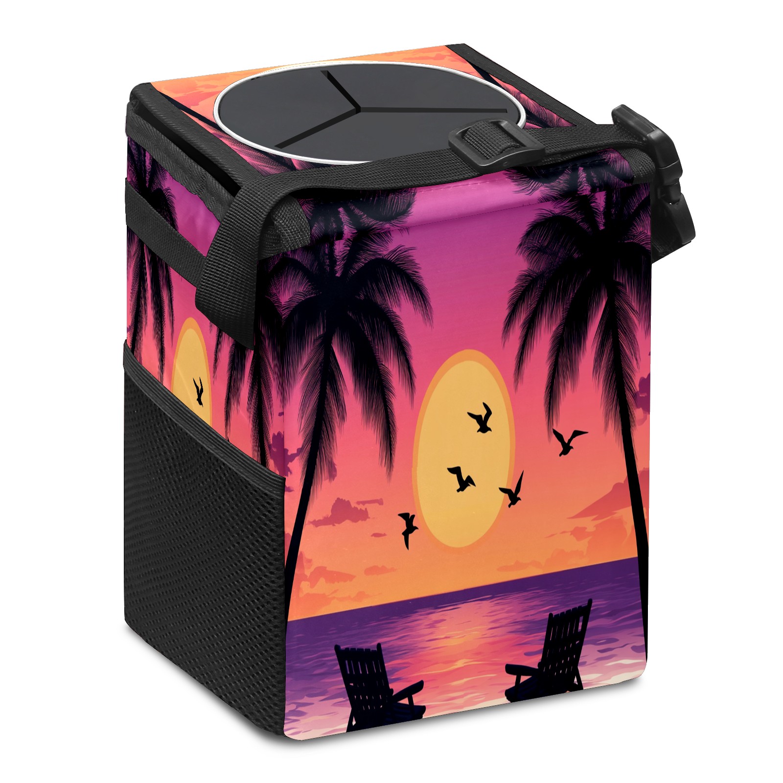 Car Trash Can with Lid, Small Portable Hanging Automotive Garbage Bin for Vehicles, Leakproof Waste Bag Container for SUV Truck Van Interior Auto Travel Road Trips(Purple Orange Sunset Seagull)