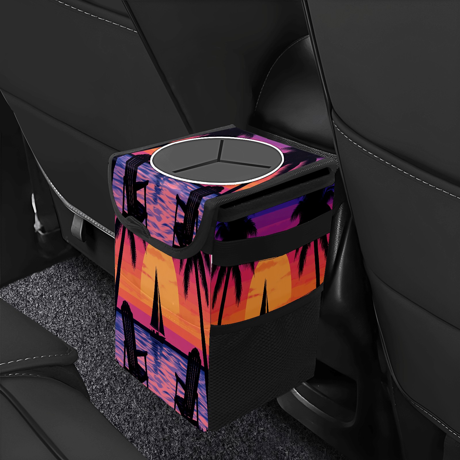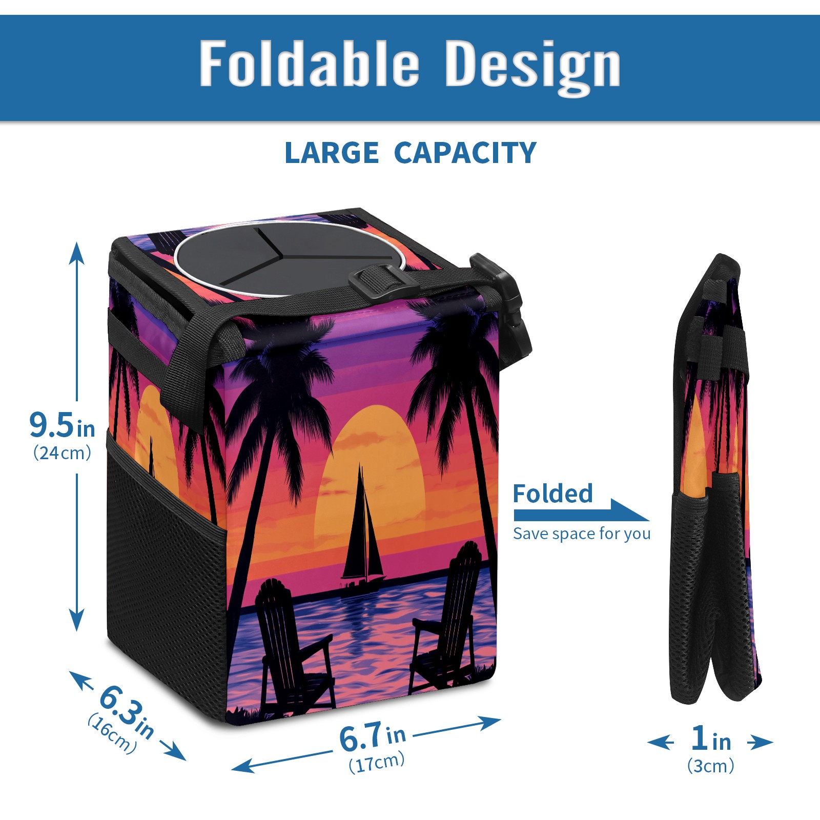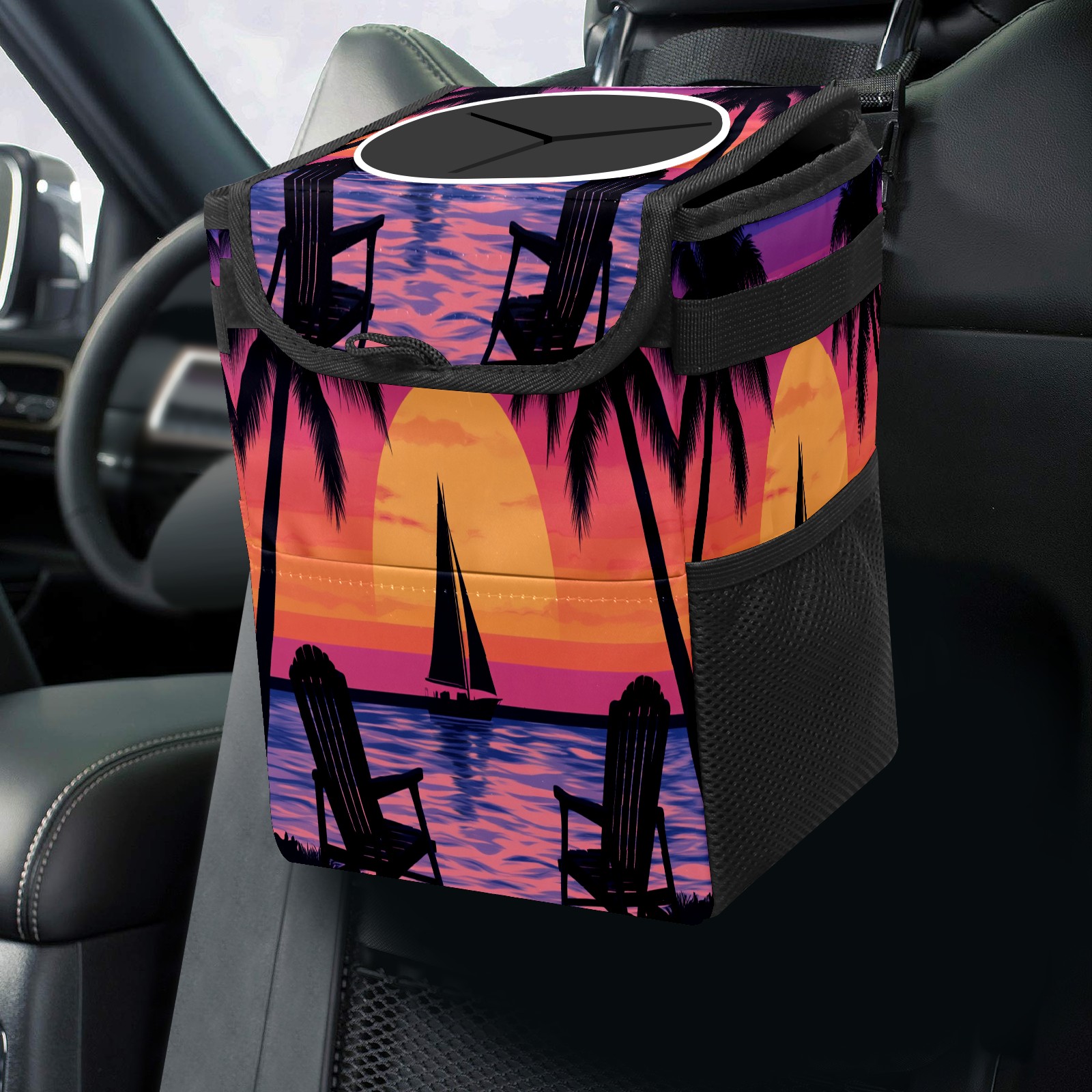 Car Trash Can with Lid, Small Portable Hanging Automotive Garbage Bin for Vehicles, Leakproof Waste Bag Container for SUV Truck Van Interior Auto Travel Road Trips(Purple Orange Sunset Sailboat)