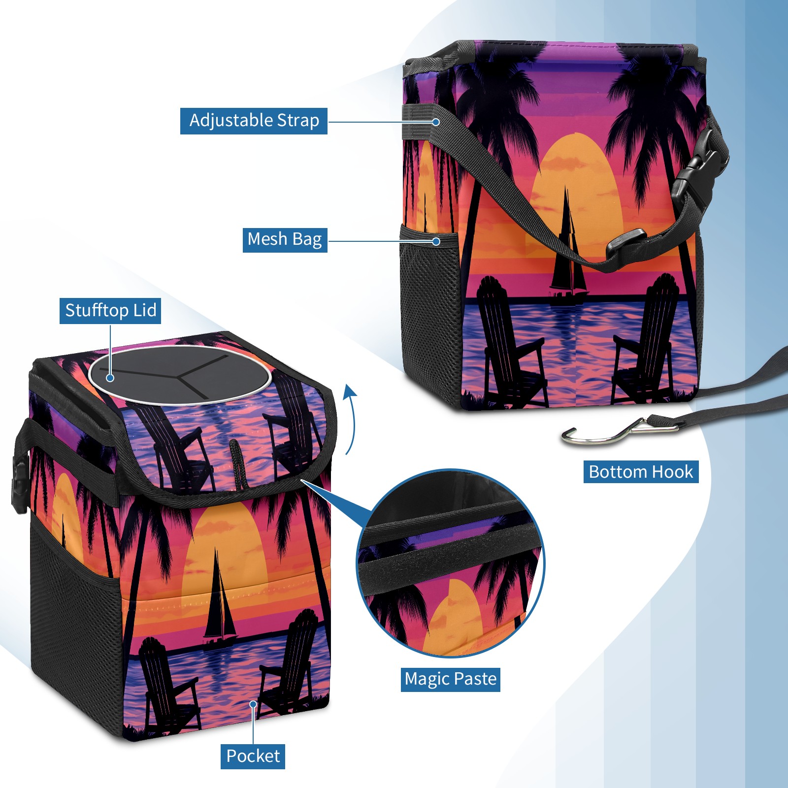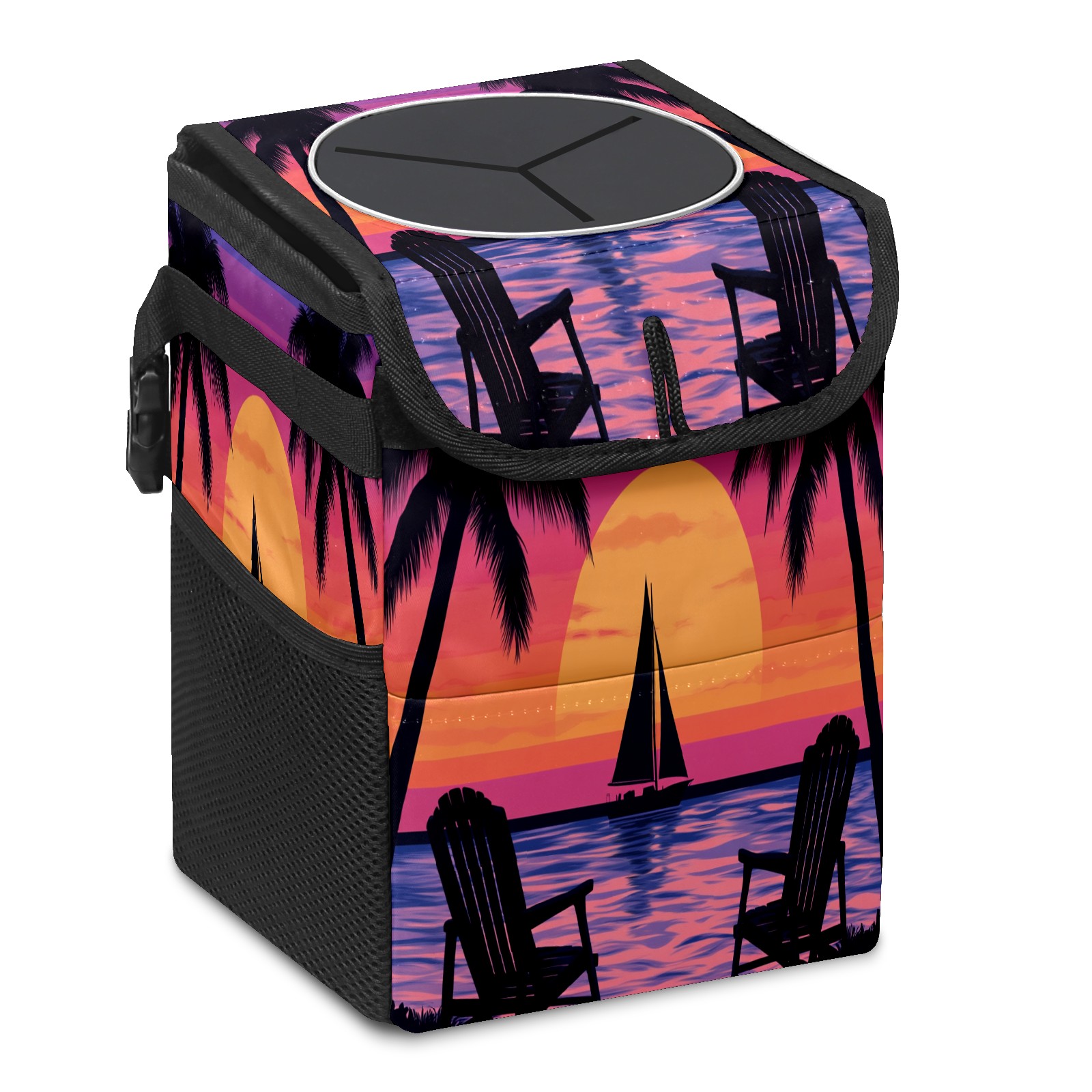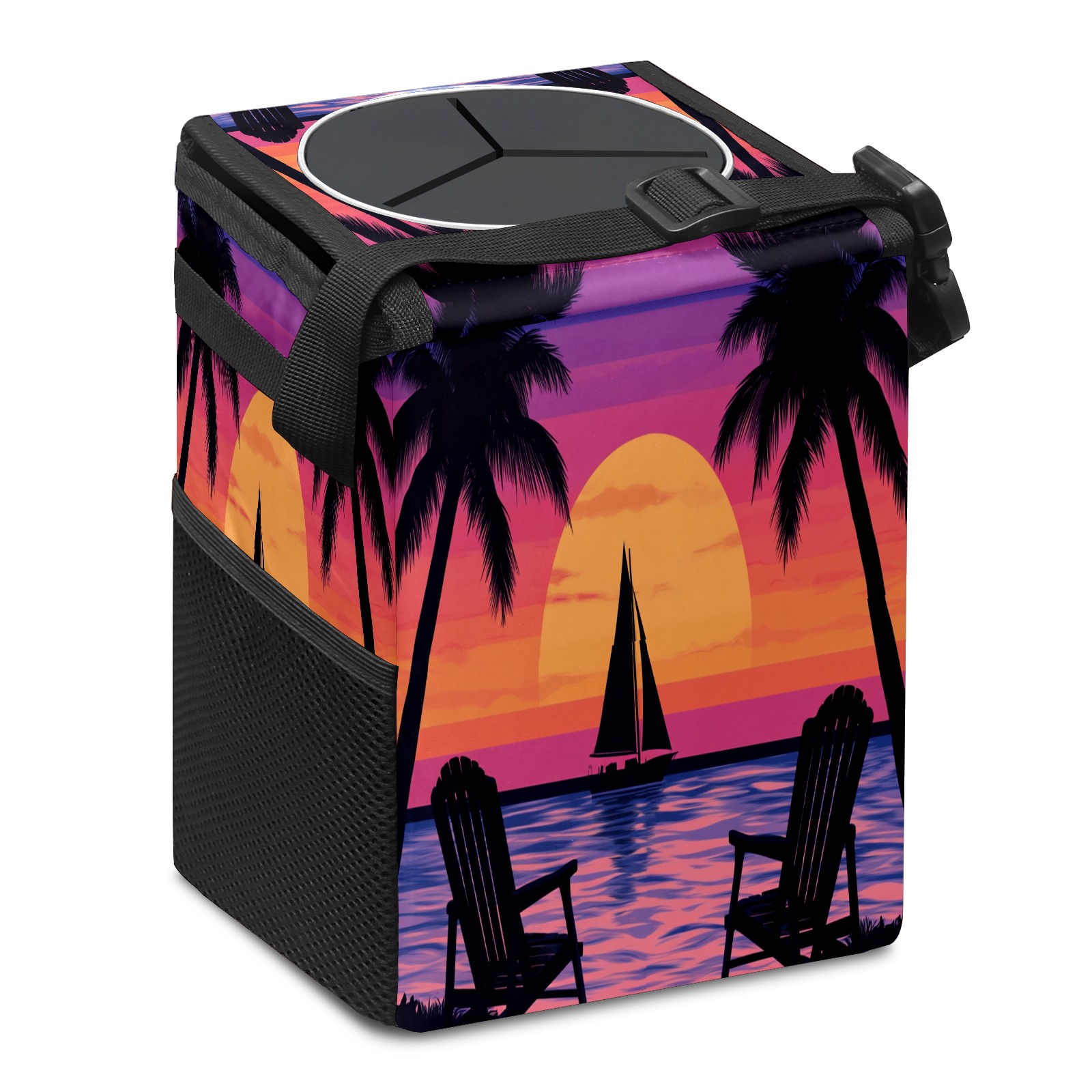 Car Trash Can with Lid, Small Portable Hanging Automotive Garbage Bin for Vehicles, Leakproof Waste Bag Container for SUV Truck Van Interior Auto Travel Road Trips(Purple Orange Sunset Sailboat)