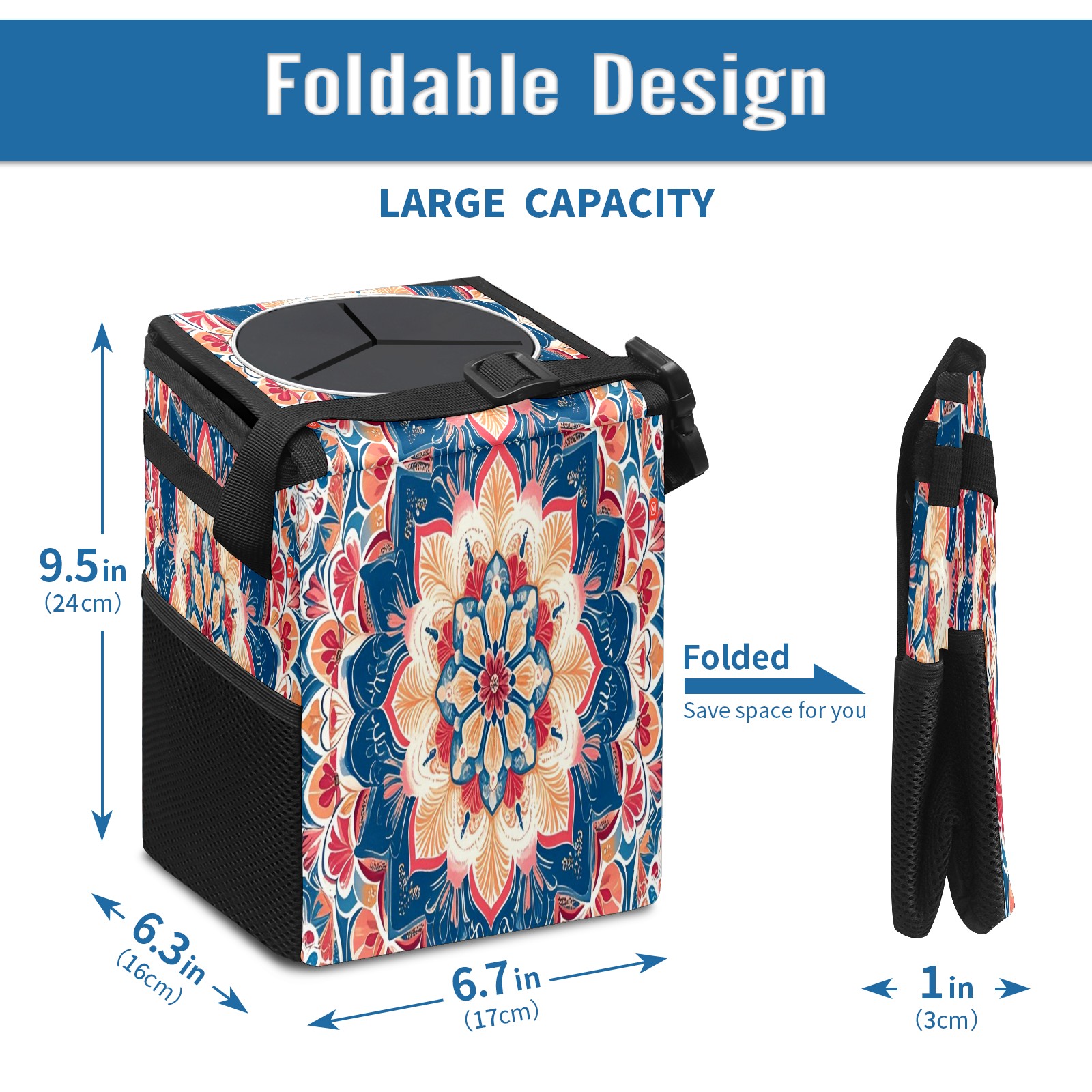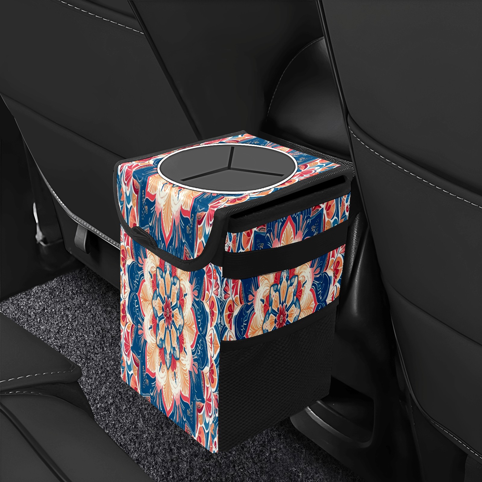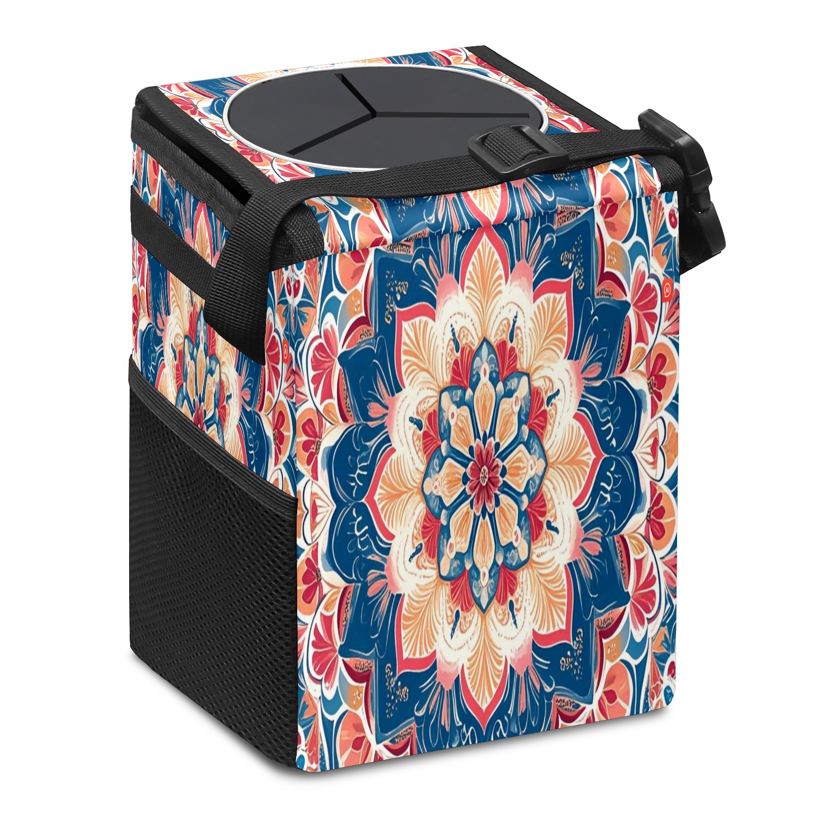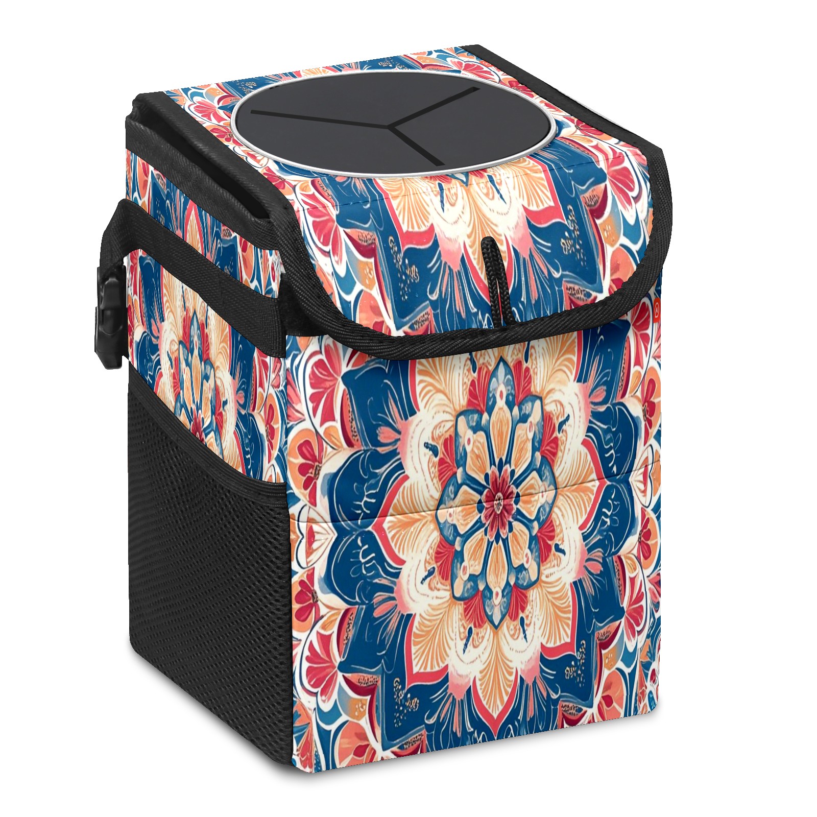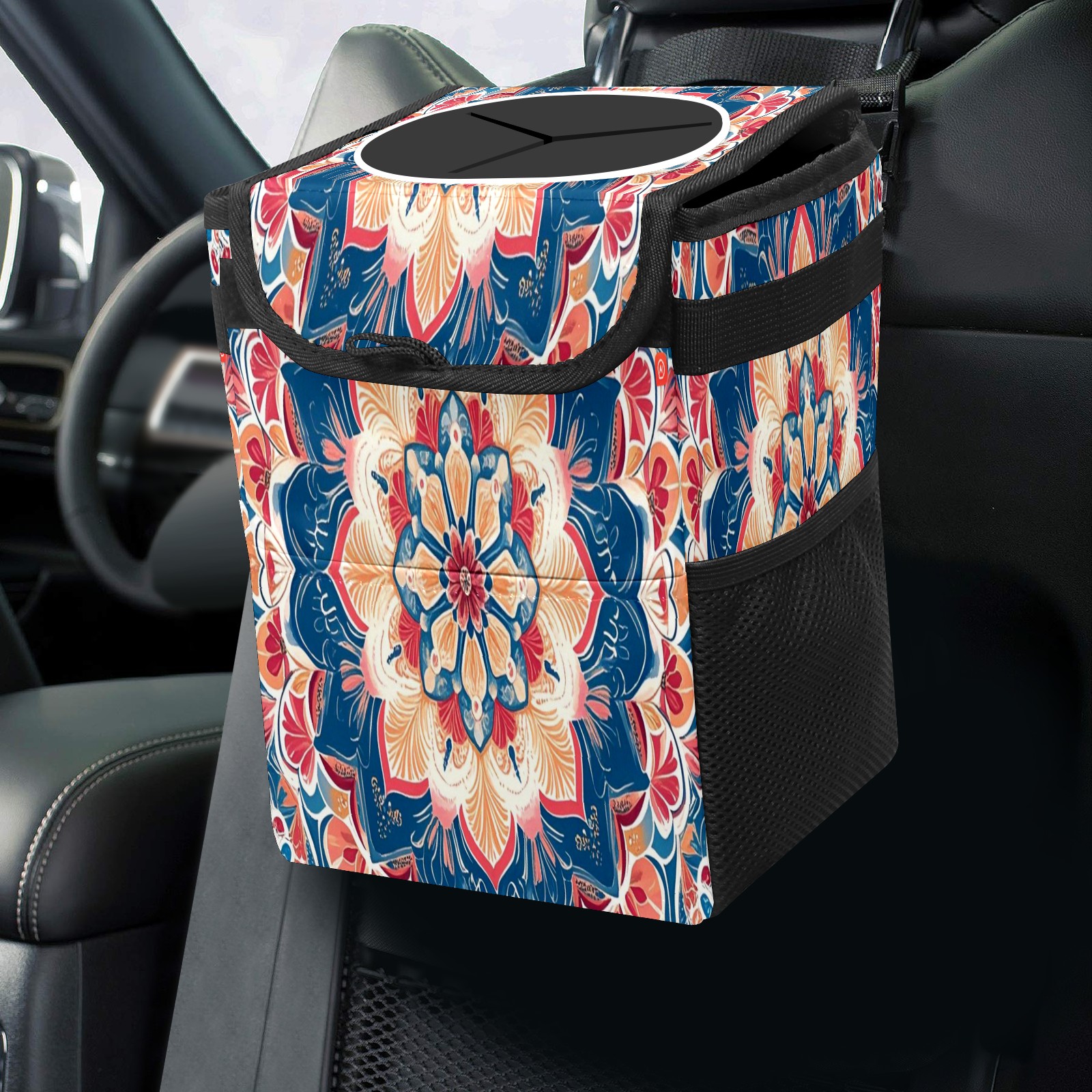 Car Trash Can with Lid, Small Portable Hanging Automotive Garbage Bin for Vehicles, Leakproof Waste Bag Container for SUV Truck Van Interior Auto Travel Road Trips(Dark Blue Red Mandala)