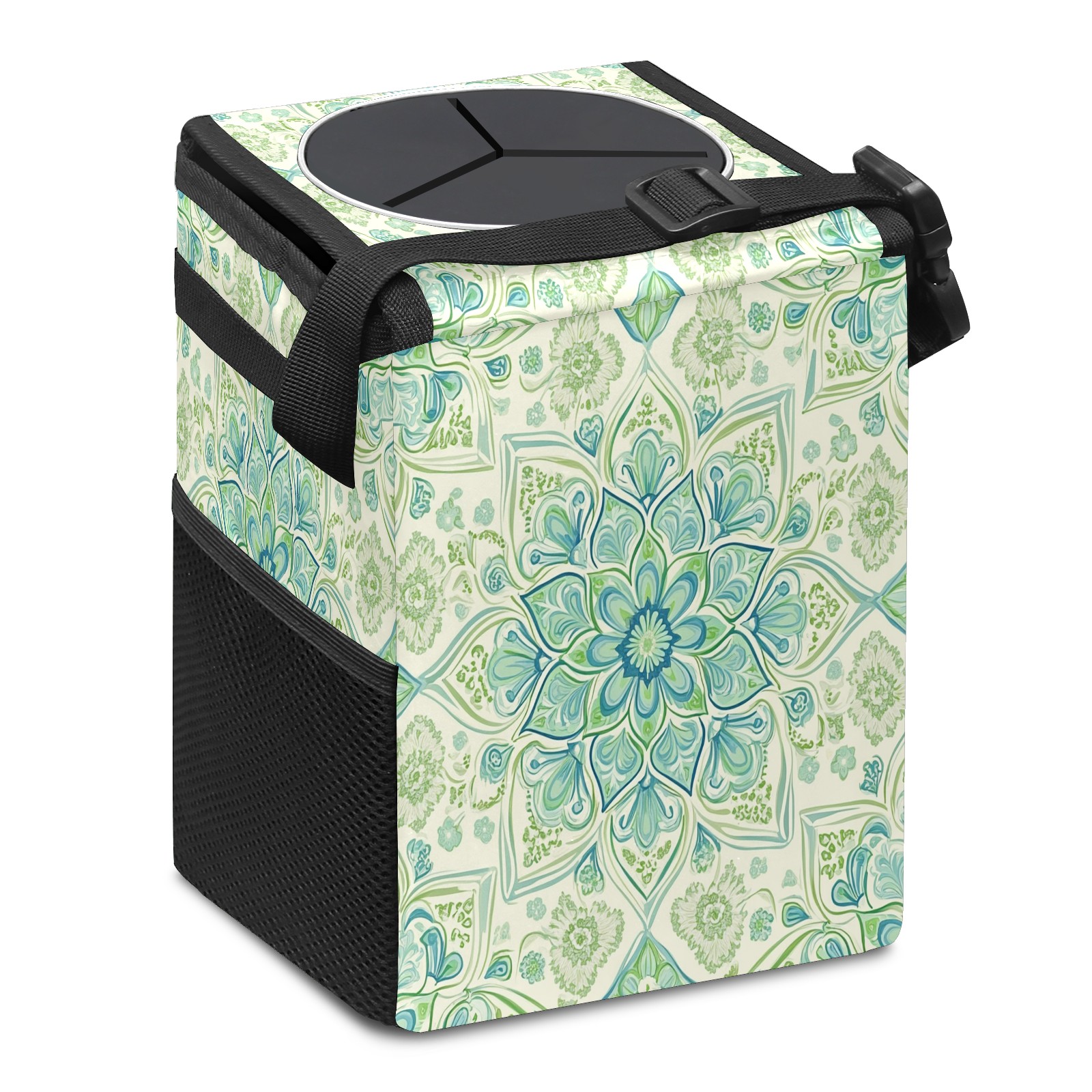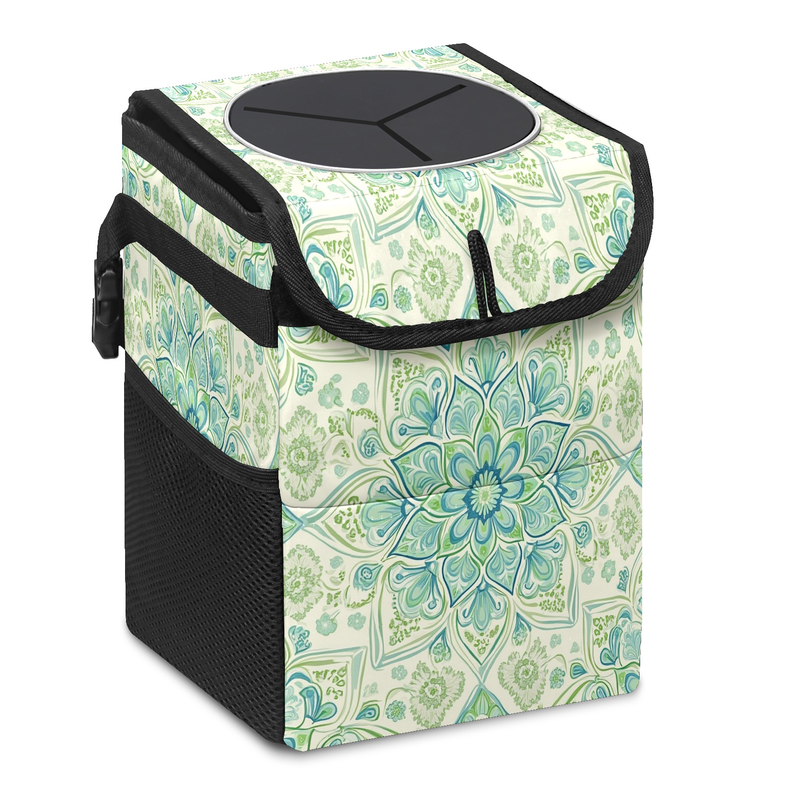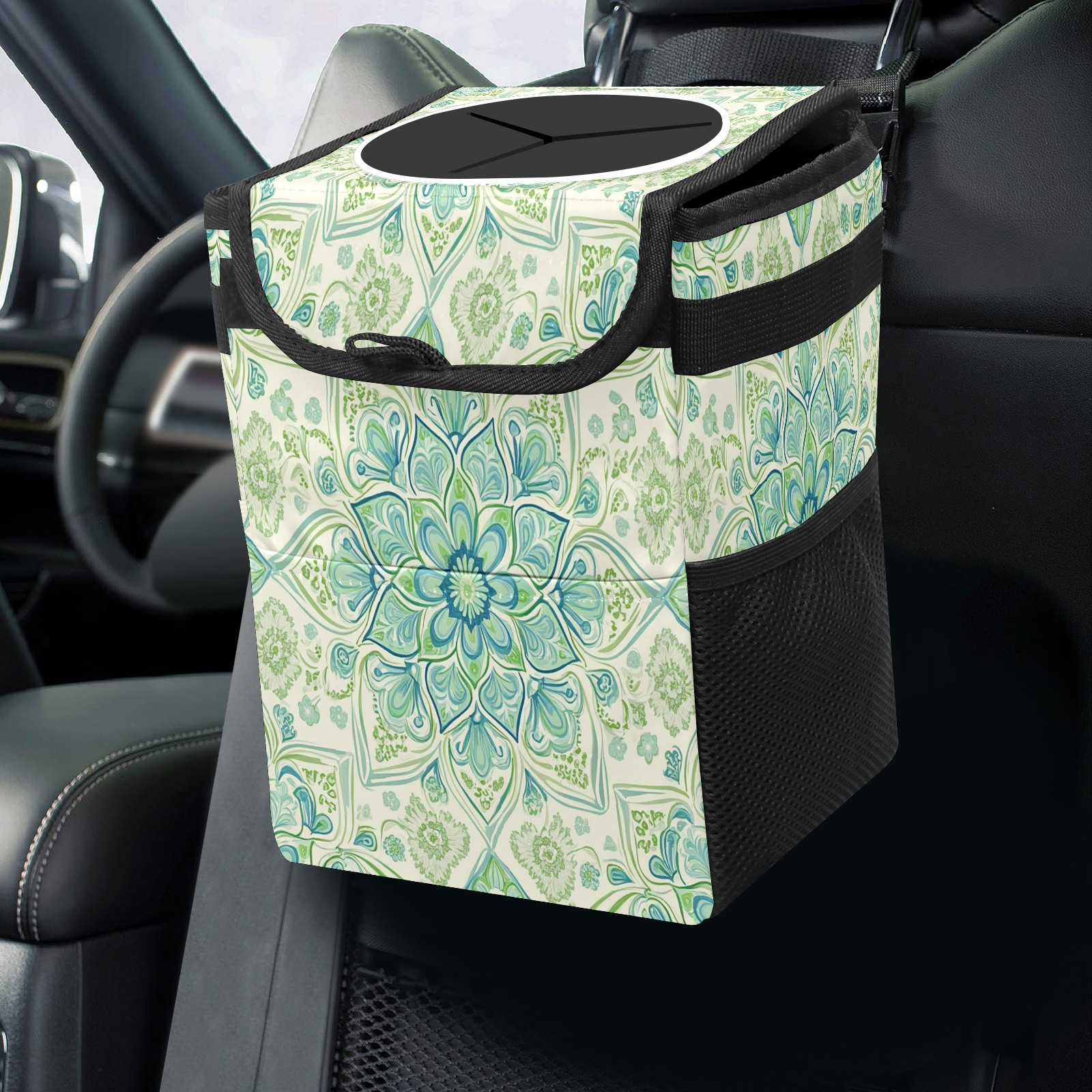 Car Trash Can with Lid, Small Portable Hanging Automotive Garbage Bin for Vehicles, Leakproof Waste Bag Container for SUV Truck Van Interior Auto Travel Road Trips(Green Mandala)