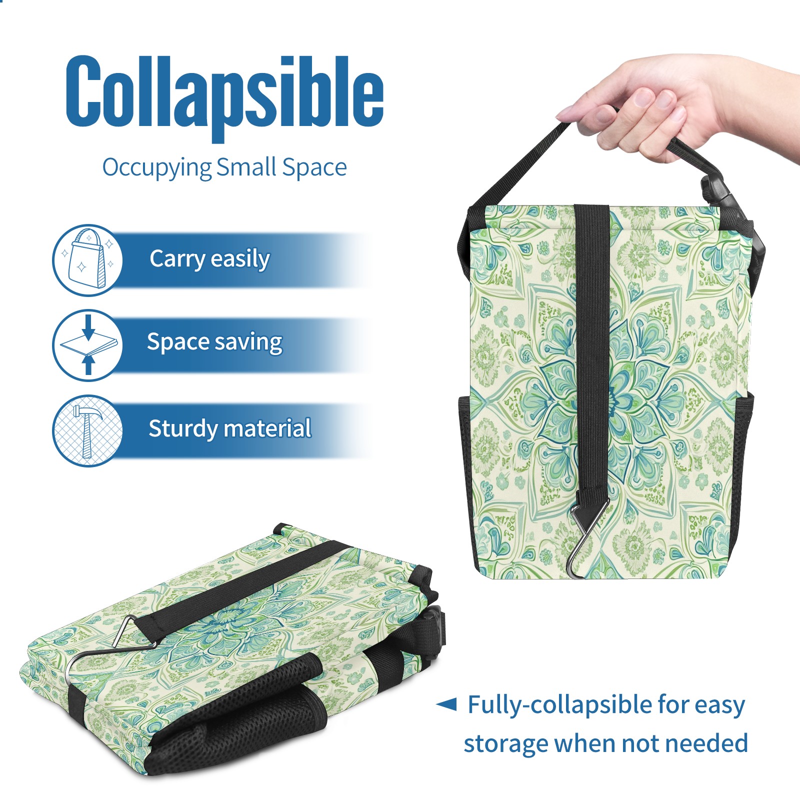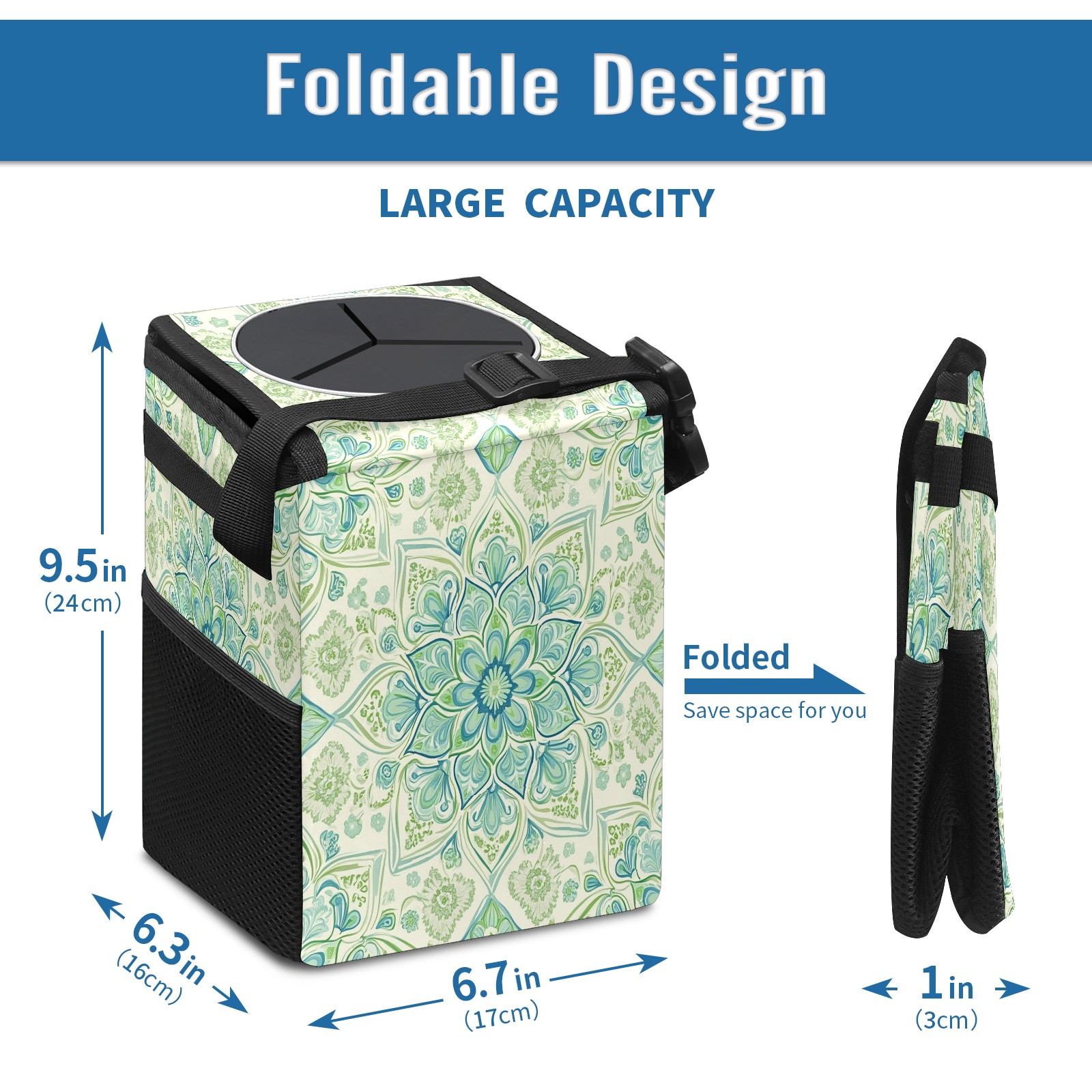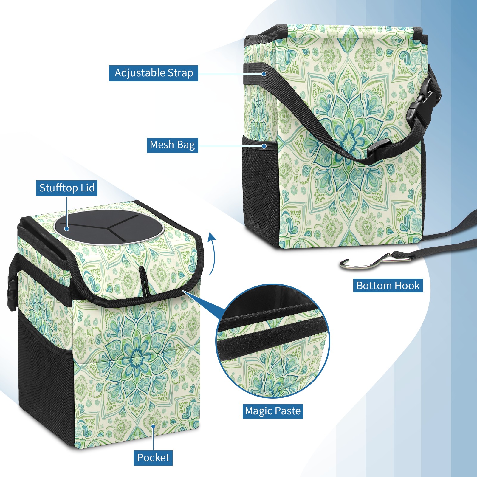 Car Trash Can with Lid, Small Portable Hanging Automotive Garbage Bin for Vehicles, Leakproof Waste Bag Container for SUV Truck Van Interior Auto Travel Road Trips(Green Mandala)
