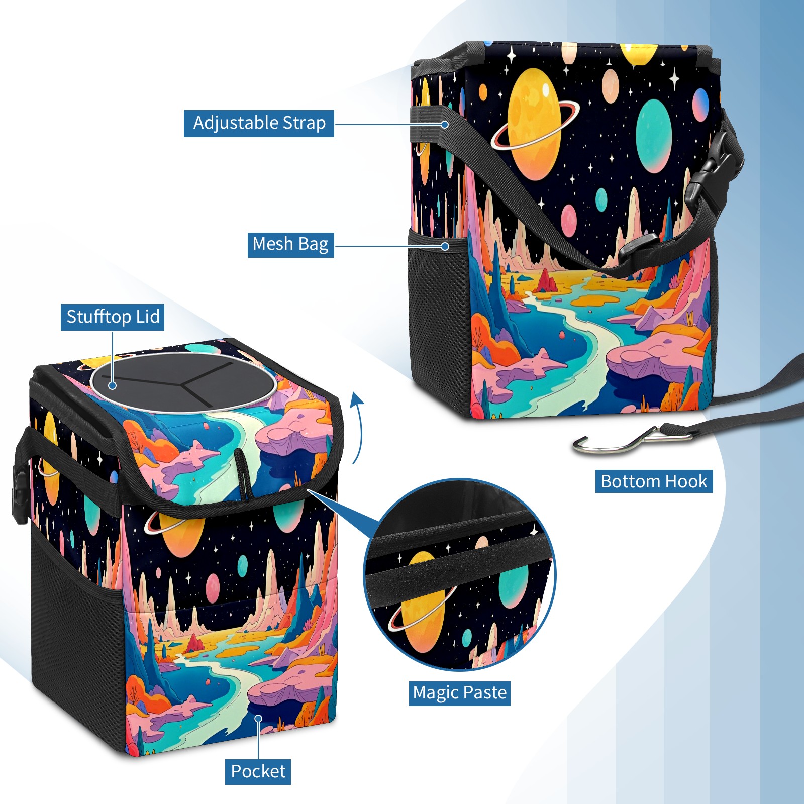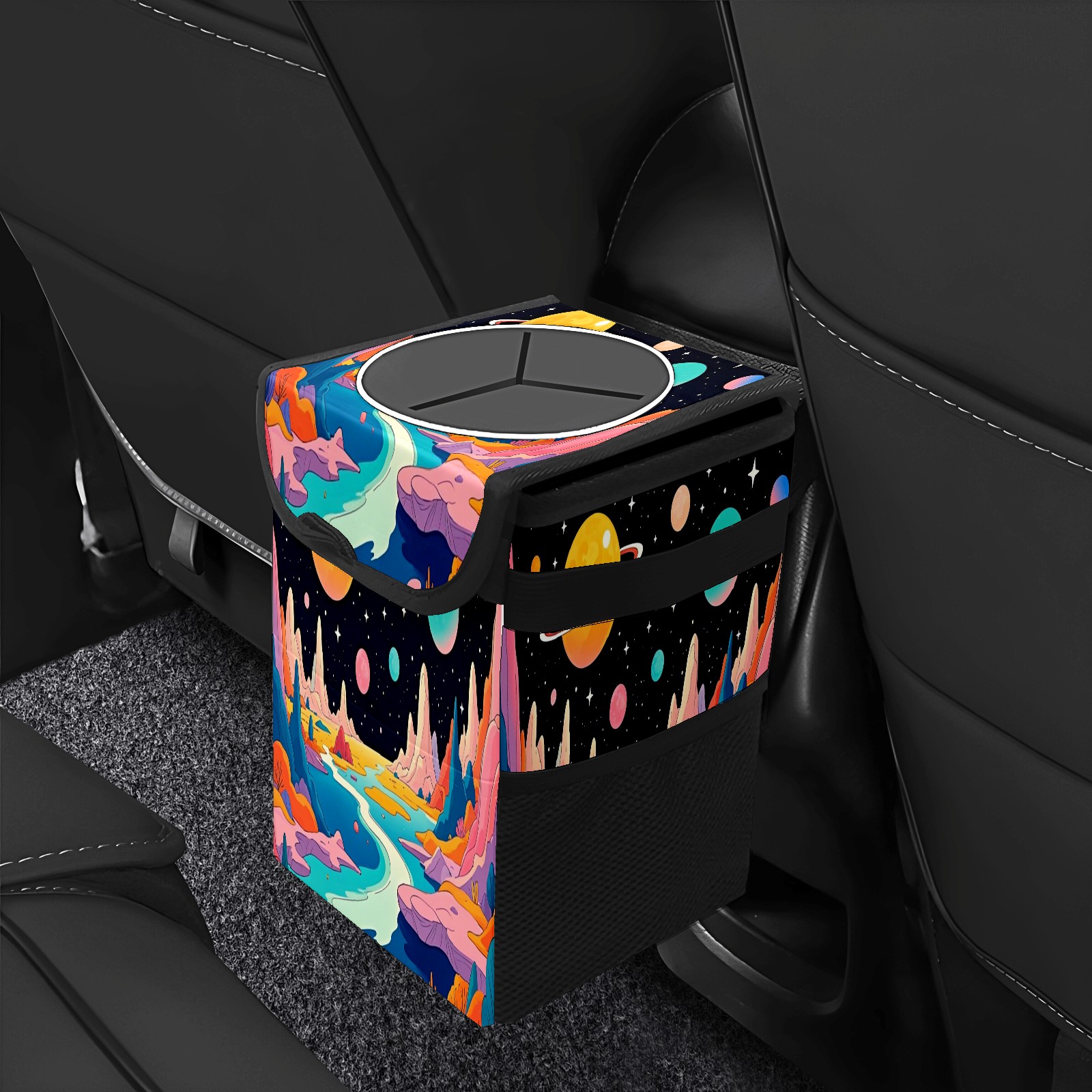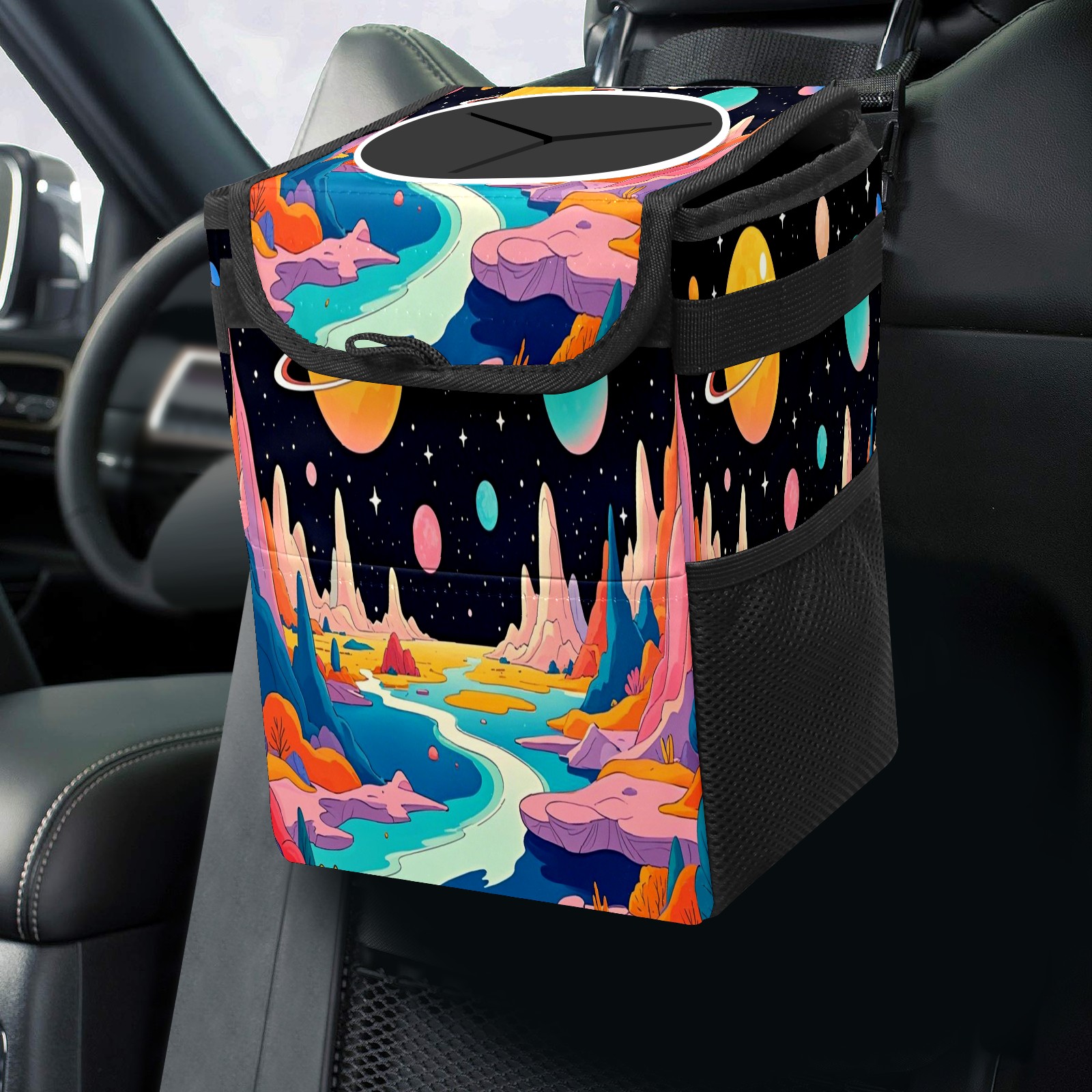 Car Trash Can with Lid, Small Portable Hanging Automotive Garbage Bin for Vehicles, Leakproof Waste Bag Container for SUV Truck Van Interior Auto Travel Road Trips(Colorful Planet)