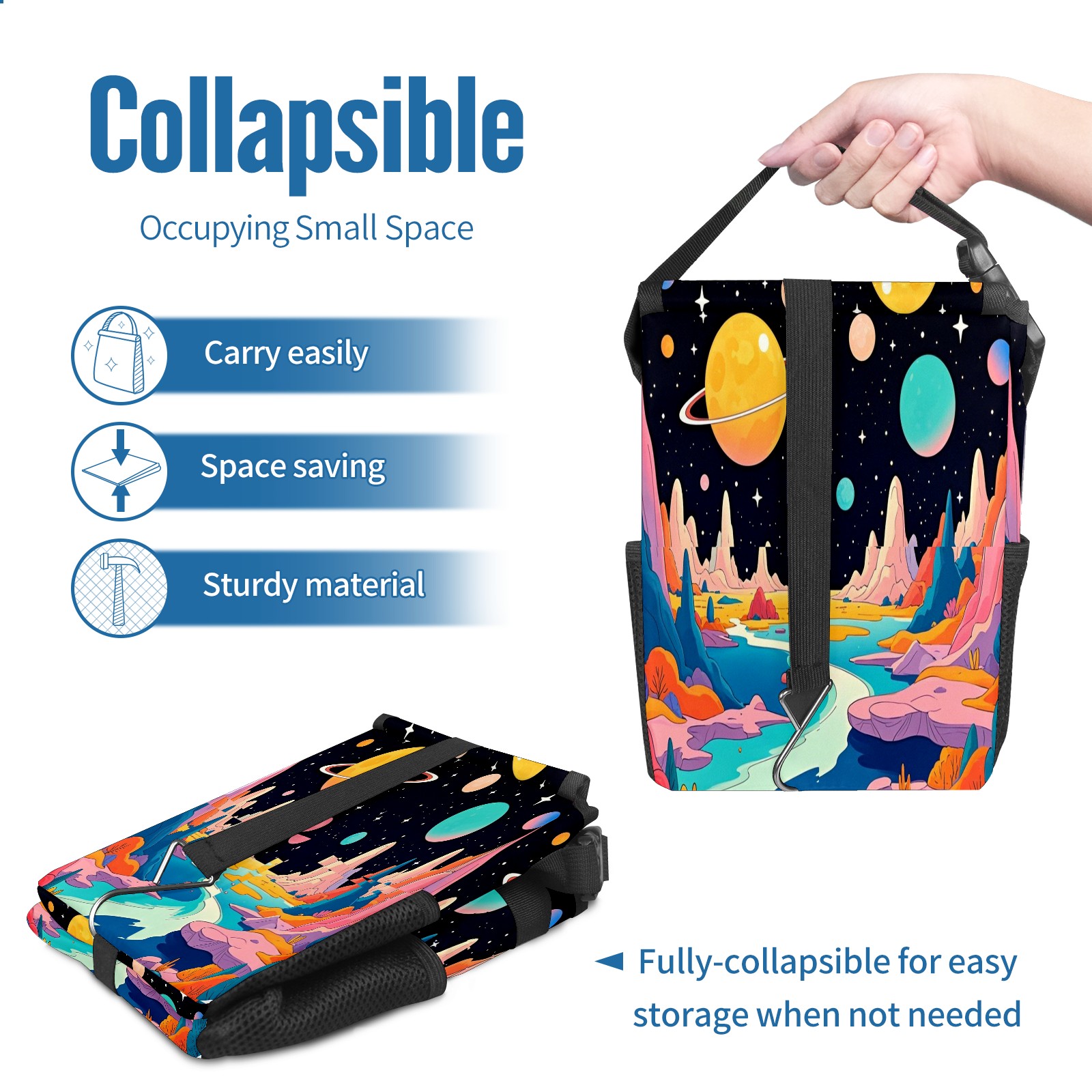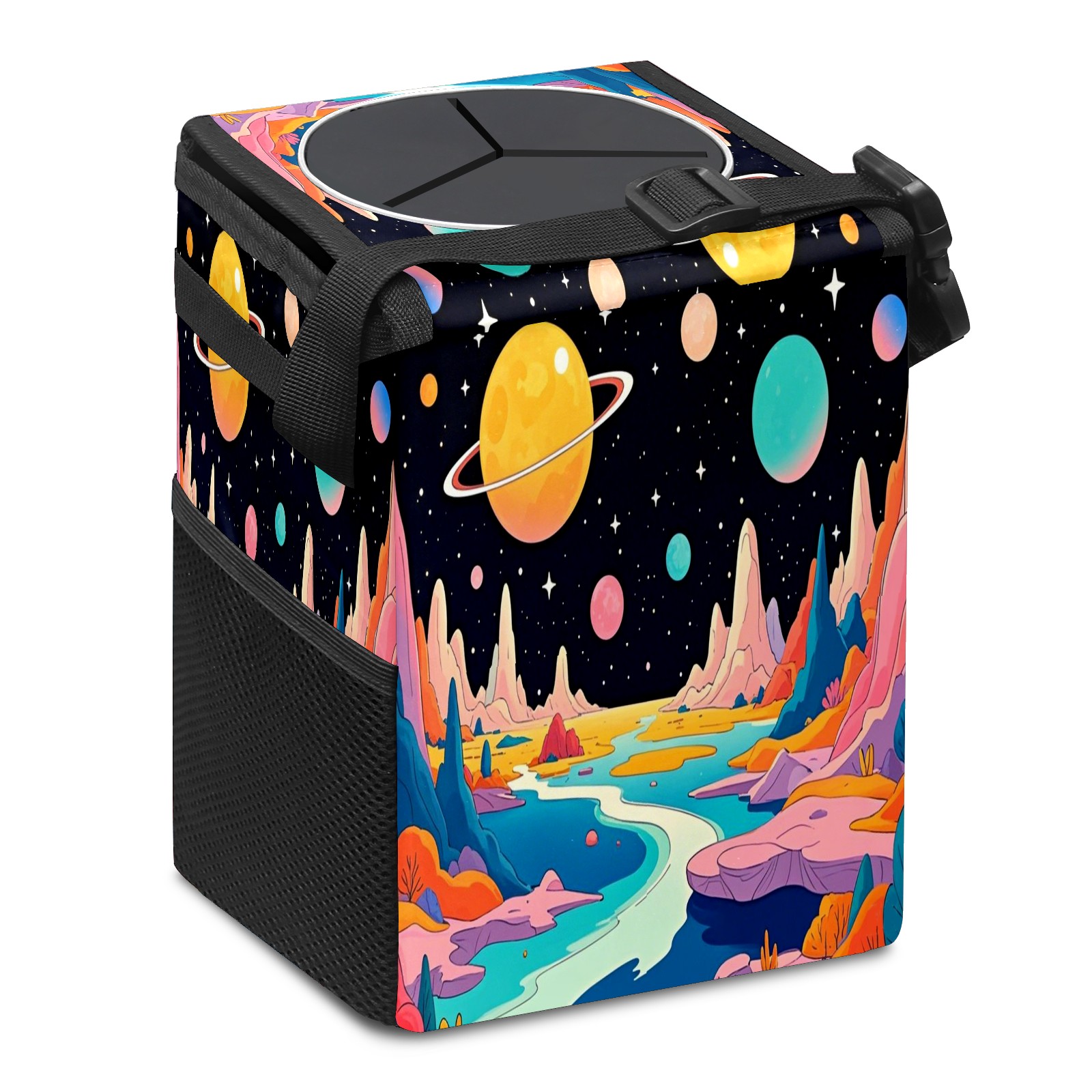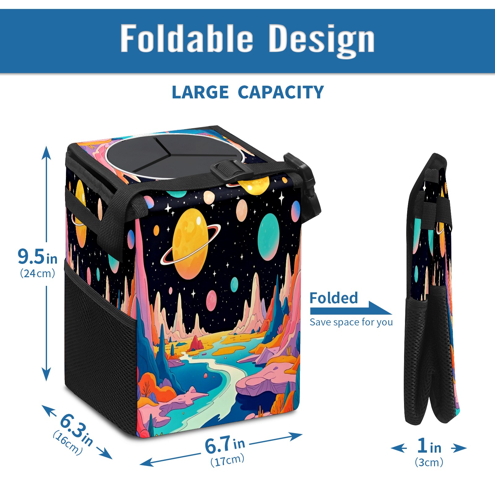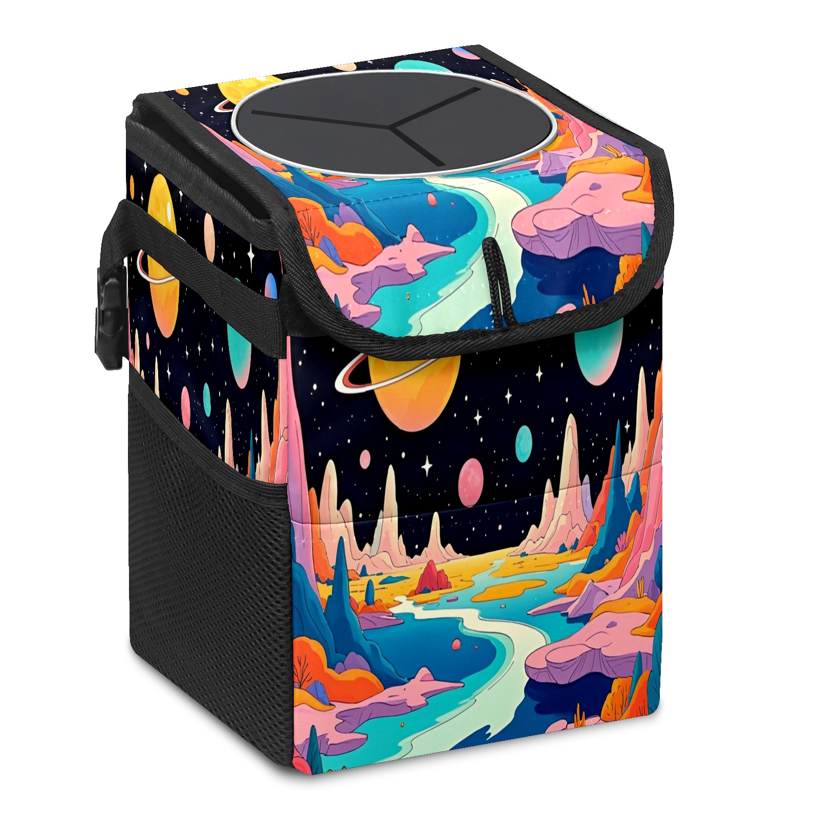Car Trash Can with Lid, Small Portable Hanging Automotive Garbage Bin for Vehicles, Leakproof Waste Bag Container for SUV Truck Van Interior Auto Travel Road Trips(Colorful Planet)