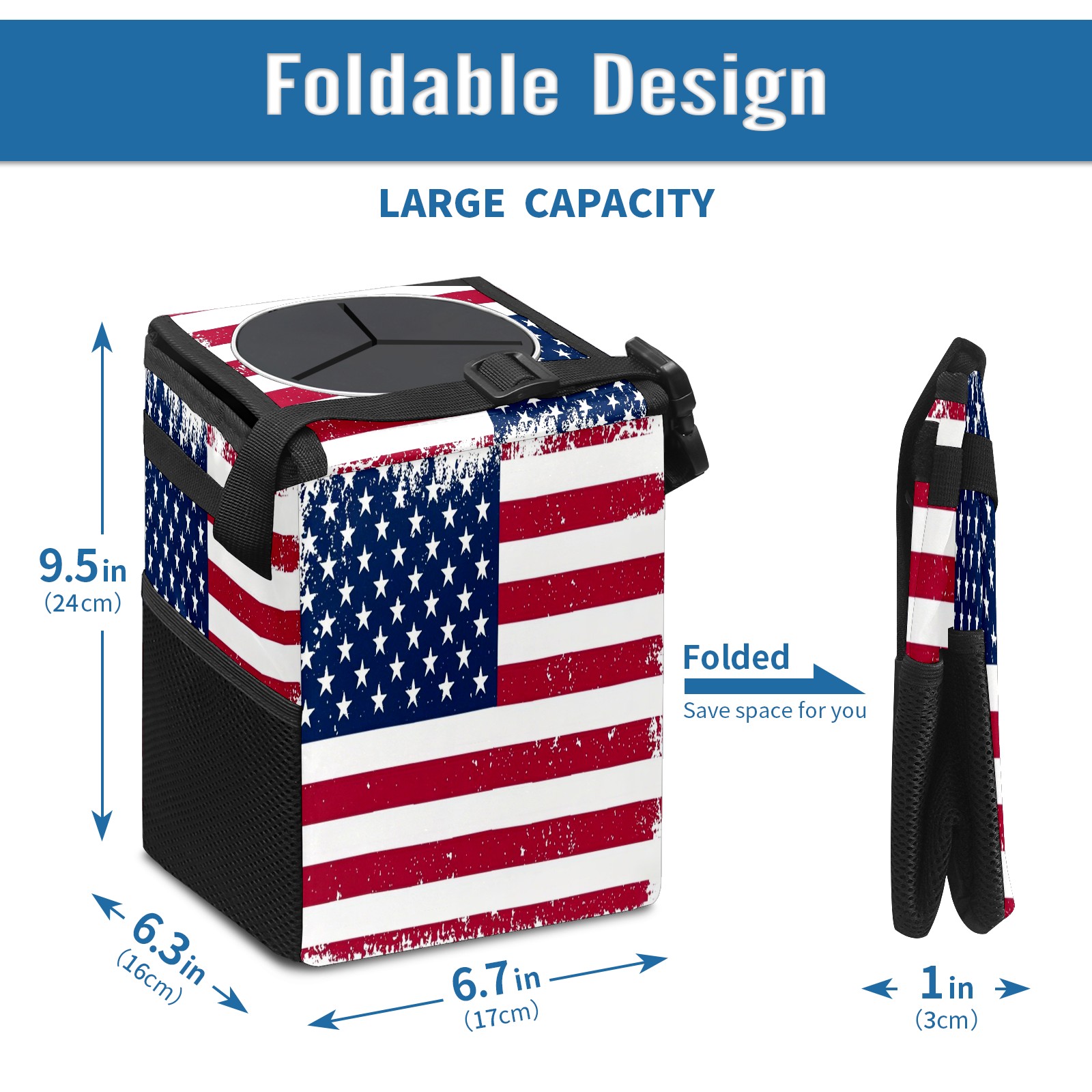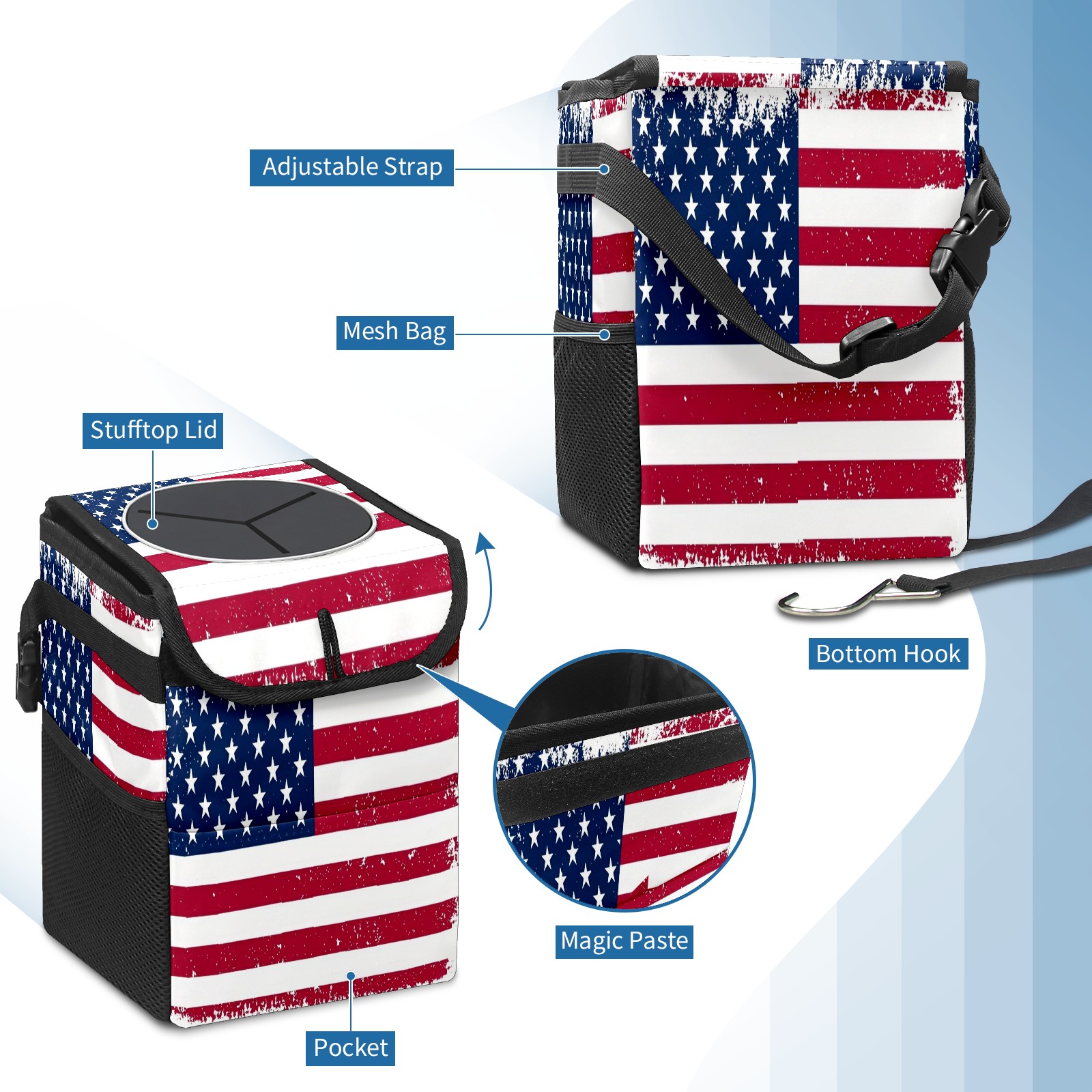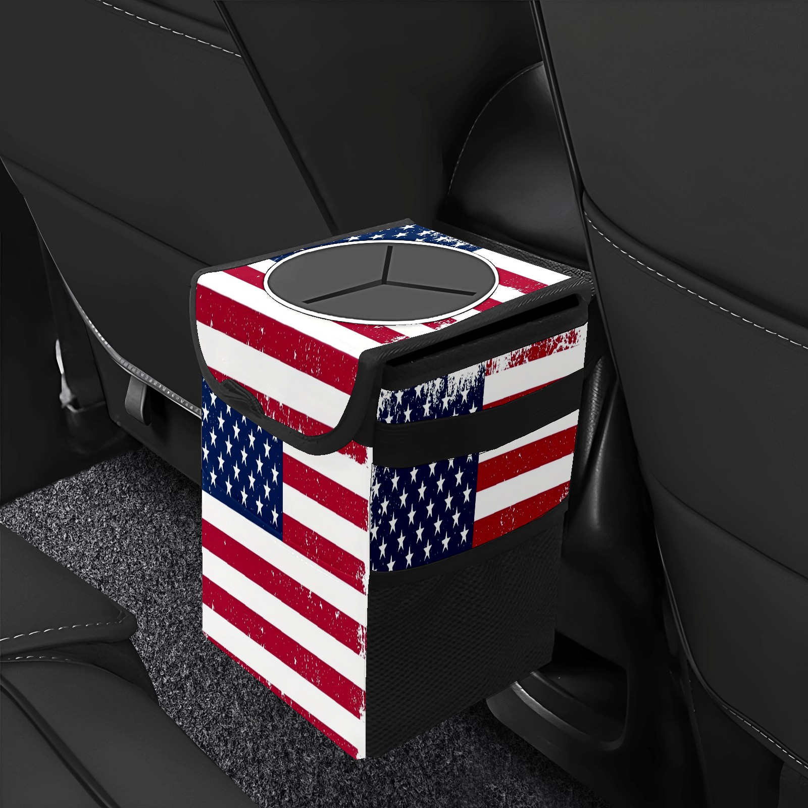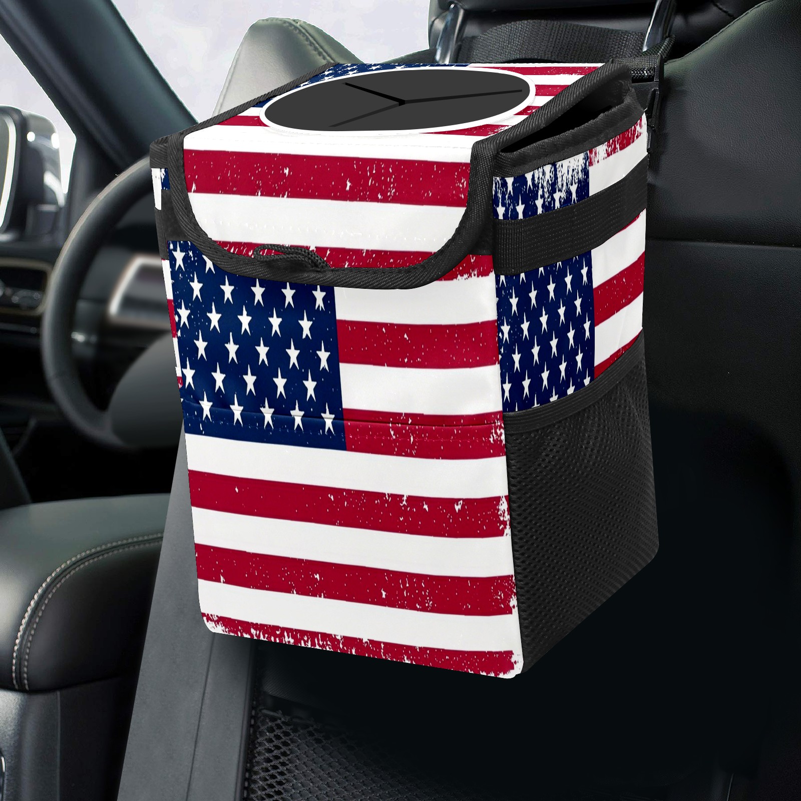 Car Trash Can with Lid, Small Portable Hanging Automotive Garbage Bin for Vehicles, Leakproof Waste Bag Container for SUV Truck Van Interior Auto Travel Road Trips(American Flag)