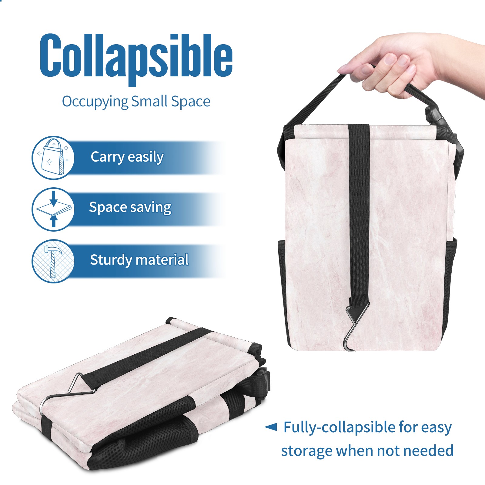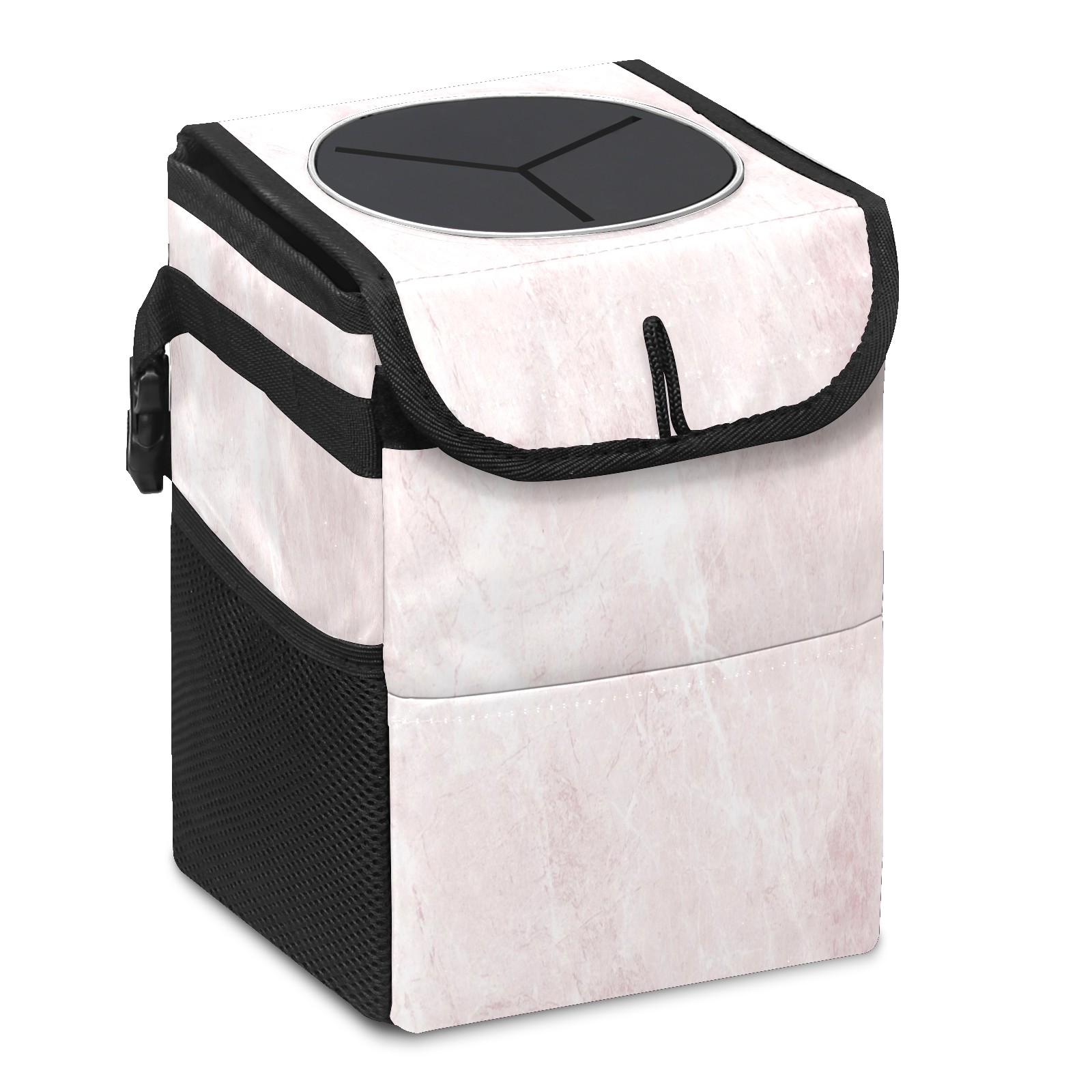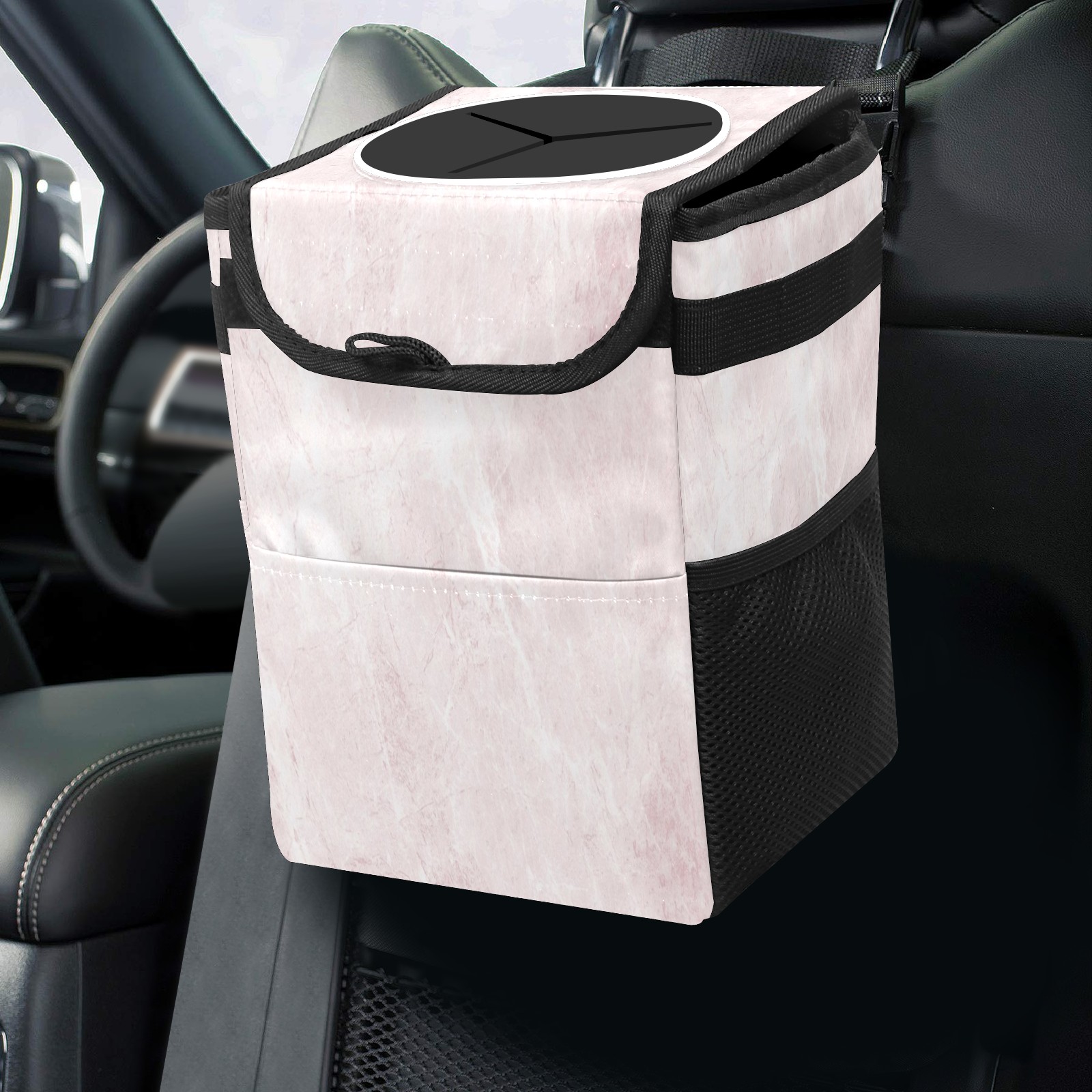 Car Trash Can with Lid, Small Portable Hanging Automotive Garbage Bin for Vehicles, Leakproof Waste Bag Container for SUV Truck Van Interior Auto Travel Road Trips(Pink Marble)
