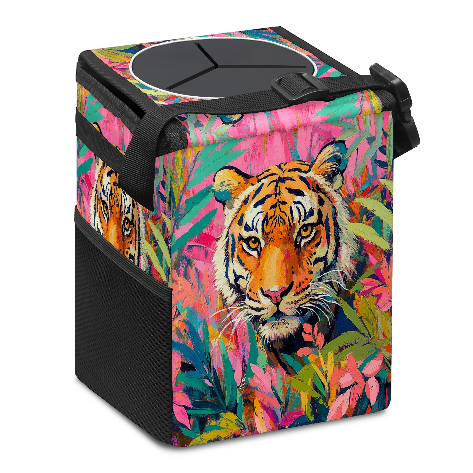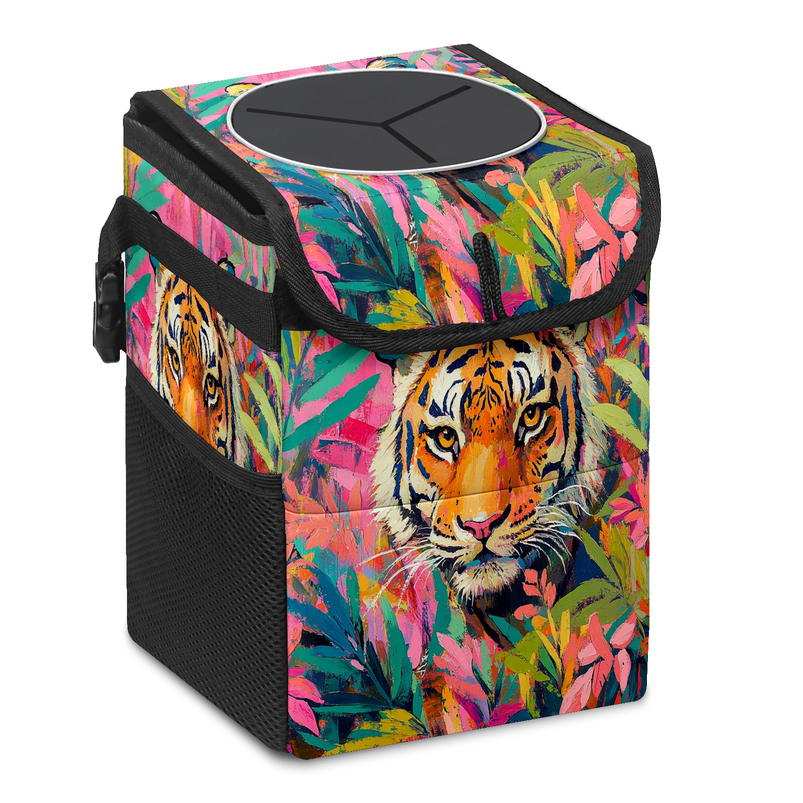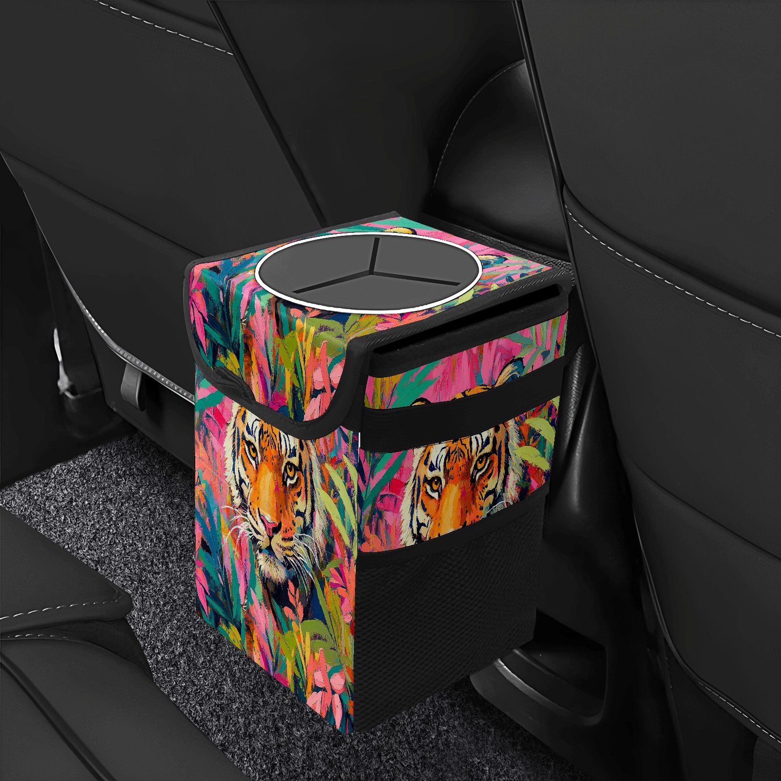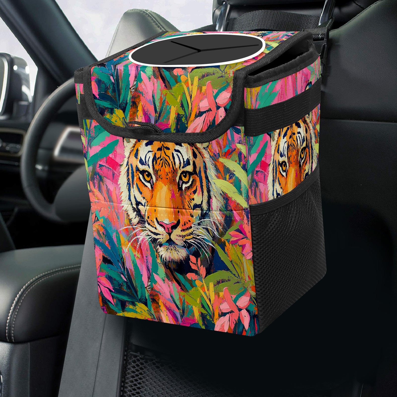 Car Trash Can with Lid, Small Portable Hanging Automotive Garbage Bin for Vehicles, Leakproof Waste Bag Container for SUV Truck Van Interior Auto Travel Road Trips(Tiger)