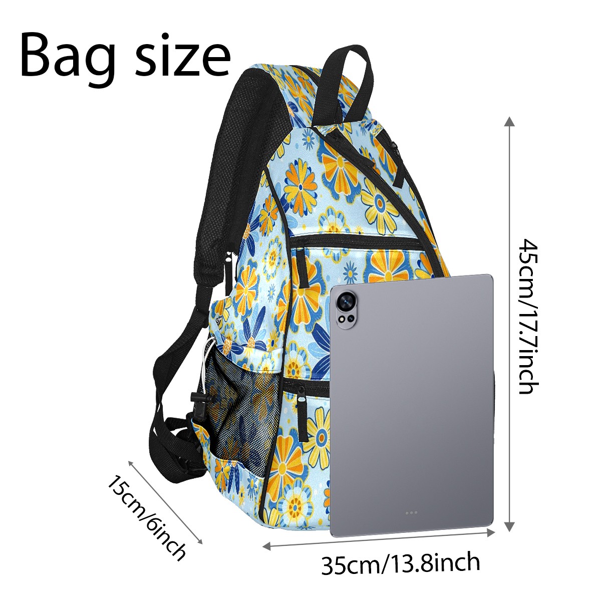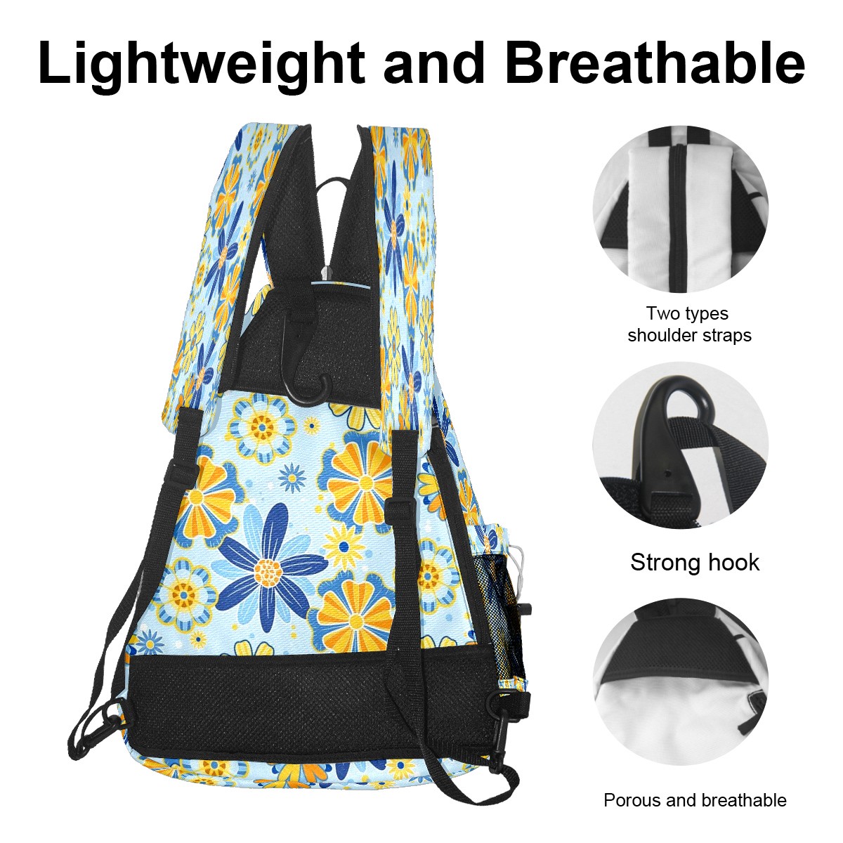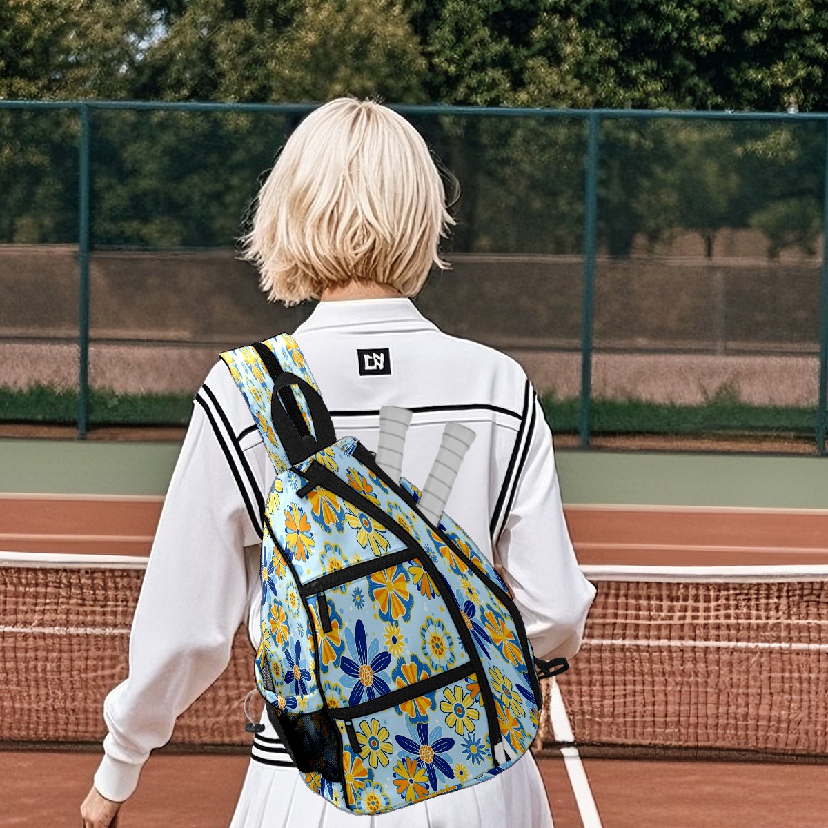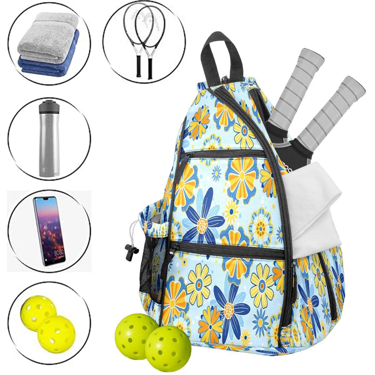 Pickleball Shoulder Bag for Men and Women - Fence Hook - Crossbody Backpack with Water Bottle Holder Yellow Blue Flowers