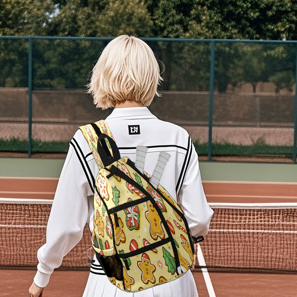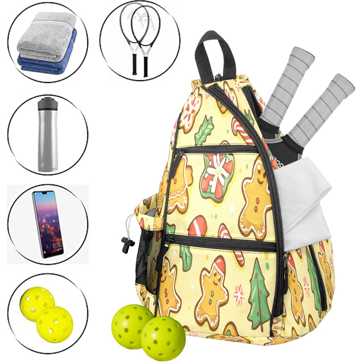 Pickleball Shoulder Bag for Men and Women - Fence Hook - Crossbody Backpack with Water Bottle Holder Christmas Gingerbread Man Candy