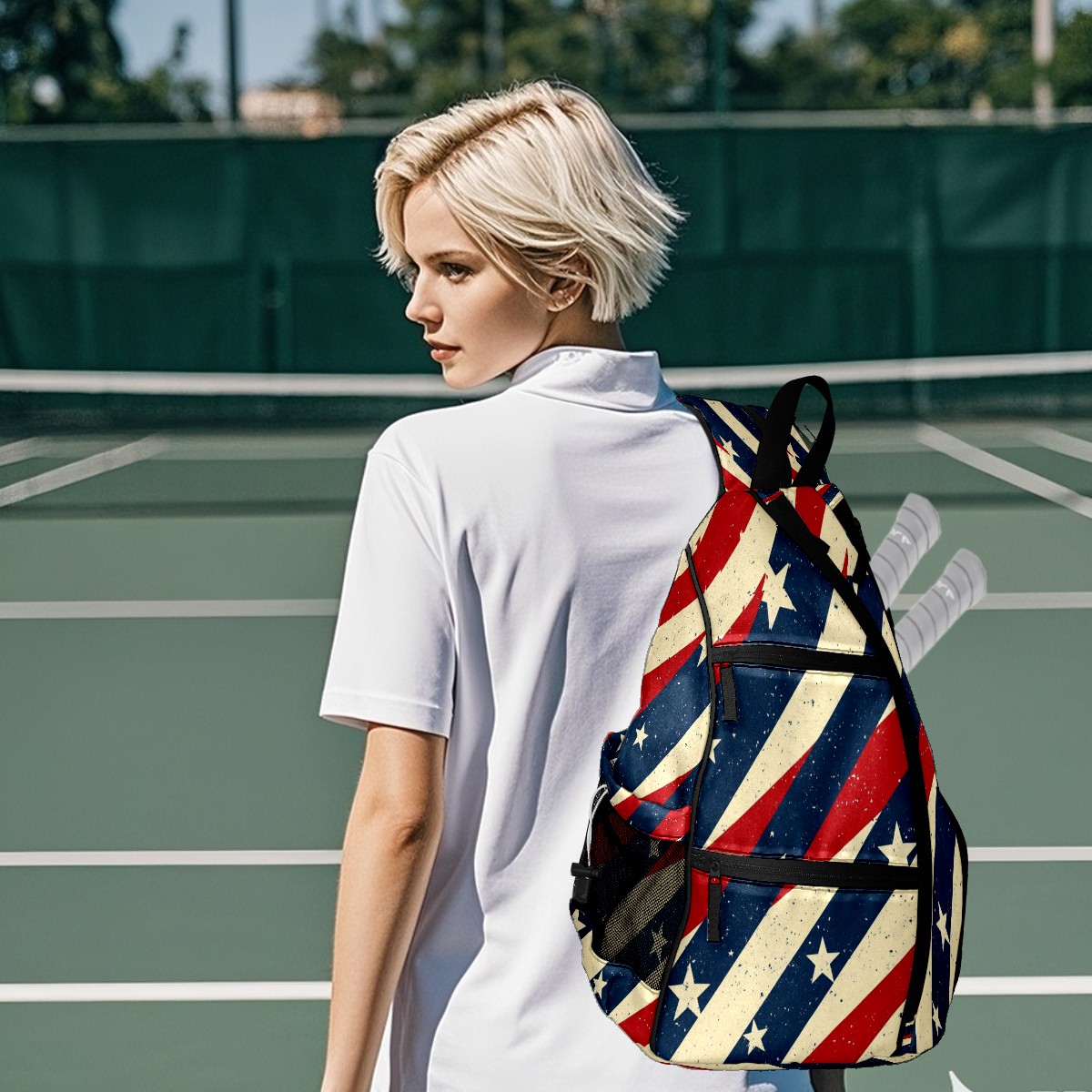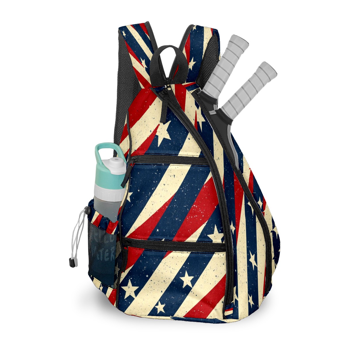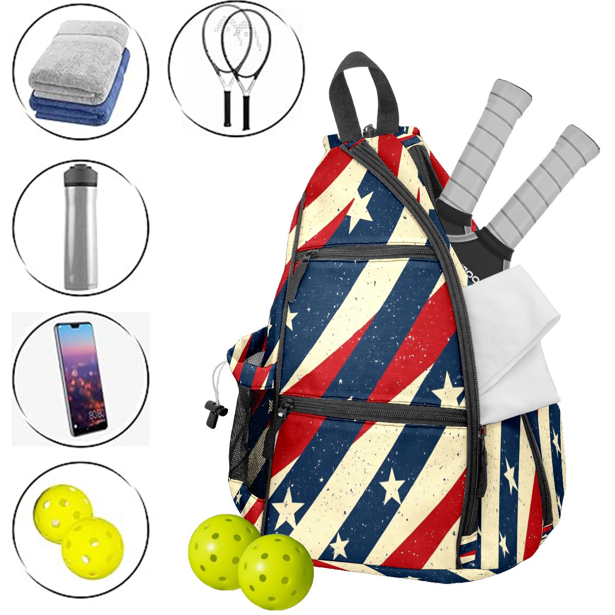 Pickleball Shoulder Bag for Men and Women - Fence Hook - Crossbody Backpack with Water Bottle Holder Red Blue White Stripes