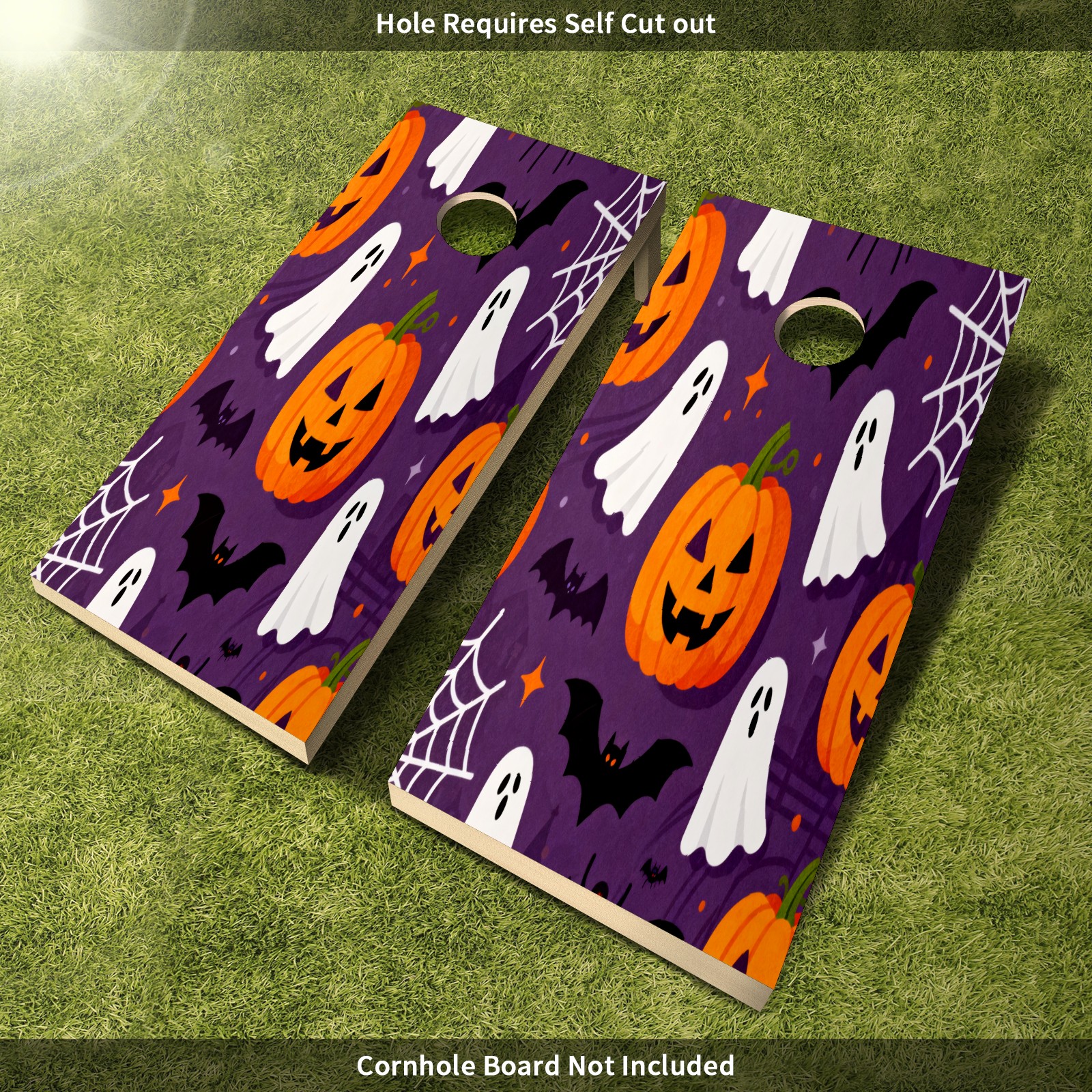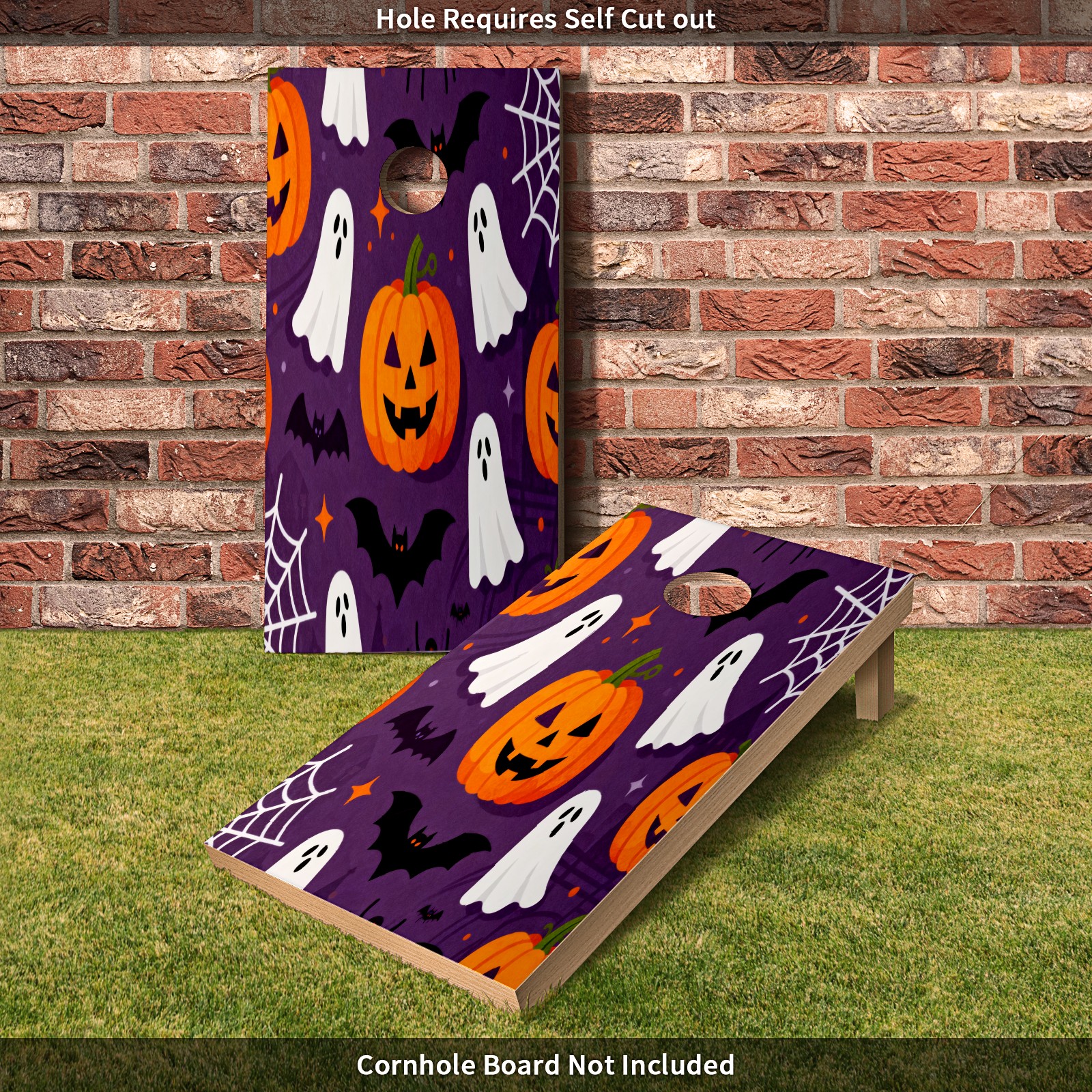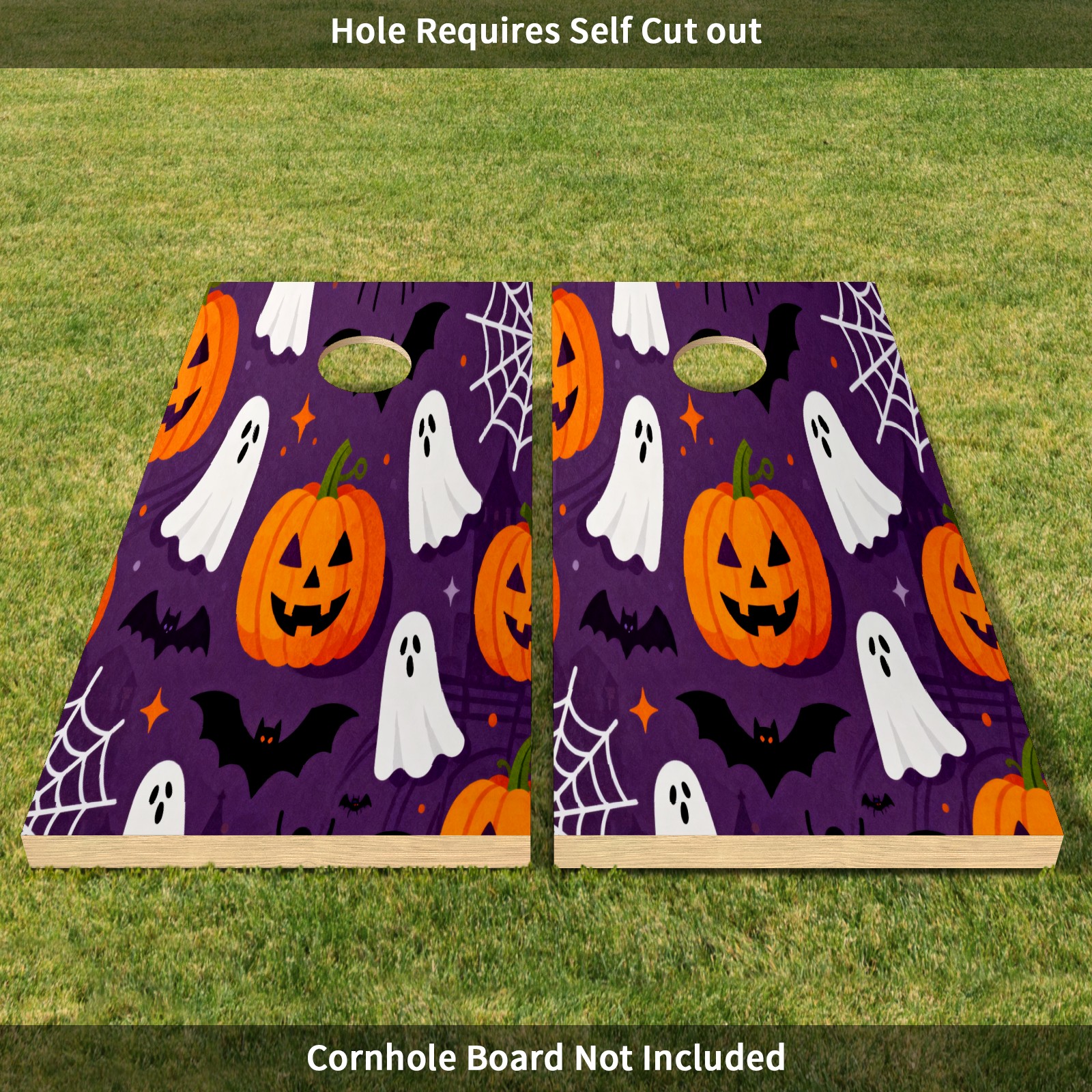 Cornhole Board Vinyl Wrap, 2-Pack Full-Size 4ft x 2ft Decal Sticker Set, Waterproof PET Material for DIY Replacement & Decoration, Easy to Apply for Indoor Outdoor Cornhole Game Purple Halloween Pumpkins
