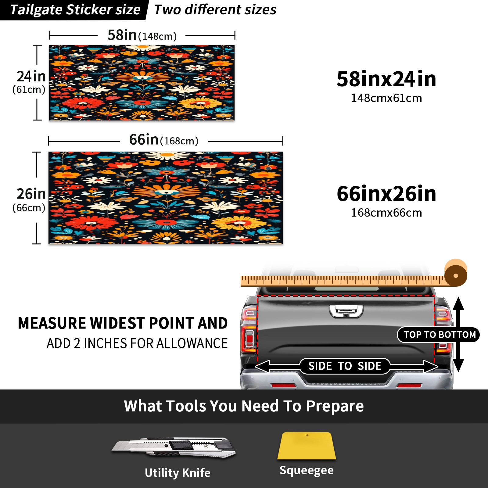 <p>Custom Pickup Truck Rear Door Stickers - The Perfect Choice for Personalized Decoration</p> <p>Add unique charm to your pickup truck with two practical size options: 148x61cm (58inx24in) and 168x66cm (66x26in), perfectly fitting various pickup truck rear doors.</p> <p>Made from premium PET material, these stickers offer excellent waterproof and durable performance, maintaining their beauty for a long time regardless of weather conditions. Installation is simple and easy: simply measure your door size, clean the surface, peel off the backing adhesive, apply smoothly, remove air bubbles, and precisely cut the handle position for a professional-grade installation.</p>