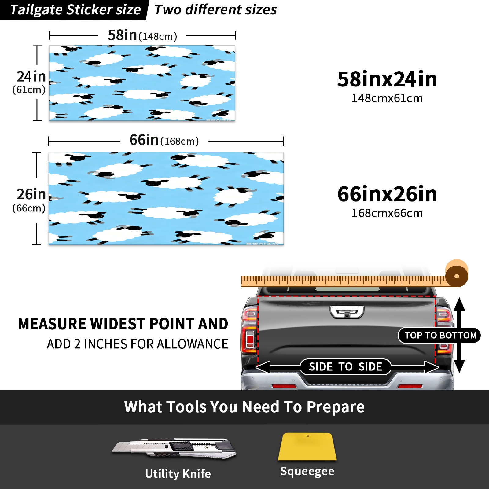 <p>Custom Pickup Truck Rear Door Stickers - The Perfect Choice for Personalized Decoration</p> <p>Add unique charm to your pickup truck with two practical size options: 148x61cm (58inx24in) and 168x66cm (66x26in), perfectly fitting various pickup truck rear doors.</p> <p>Made from premium PET material, these stickers offer excellent waterproof and durable performance, maintaining their beauty for a long time regardless of weather conditions. Installation is simple and easy: simply measure your door size, clean the surface, peel off the backing adhesive, apply smoothly, remove air bubbles, and precisely cut the handle position for a professional-grade installation.</p>