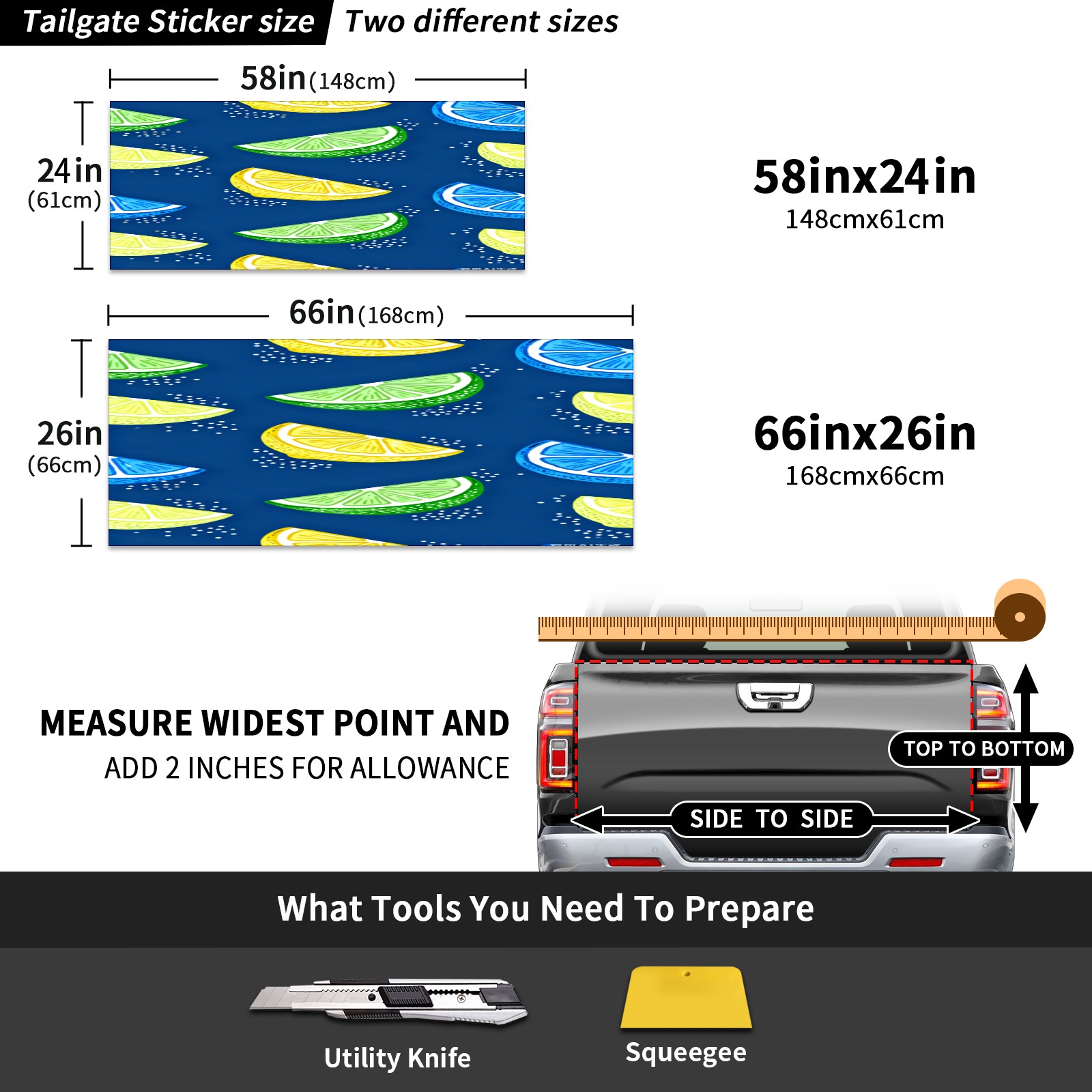 <p>Custom Pickup Truck Rear Door Stickers - The Perfect Choice for Personalized Decoration</p> <p>Add unique charm to your pickup truck with two practical size options: 148x61cm (58inx24in) and 168x66cm (66x26in), perfectly fitting various pickup truck rear doors.</p> <p>Made from premium PET material, these stickers offer excellent waterproof and durable performance, maintaining their beauty for a long time regardless of weather conditions. Installation is simple and easy: simply measure your door size, clean the surface, peel off the backing adhesive, apply smoothly, remove air bubbles, and precisely cut the handle position for a professional-grade installation.</p>