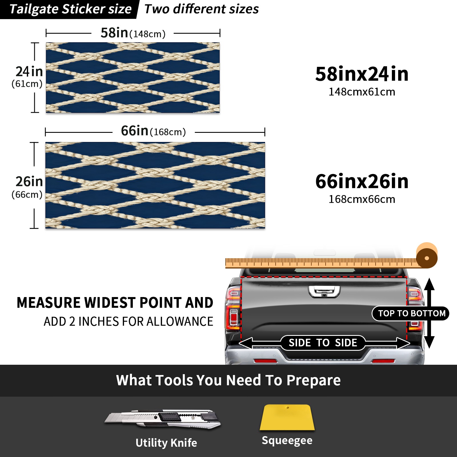 • <p>Custom Pickup Truck Rear Door Stickers - The Perfect Choice for Personalized Decoration</p> <p>Add unique charm to your pickup truck with two practical size options: 148x61cm (58inx24in) and 168x66cm (66x26in), perfectly fitting various pickup truck rear doors.</p> <p>Made from premium PET material, these stickers offer excellent waterproof and durable performance, maintaining their beauty for a long time regardless of weather conditions. Installation is simple and easy: simply measure your door size, clean the surface, peel off the backing adhesive, apply smoothly, remove air bubbles, and precisely cut the handle position for a professional-grade installation.</p>
