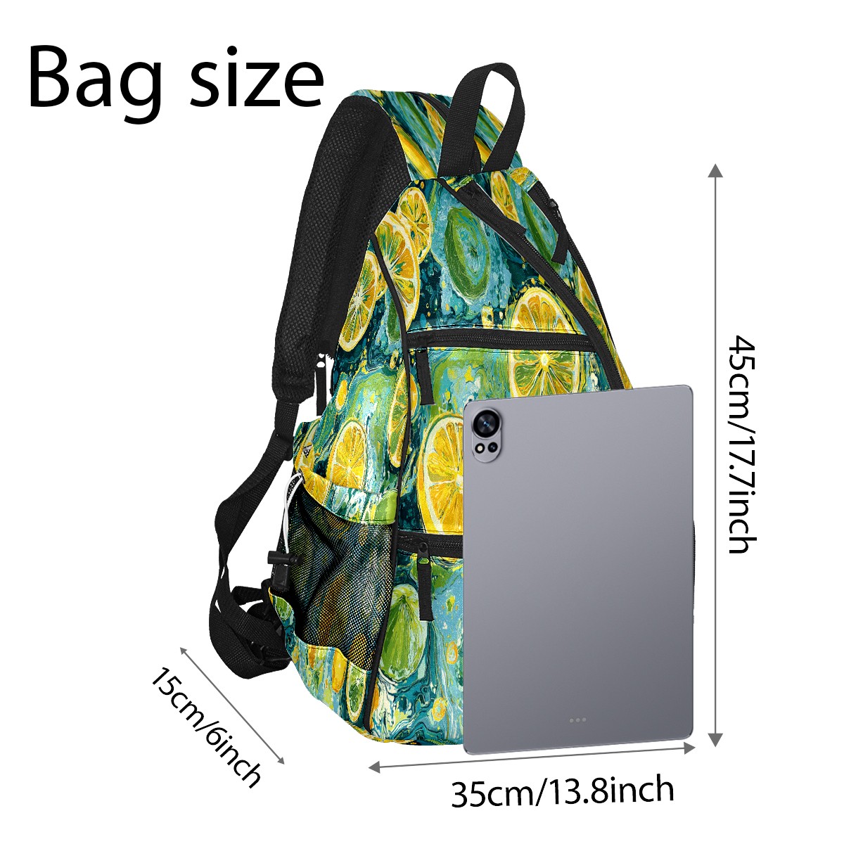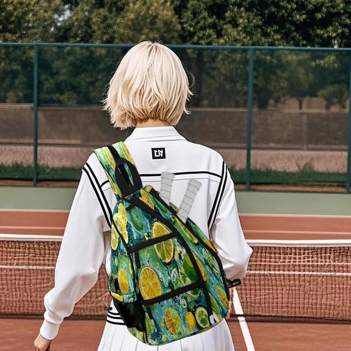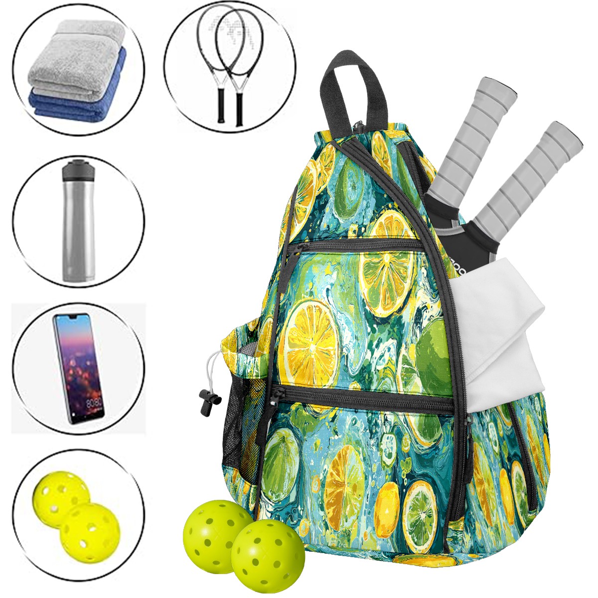 Pickleball Bag with Padded Back, Green Lemon Pattern Multi-Compartment Paddle Backpack, Lightweight Nylon Sports Bag for Men & Women