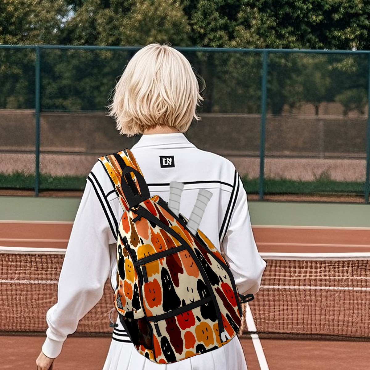 Pickleball Bag with Padded Back, Orange Halloween Faces Multi-Compartment Paddle Backpack, Lightweight Nylon Sports Bag for Men & Women
