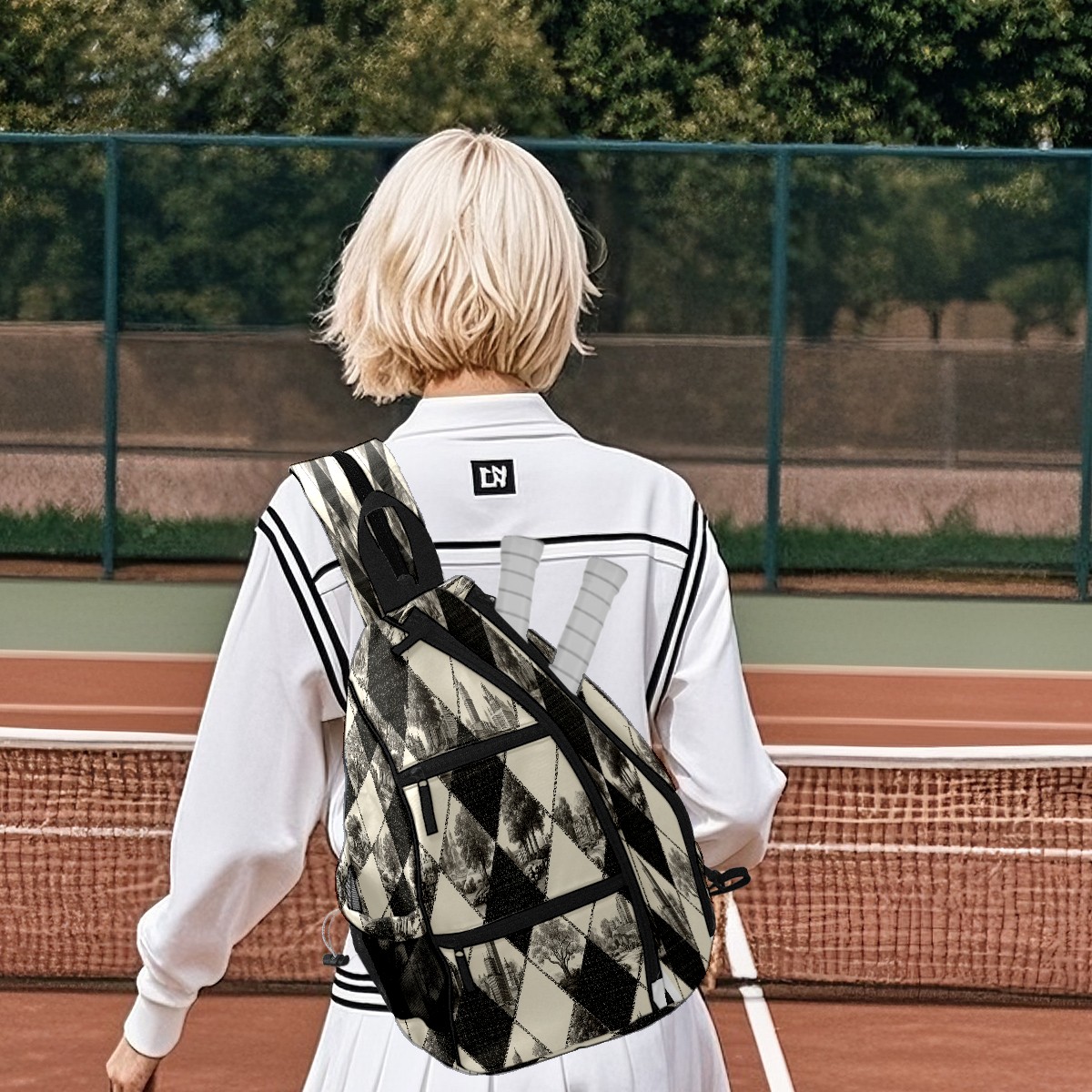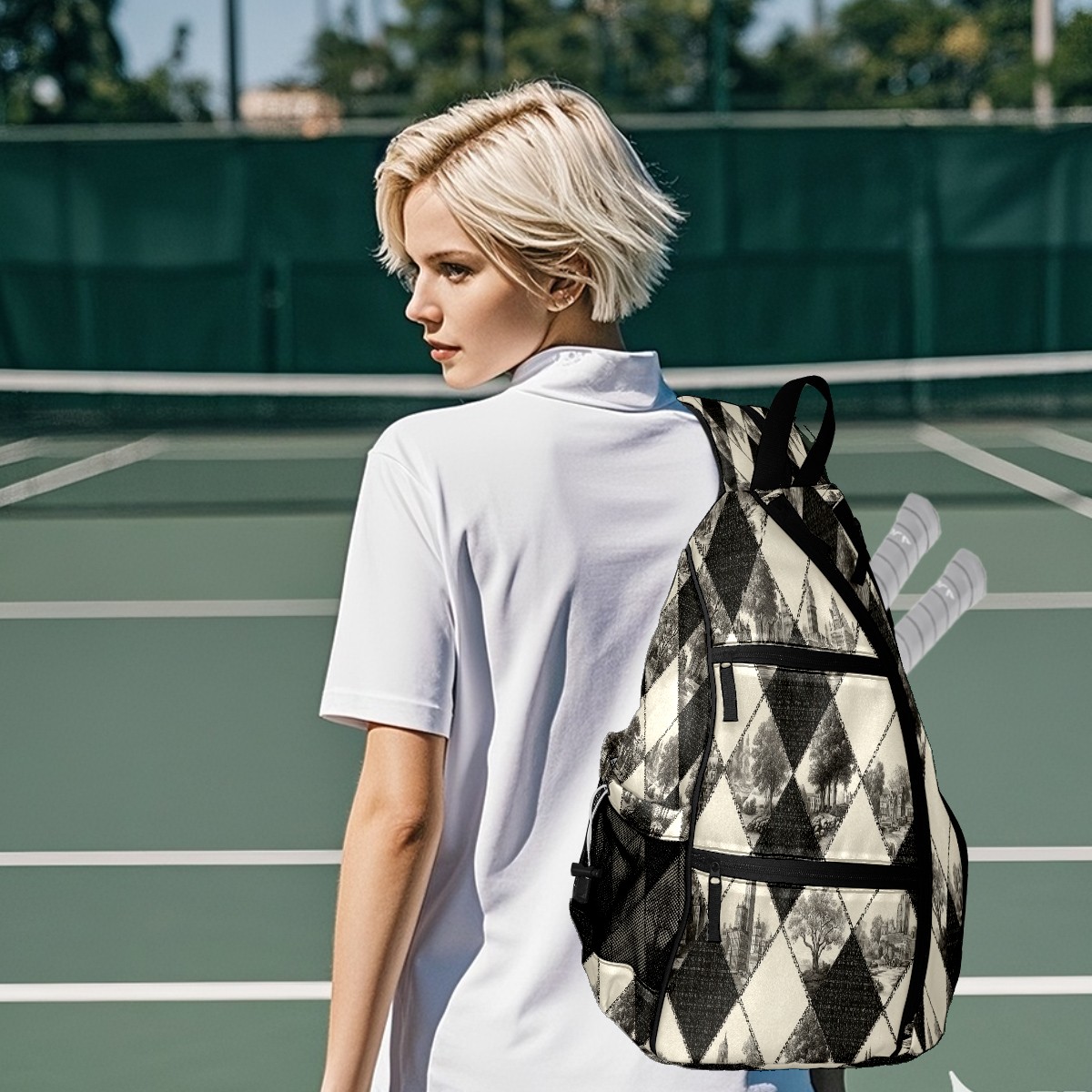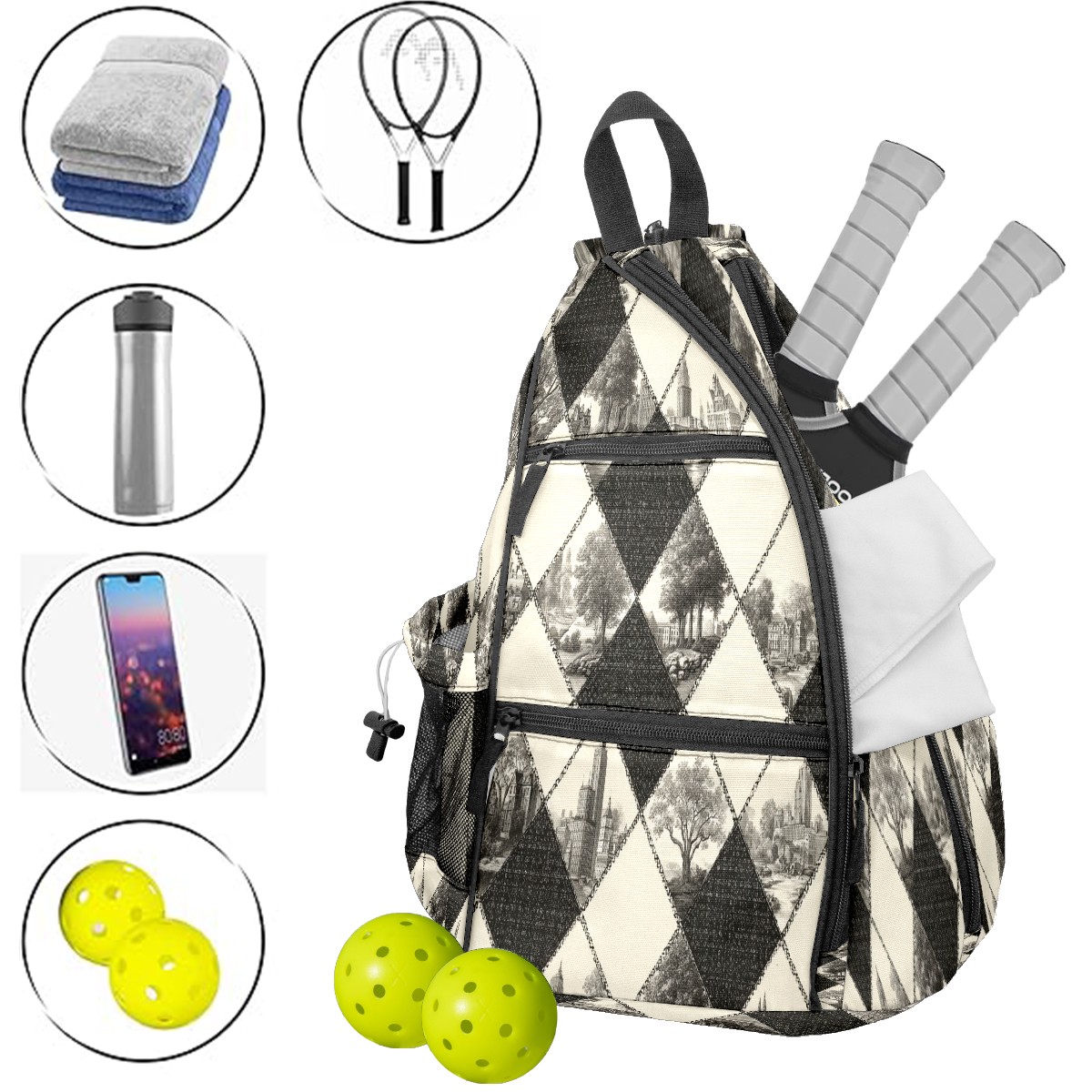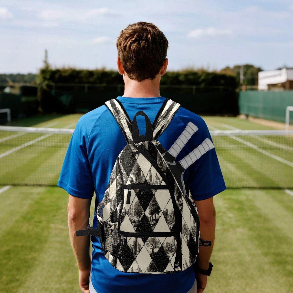 Pickleball Bag with Padded Back, Argyle BlackWhite Multi-Compartment Paddle Backpack, Lightweight Nylon Sports Bag for Men & Women