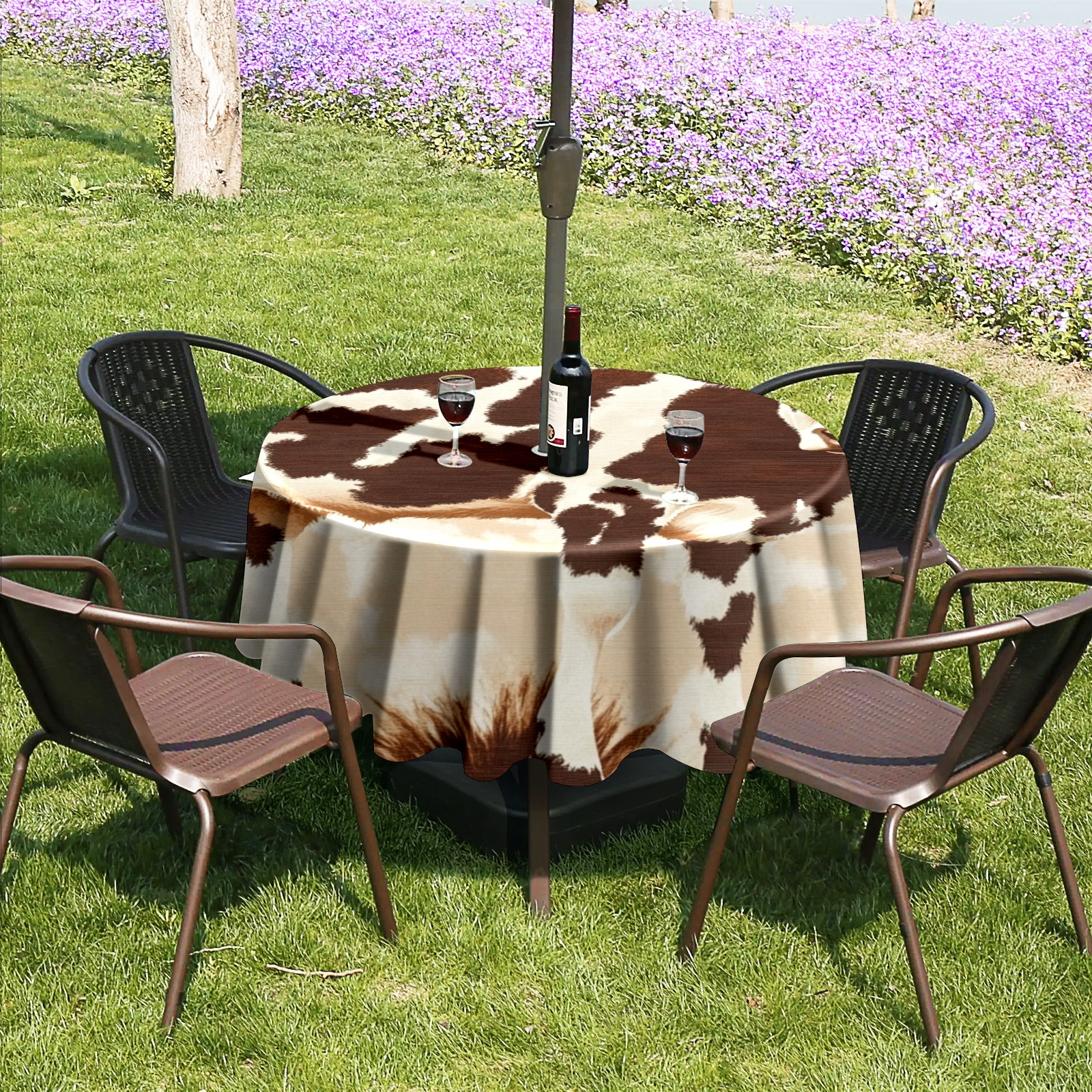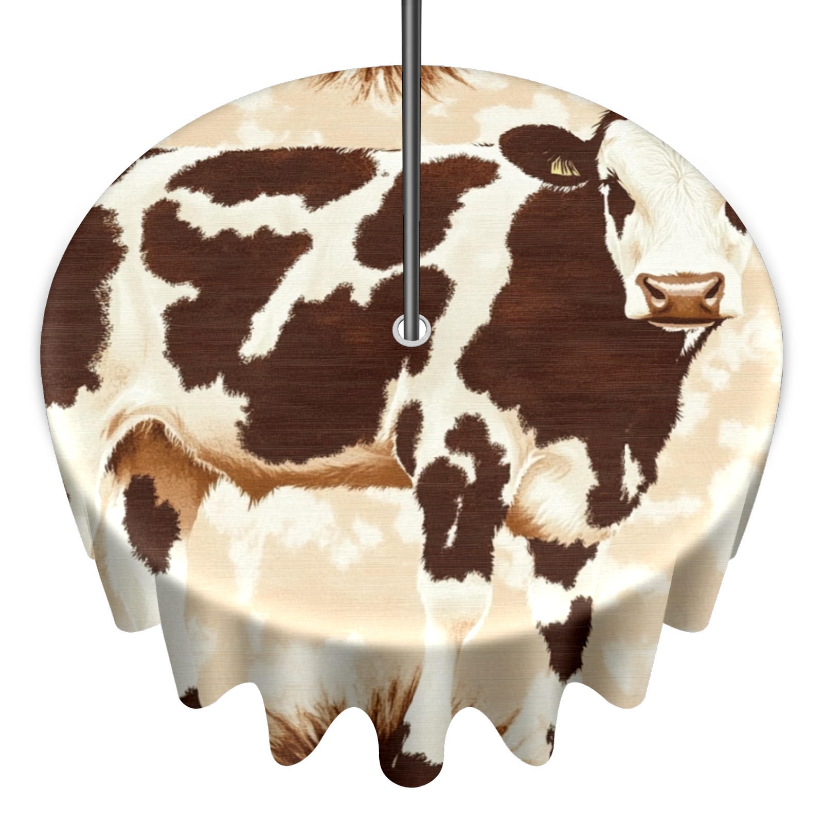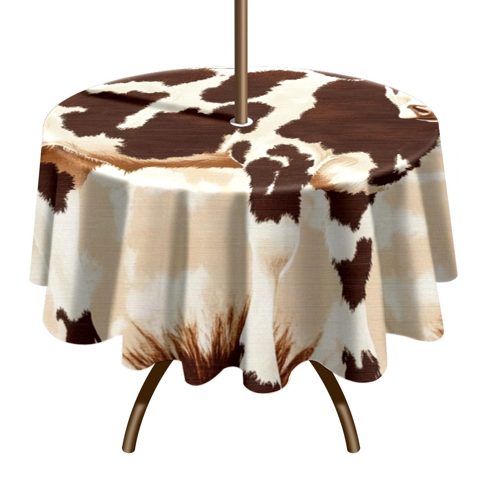 Round Tablecloth with Adjustable Zippered Umbrella Hole Polyester Table Cover Easy Install for Patio, Restaurant & Outdoor Dining Cow Pattern (60in)