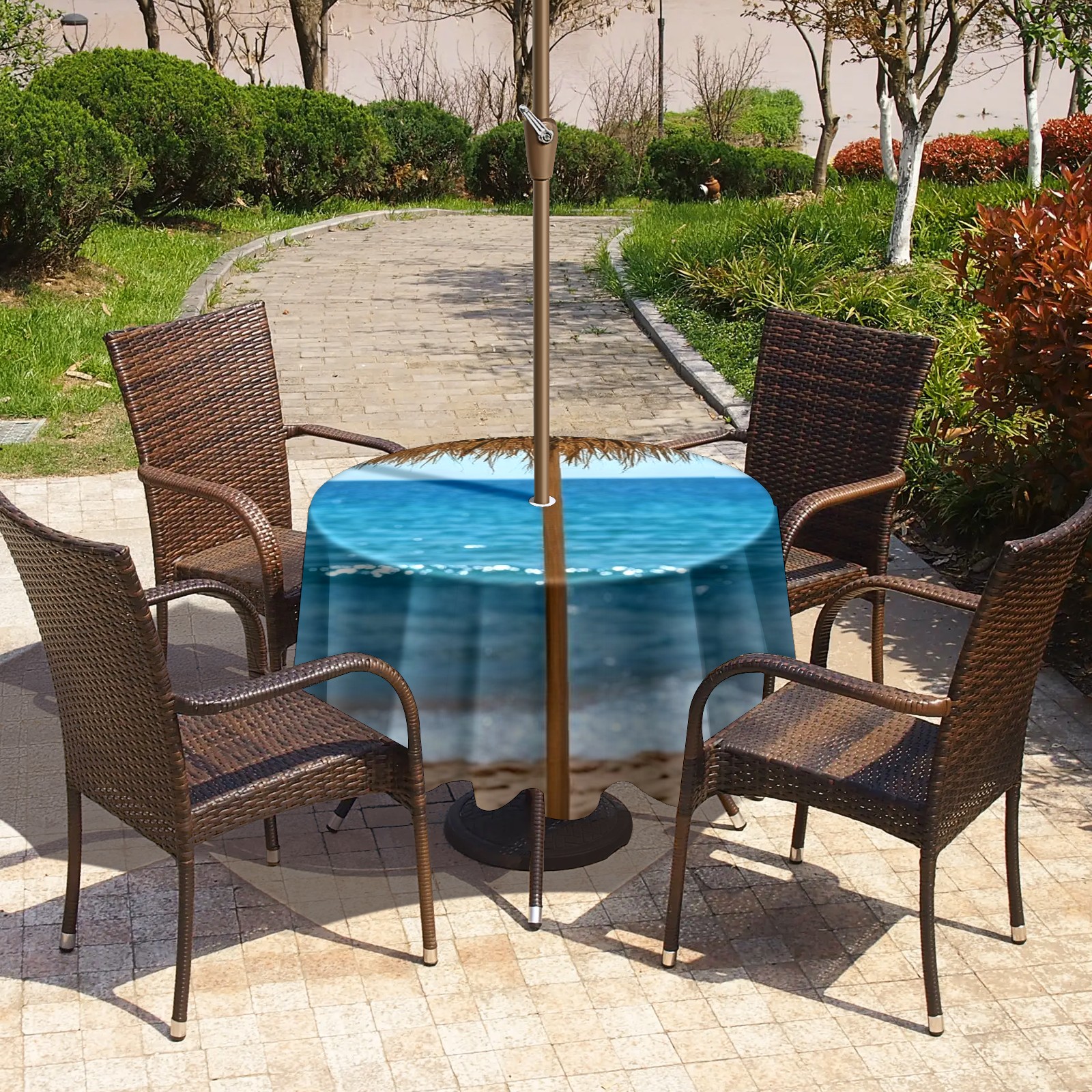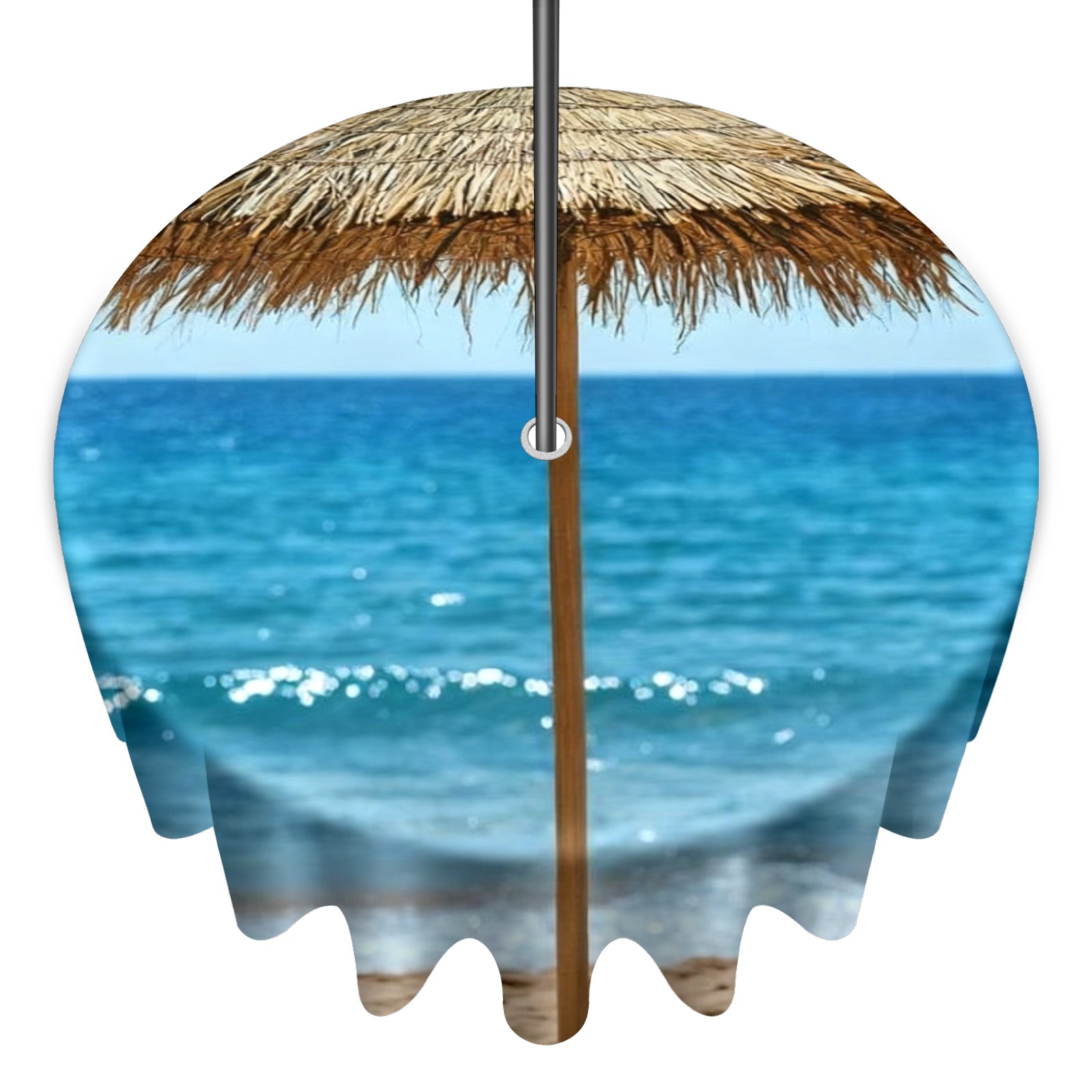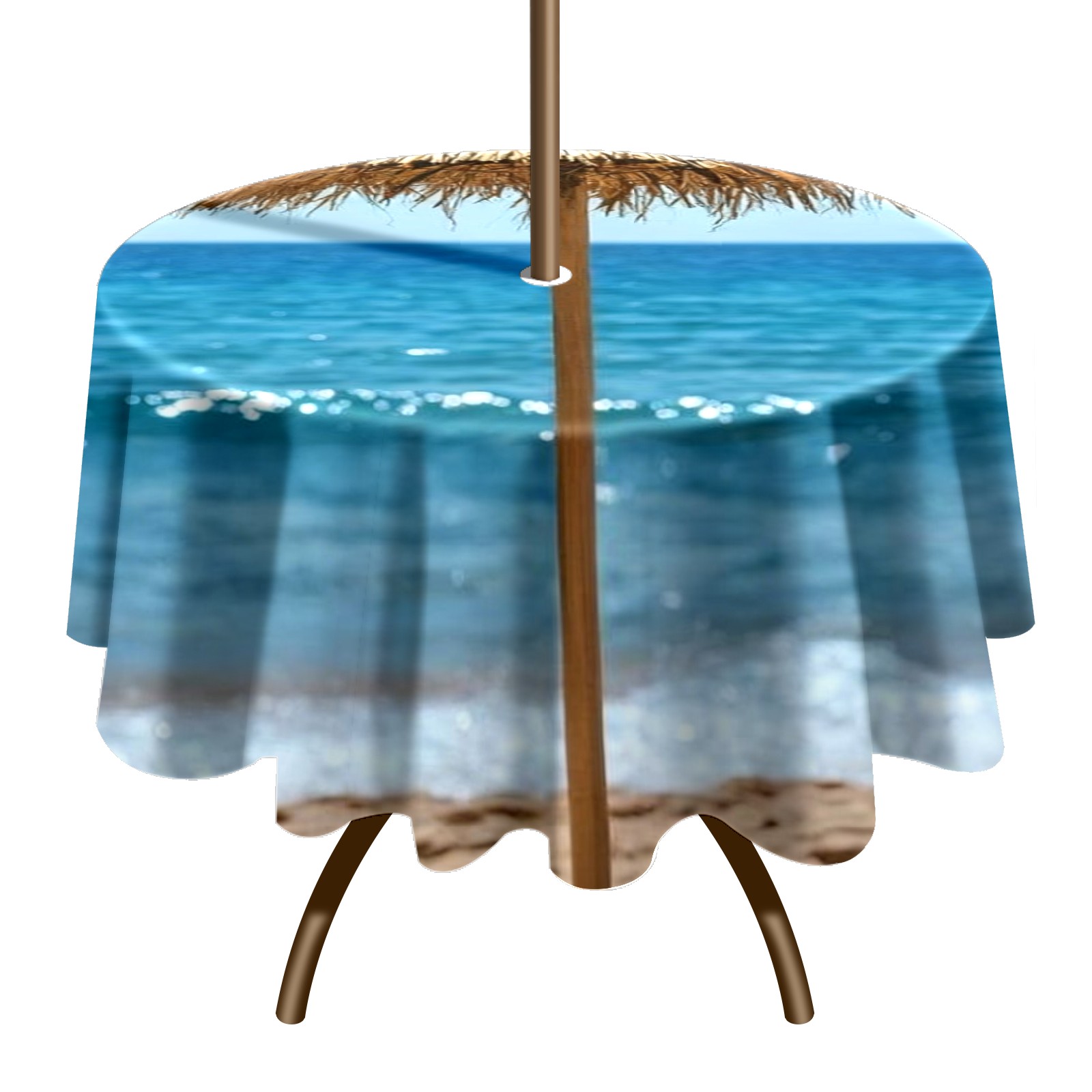Round Tablecloth with Adjustable Zippered Umbrella Hole Polyester Table Cover Easy Install for Patio, Restaurant & Outdoor Dining Beach Umbrella Scene Pattern (60in)
