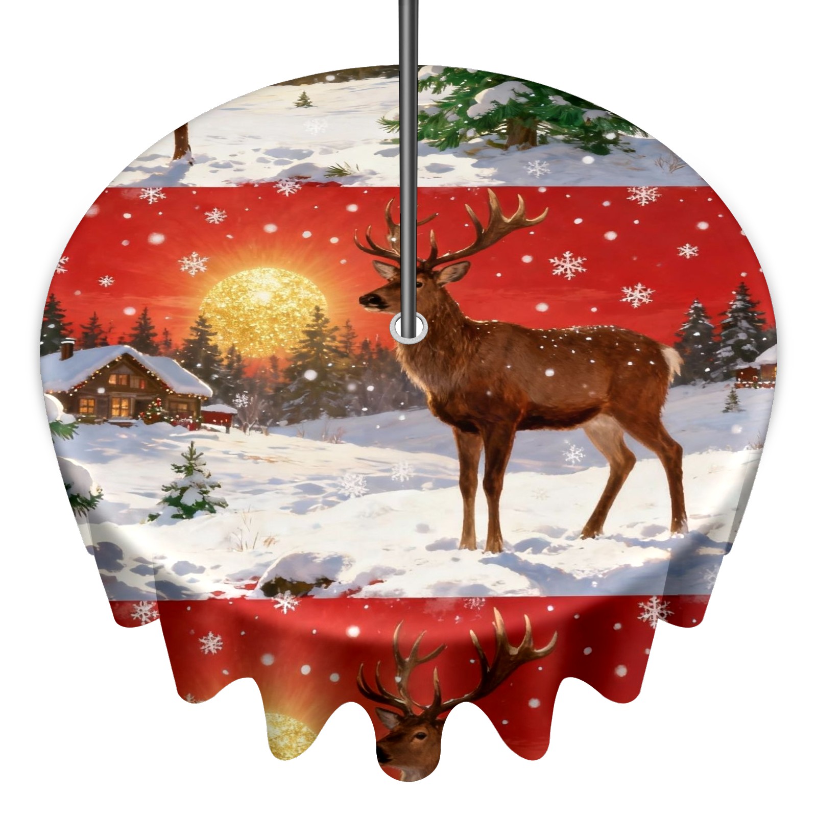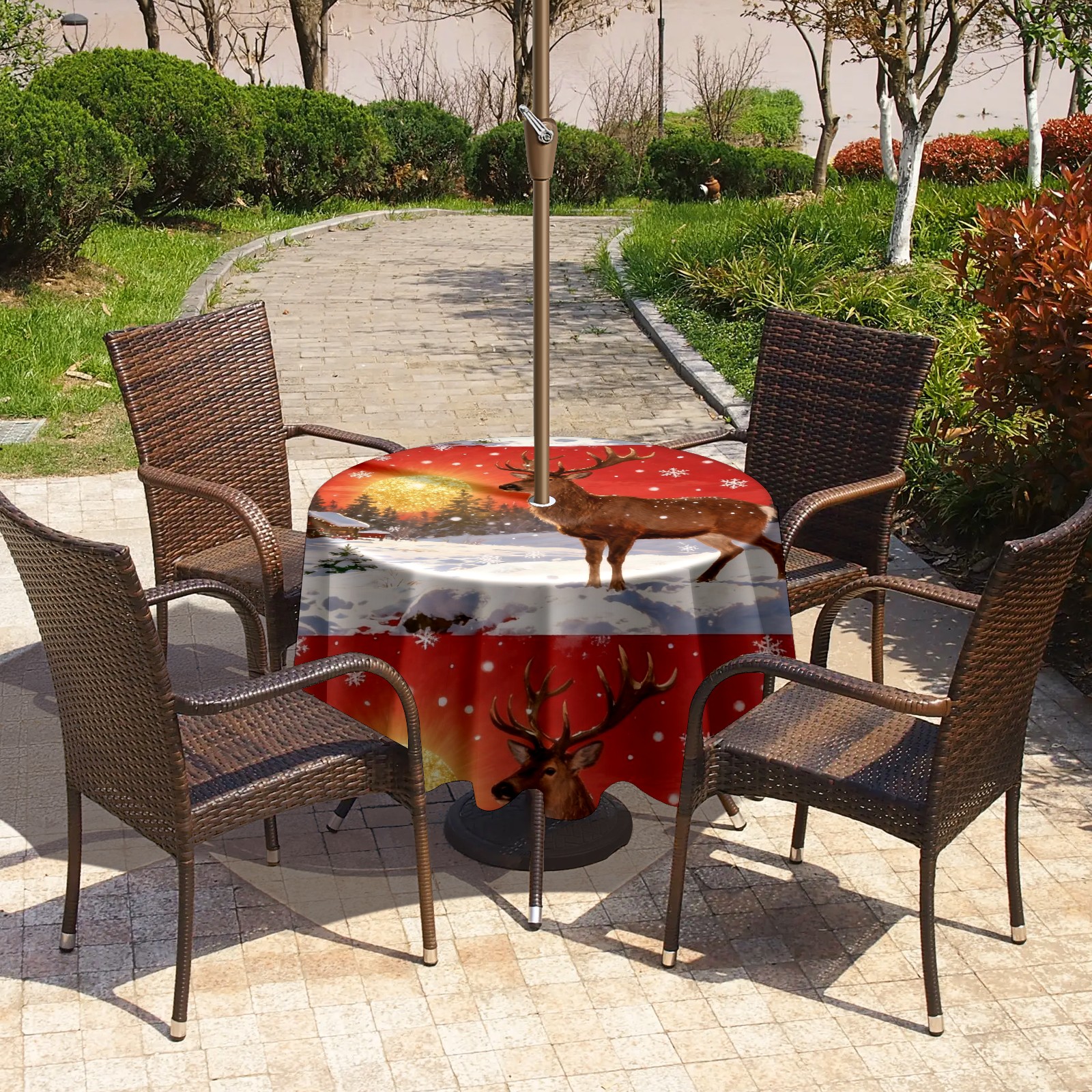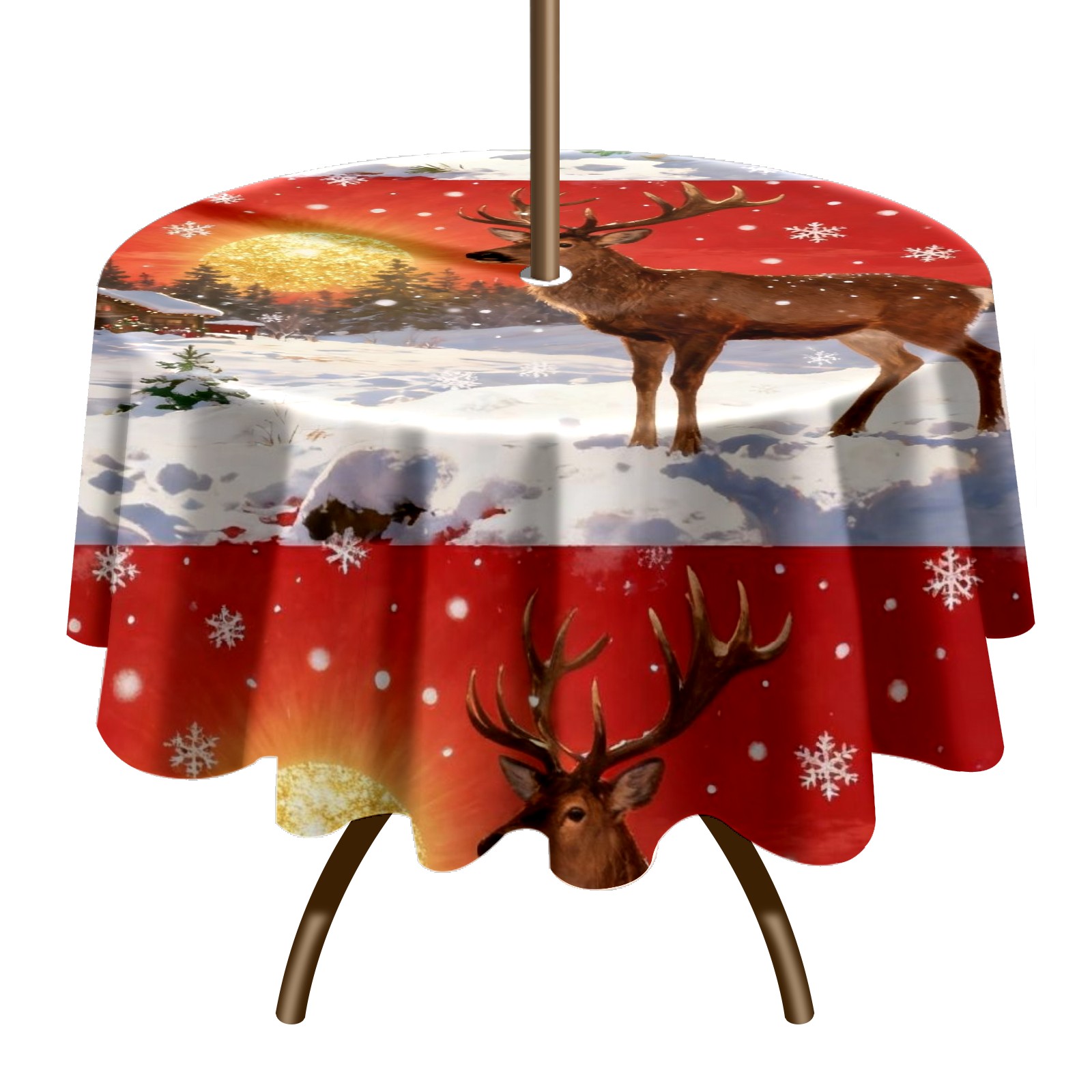 Round Tablecloth with Adjustable Zippered Umbrella Hole Polyester Table Cover Easy Install for Patio, Restaurant & Outdoor Dining Christmas Deer Pattern (60in)