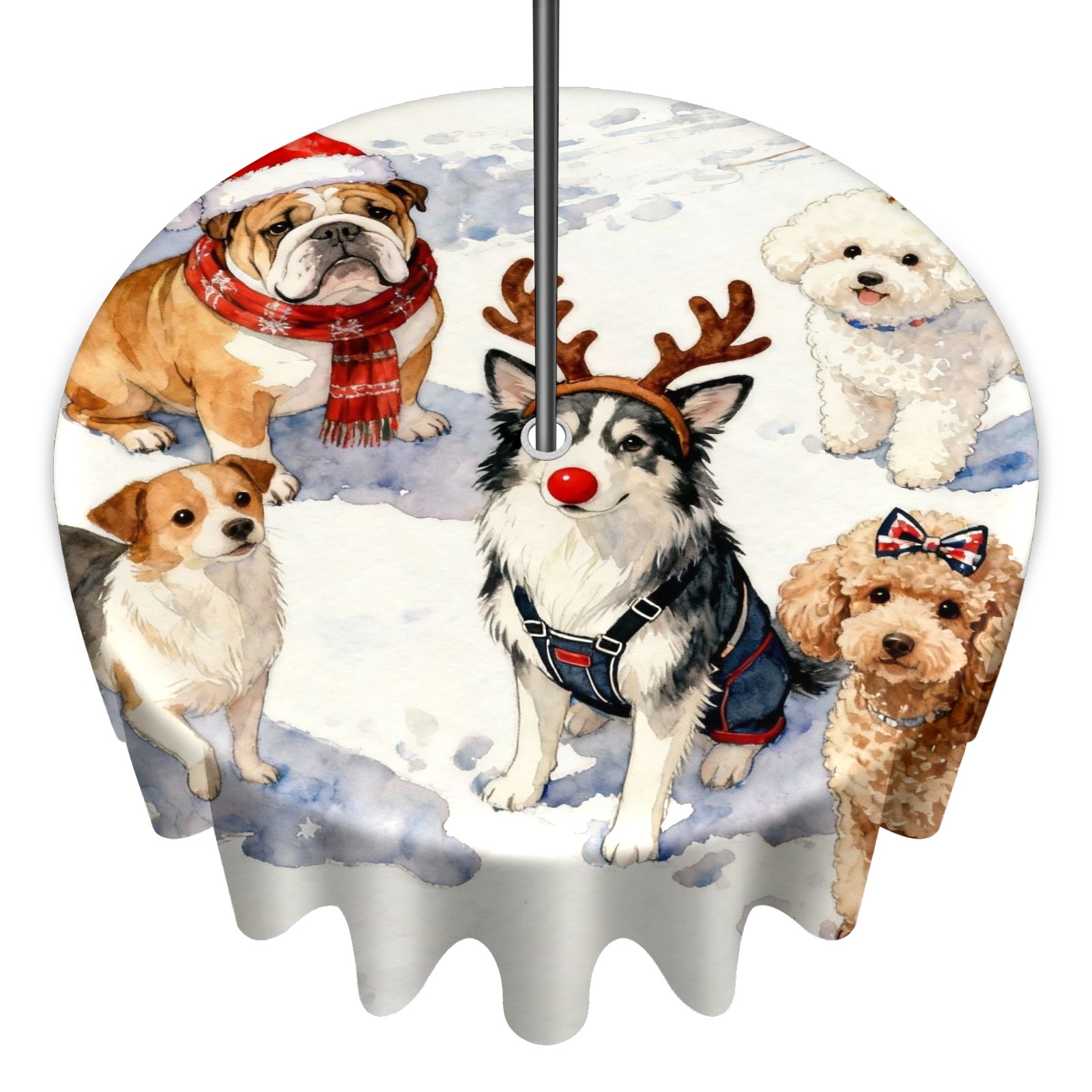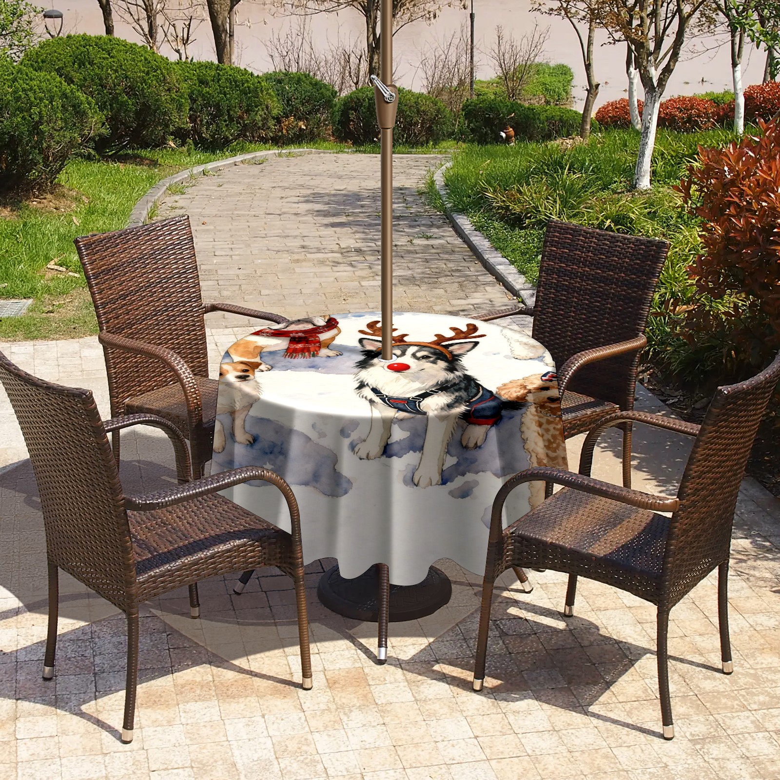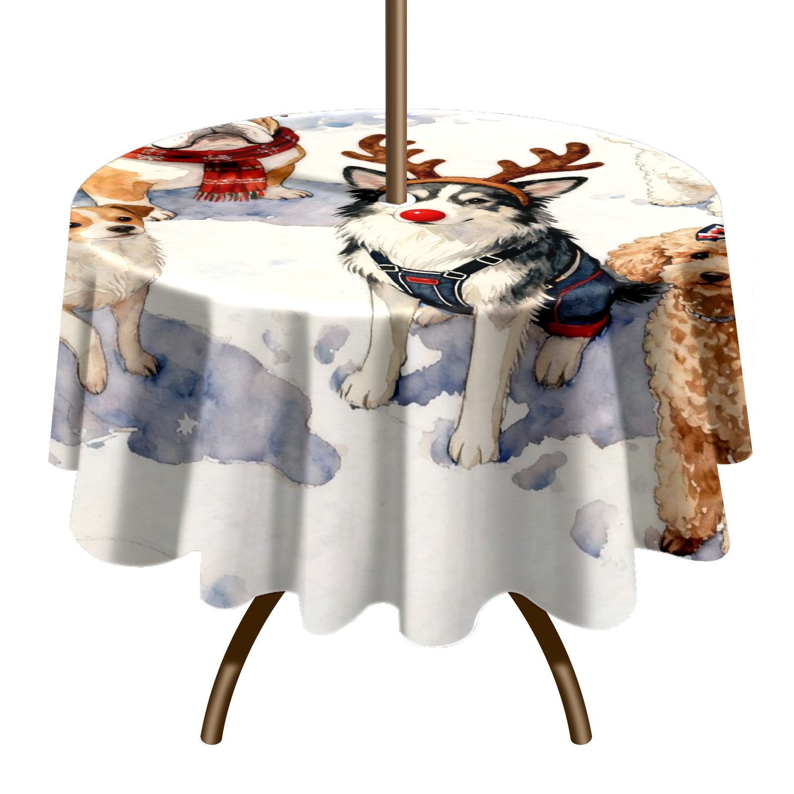 Round Tablecloth with Adjustable Zippered Umbrella Hole Polyester Table Cover Easy Install for Patio, Restaurant & Outdoor Dining Christmas Dog Group Pattern (60in)