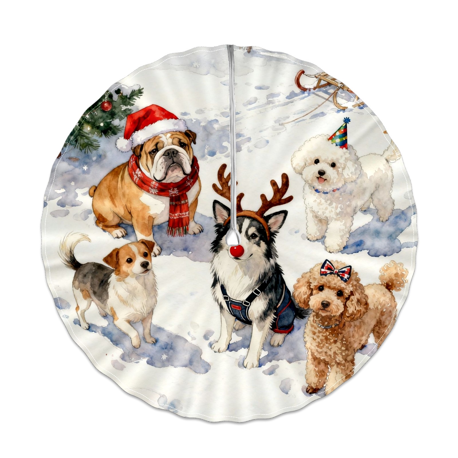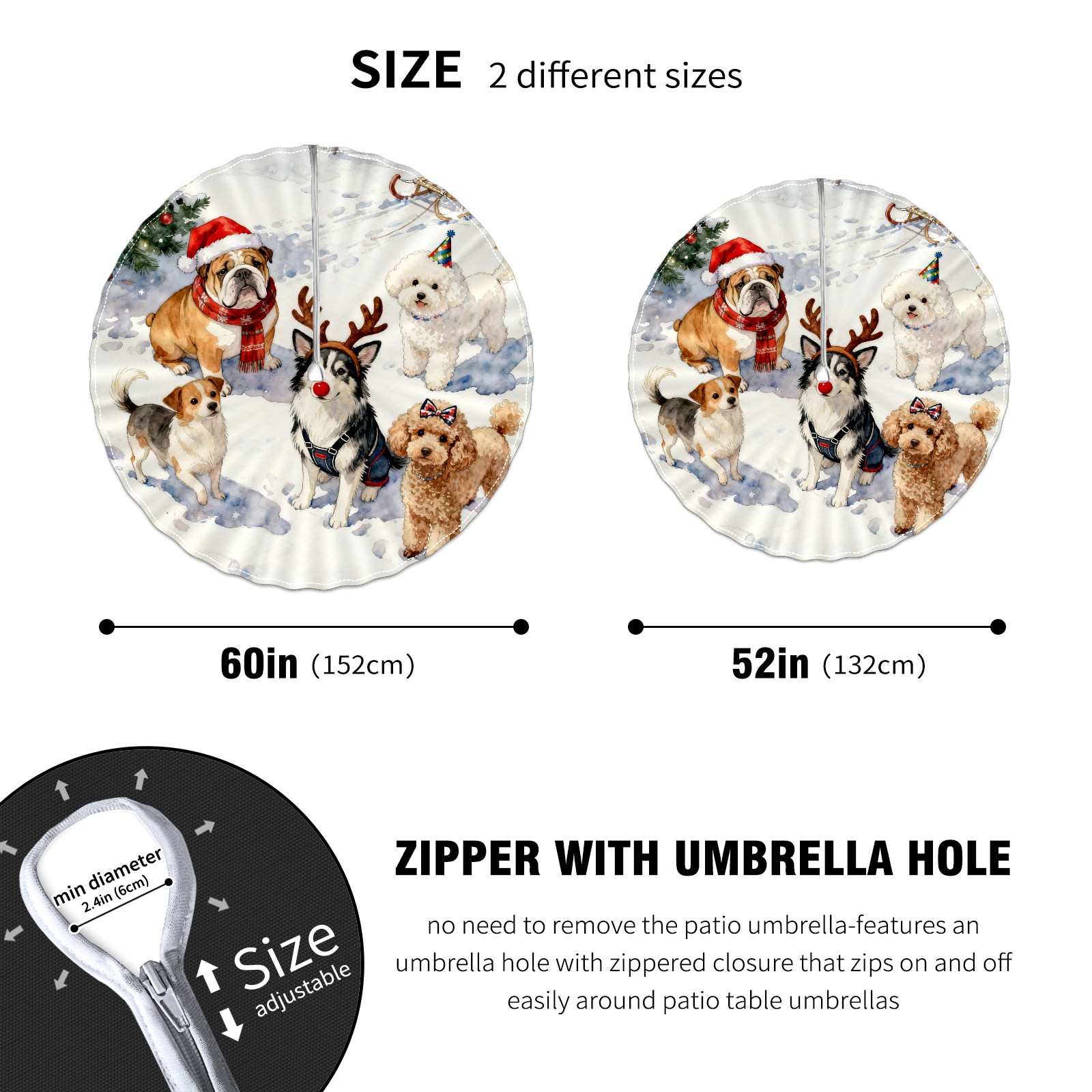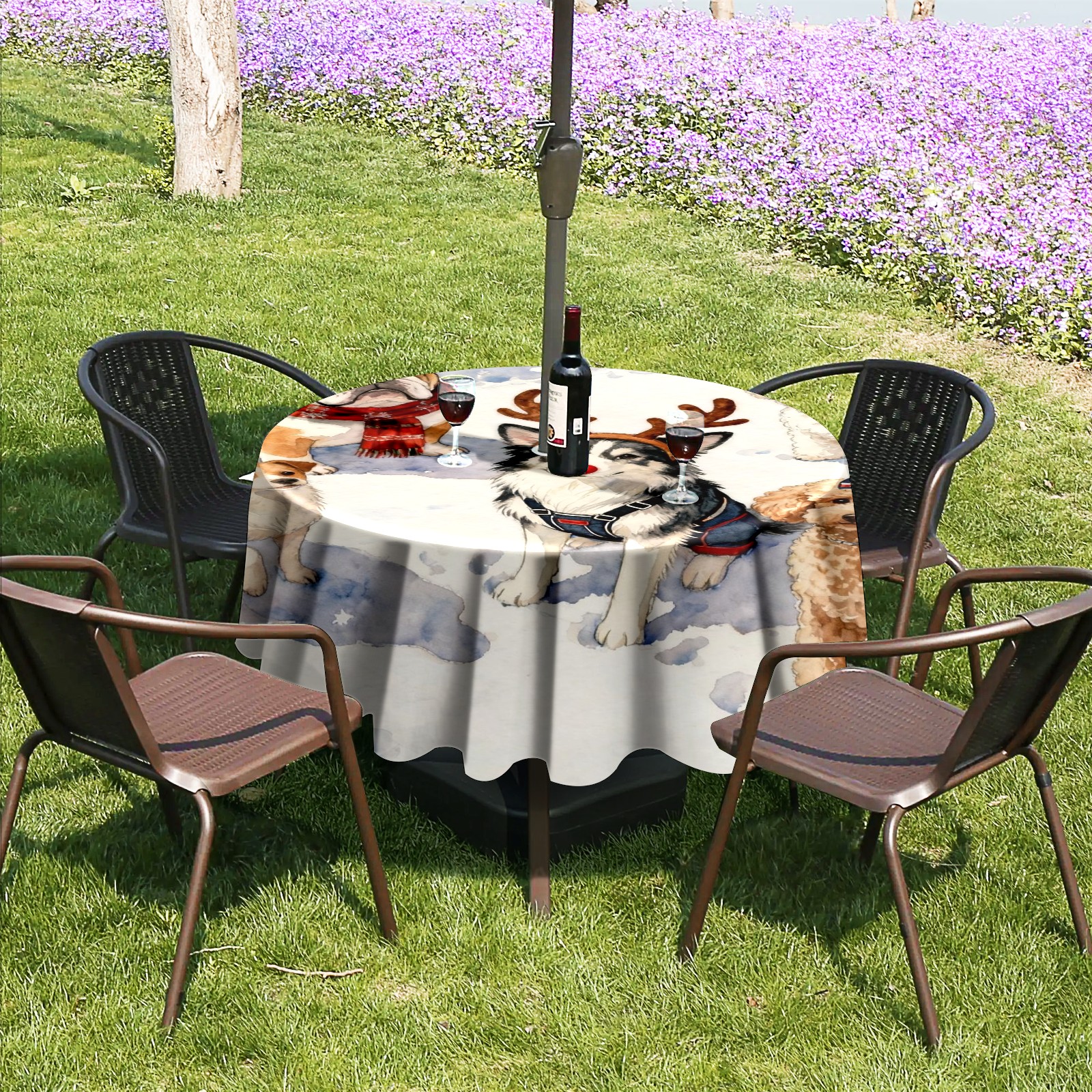 Round Tablecloth with Adjustable Zippered Umbrella Hole Polyester Table Cover Easy Install for Patio, Restaurant & Outdoor Dining Christmas Dog Group Pattern (60in)