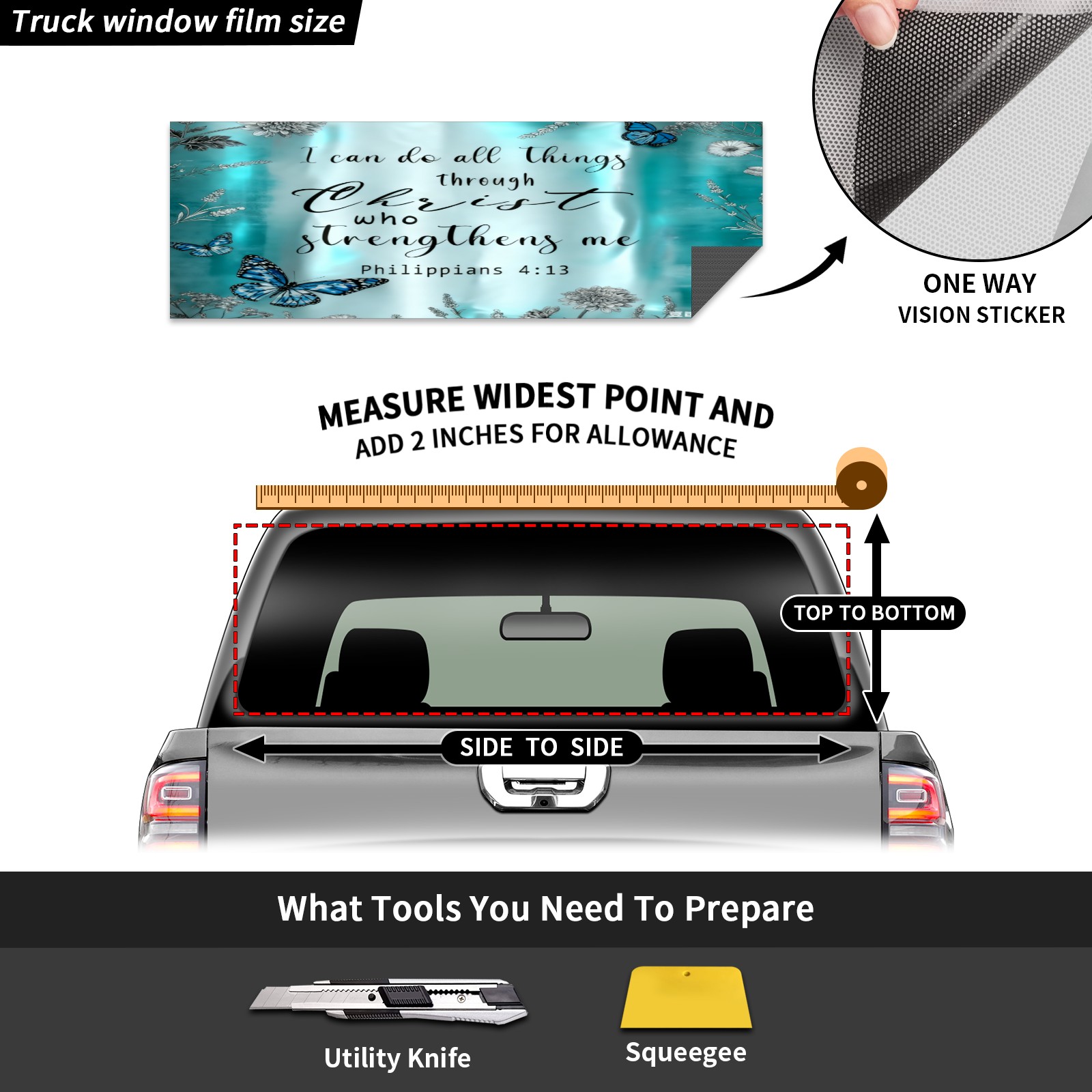 • ●<b>Truck Rear Window Graphics Decals Pickup Trucks Back Window Film Stickers 66" x 22" Perforated Vinyl Wrap Stickers Decorations for Car Rear Window.</b><br> <br> <b>Features :</b><br> - Size of the rear window decals for trucks is 66x22 Inches (168x56cm).<br> - High quality perforated vinyl window film, one way vision sticker.<br> - Perforated is see through from the inside but not from outside.<br> - Clear printing, waterproof and continued.<br> - The car back window graphics stickers fits most truck and makes your vehicle more beautiful.<br> <br> <b>【Installation Instructions】</b><br> <b>1. CLEAN SURFACE - </b>Clean the rear window thoroughly and make sure the surface clean.<br> <b>2. STICK THE DECALS - </b>Tear off the paper on the back and stick the decal on the window.<br> <b>3. SCRAPE OFF AIR BUBBLES - </b>Use a squeegee or other card to scrape off the excess air bubbles.<br> <b>4. TRIM THE EXCESS -</b> Use a knife to cut off the excess stickers of the window, finally complete.<br> 1. Please measure the size before purchasing, back window graphics decal for truck can be cut to your desired size.<br> 2.The graphics stickers for truck back window is a great gift for yourself also can as a birthday / halloween / christmas gift for your friends and family.<br> <b>Decorate Your Pickup Truck With Rear Window Decal Today!</b>
