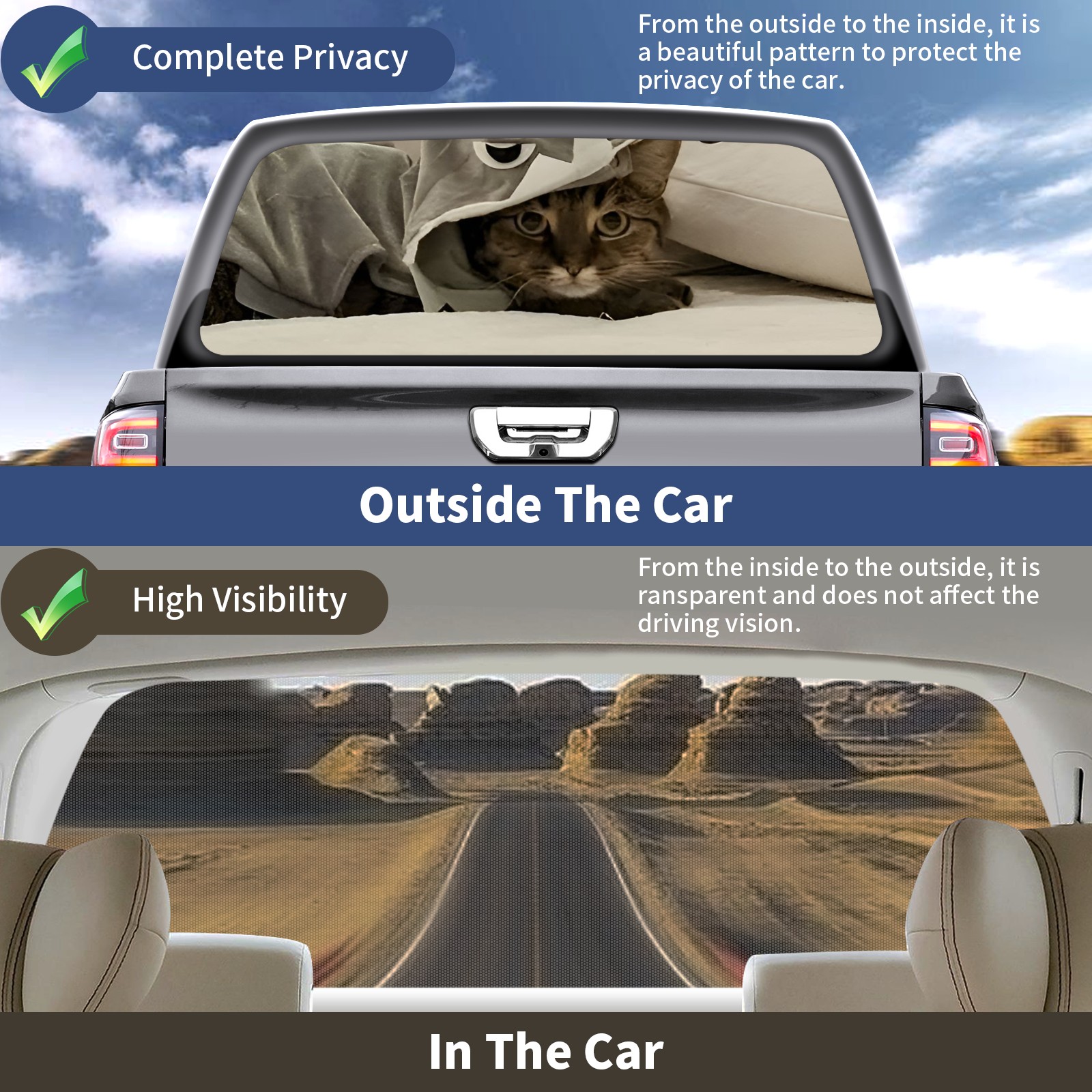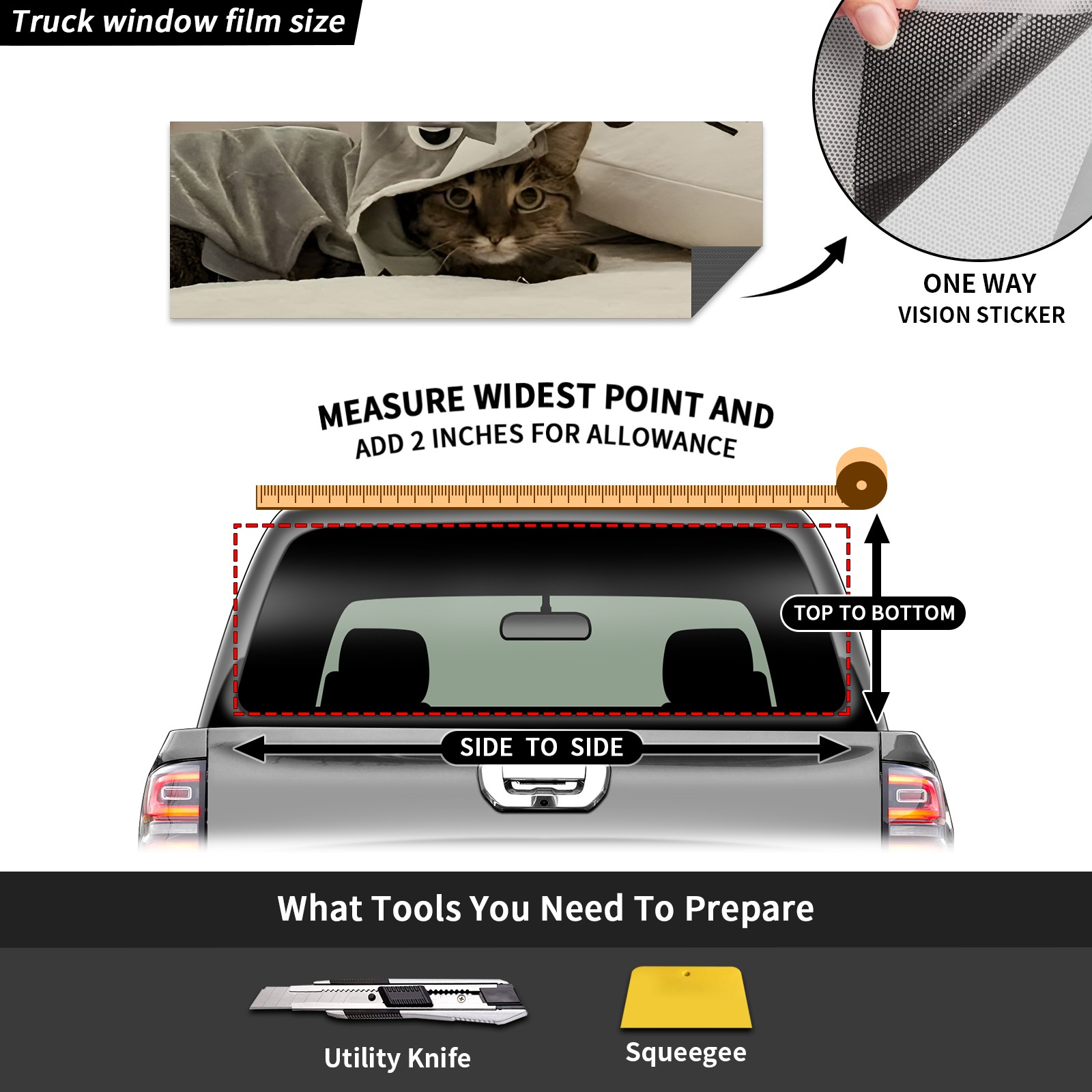 ●<b>Truck Rear Window Graphics Decals Pickup Trucks Back Window Film Stickers 66" x 22" Perforated Vinyl Wrap Stickers Decorations for Car Rear Window.</b><br> <br> <b>Features :</b><br> - Size of the rear window decals for trucks is 66x22 Inches (168x56cm).<br> - High quality perforated vinyl window film, one way vision sticker.<br> - Perforated is see through from the inside but not from outside.<br> - Clear printing, waterproof and continued.<br> - The car back window graphics stickers fits most truck and makes your vehicle more beautiful.<br> <br> <b>【Installation Instructions】</b><br> <b>1. CLEAN SURFACE - </b>Clean the rear window thoroughly and make sure the surface clean.<br> <b>2. STICK THE DECALS - </b>Tear off the paper on the back and stick the decal on the window.<br> <b>3. SCRAPE OFF AIR BUBBLES - </b>Use a squeegee or other card to scrape off the excess air bubbles.<br> <b>4. TRIM THE EXCESS -</b> Use a knife to cut off the excess stickers of the window, finally complete.<br> 1. Please measure the size before purchasing, back window graphics decal for truck can be cut to your desired size.<br> 2.The graphics stickers for truck back window is a great gift for yourself also can as a birthday / halloween / christmas gift for your friends and family.<br> <b>Decorate Your Pickup Truck With Rear Window Decal Today!</b>