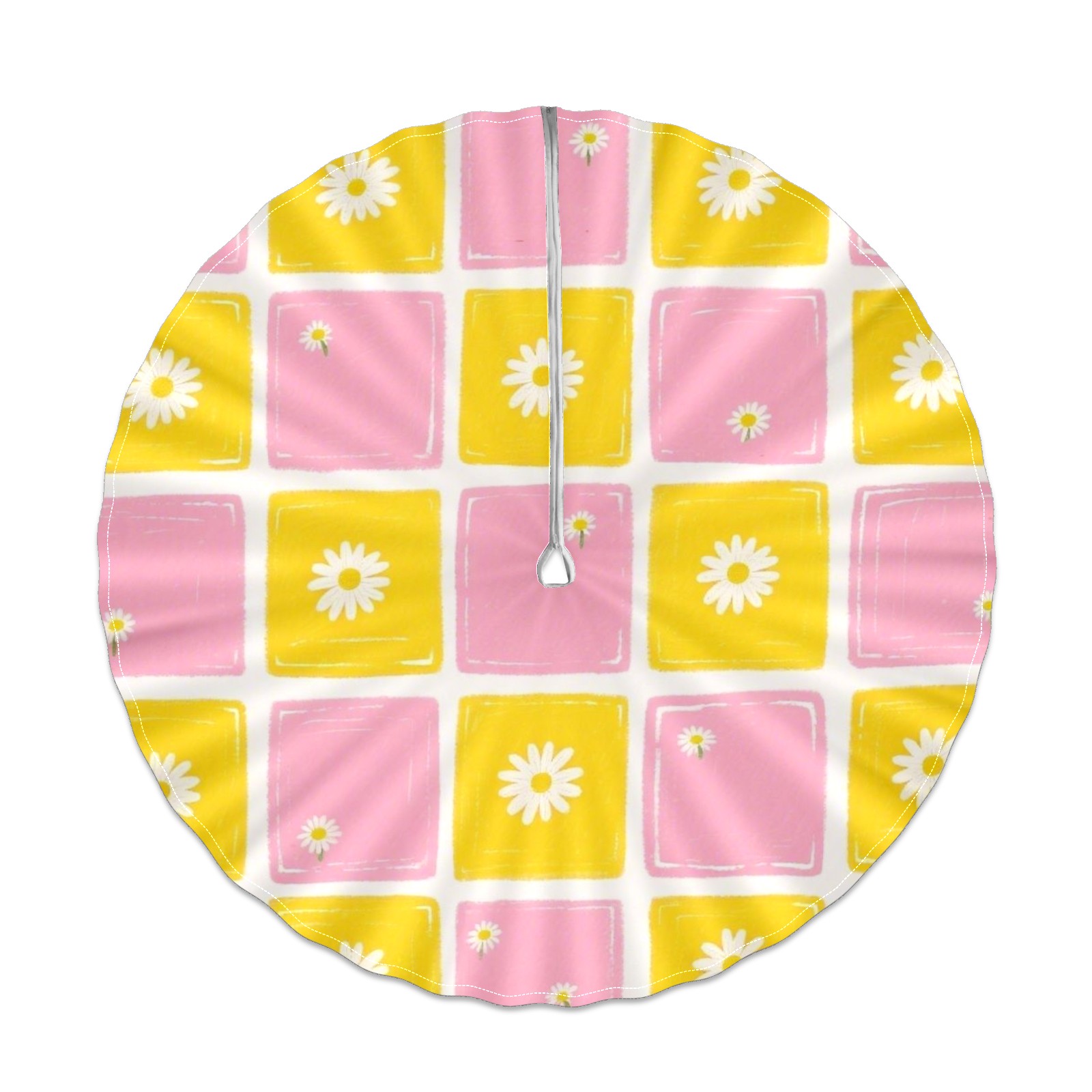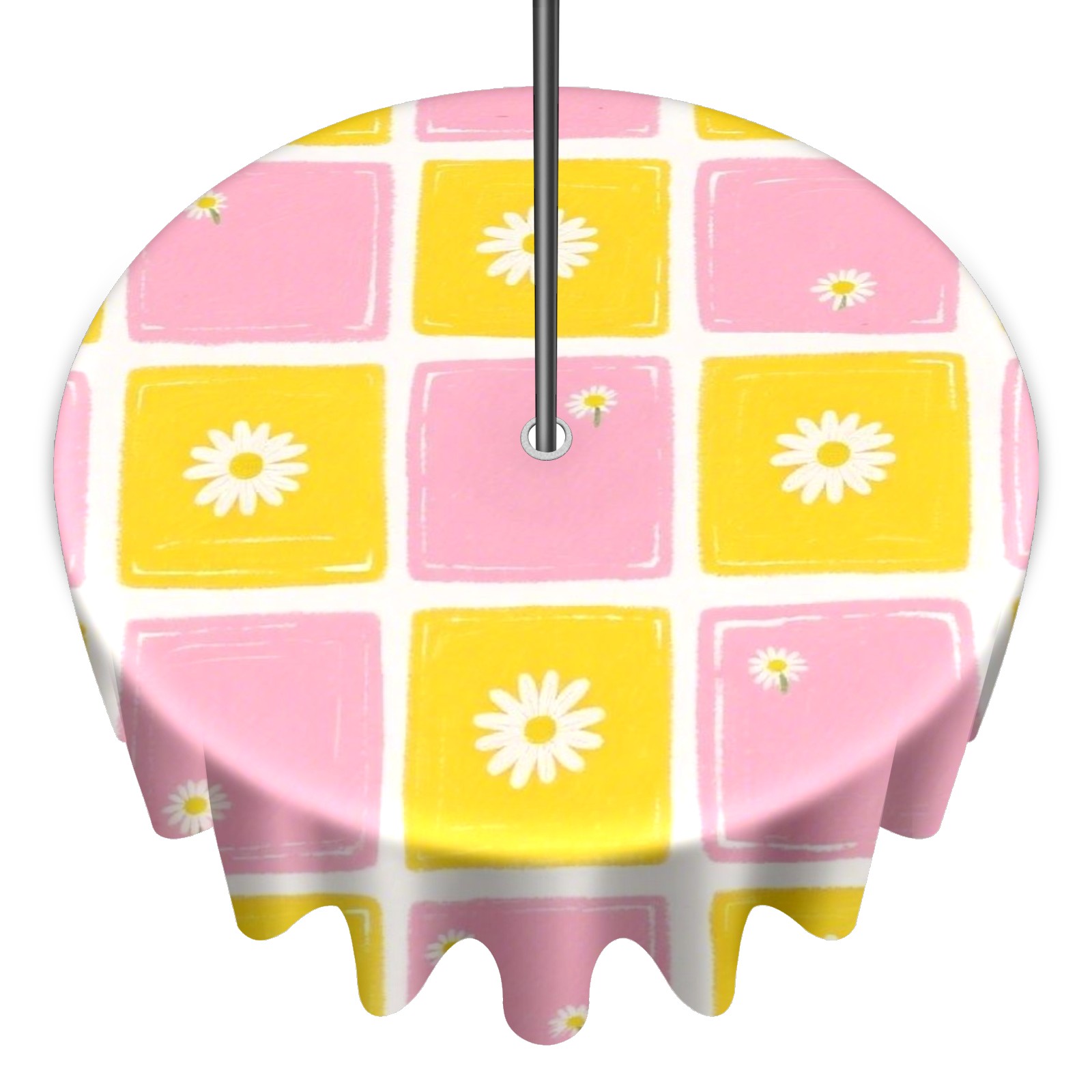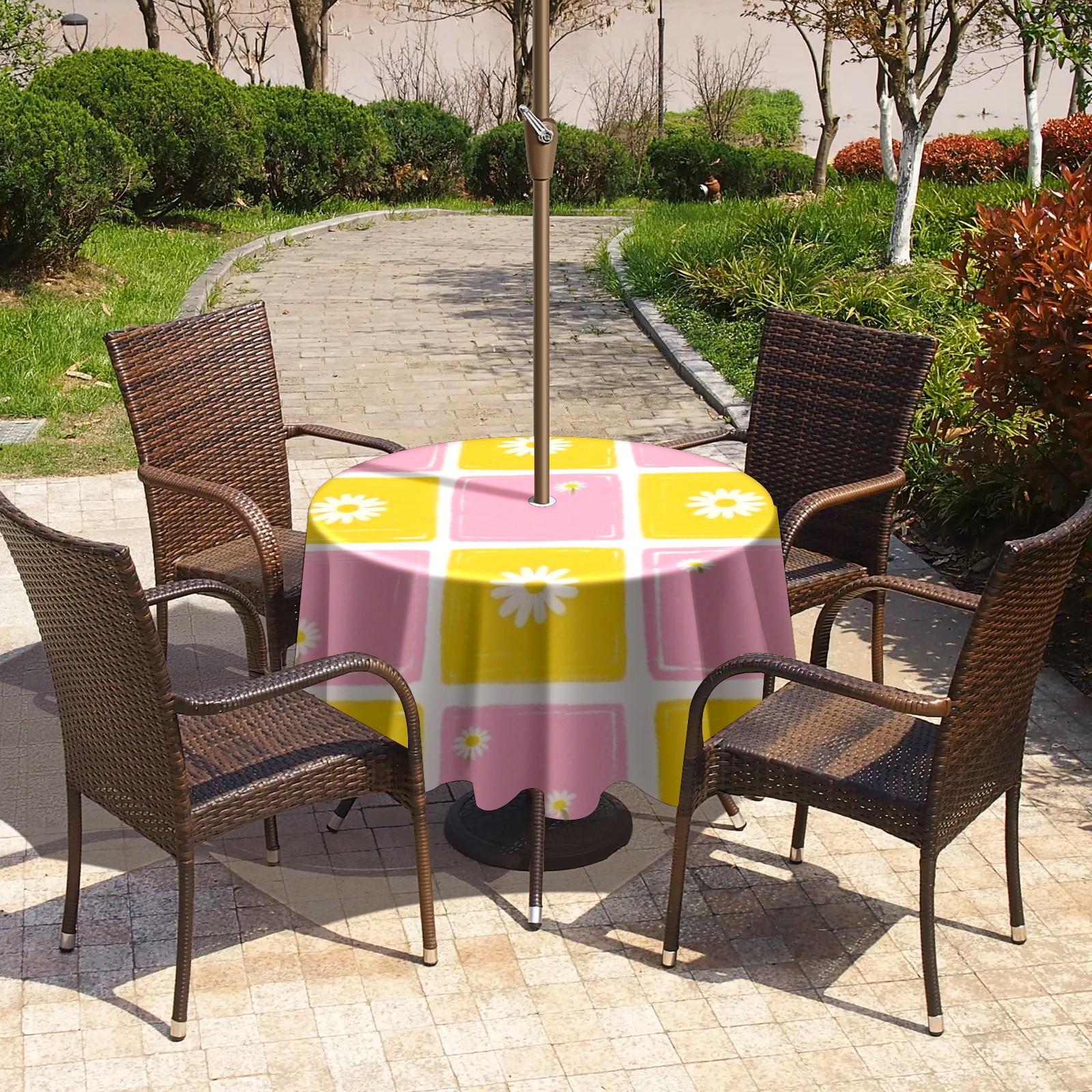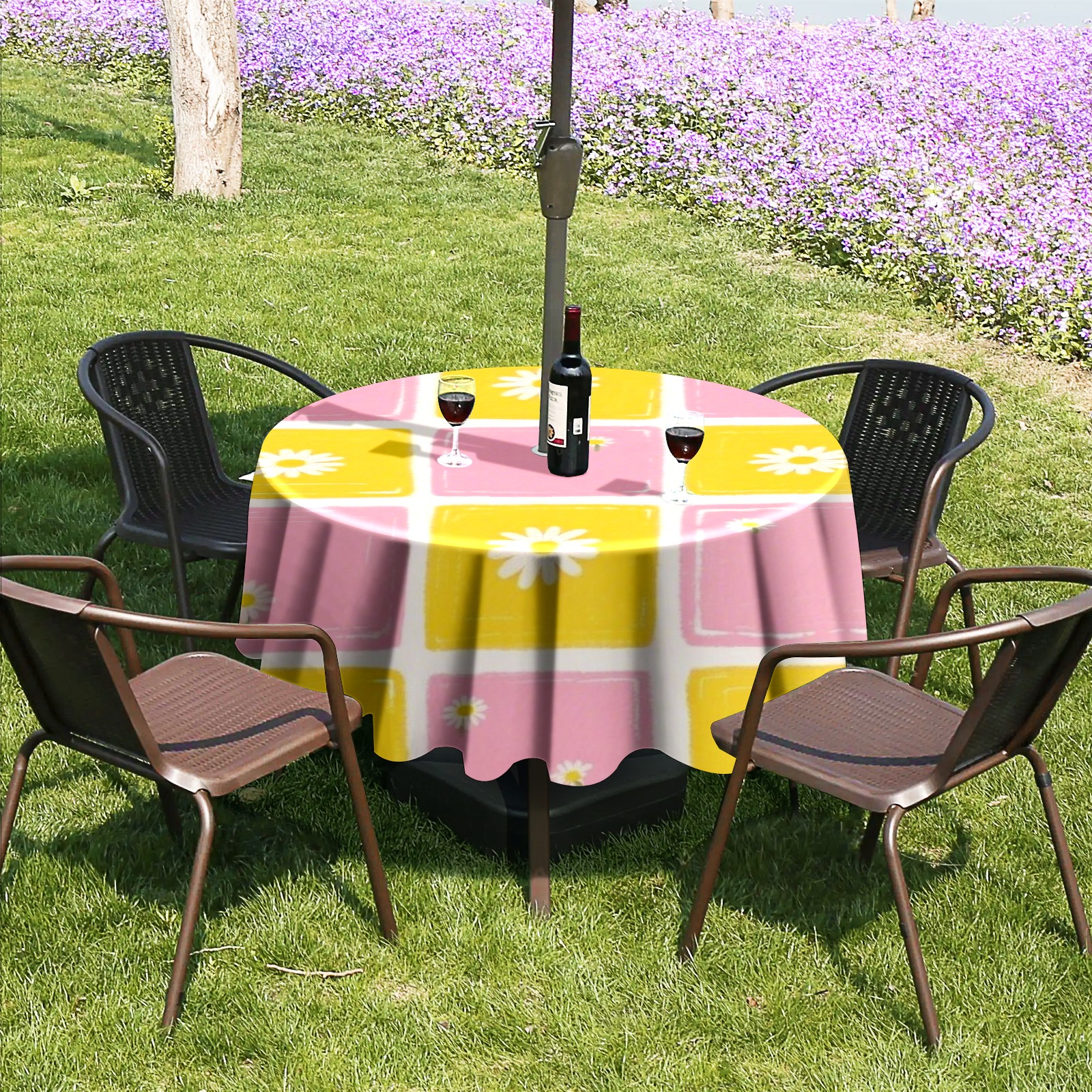 Round Tablecloth with Adjustable Zippered Umbrella Hole Polyester Table Cover Easy Install for Patio, Restaurant & Outdoor Dining Yellow Grid Flower (60in)