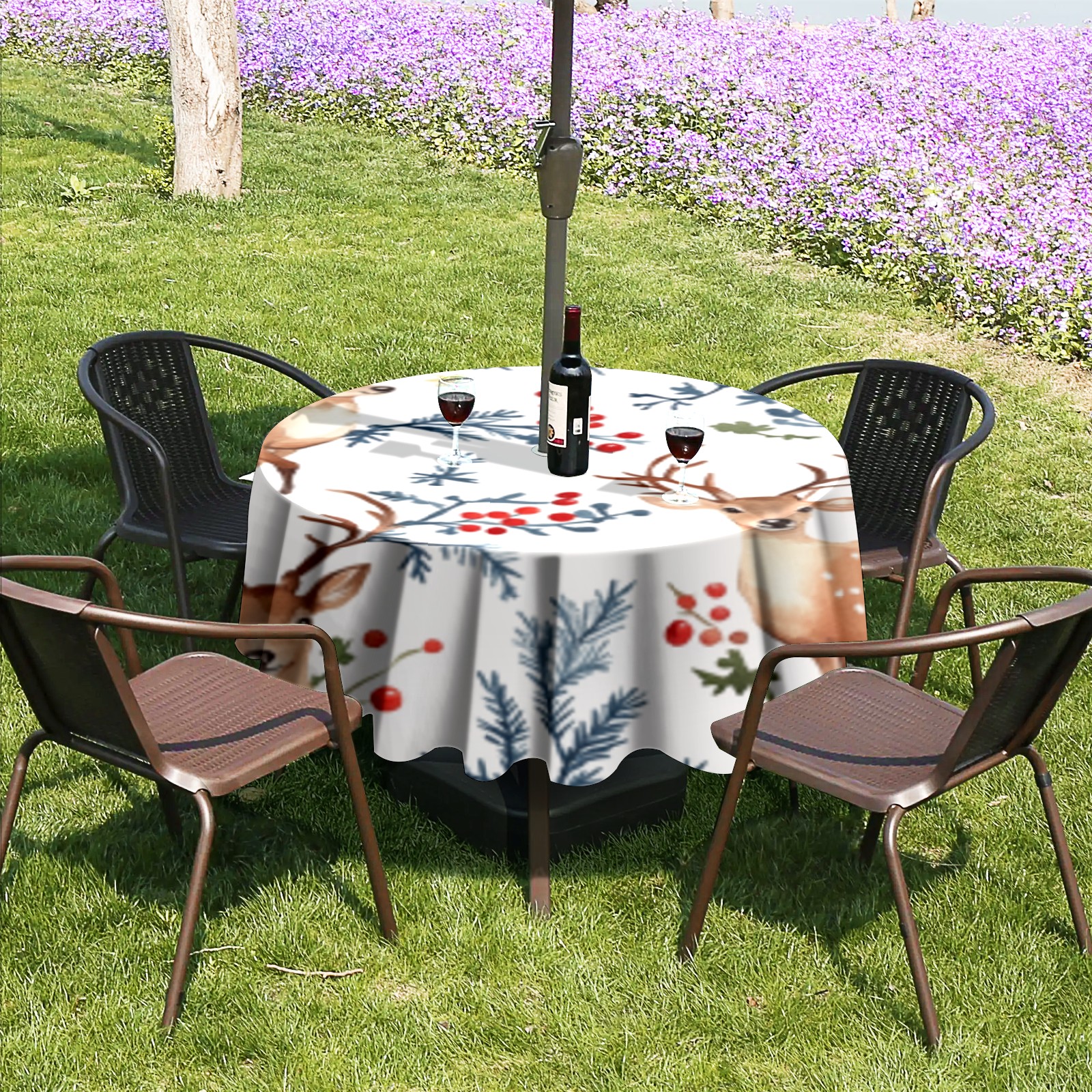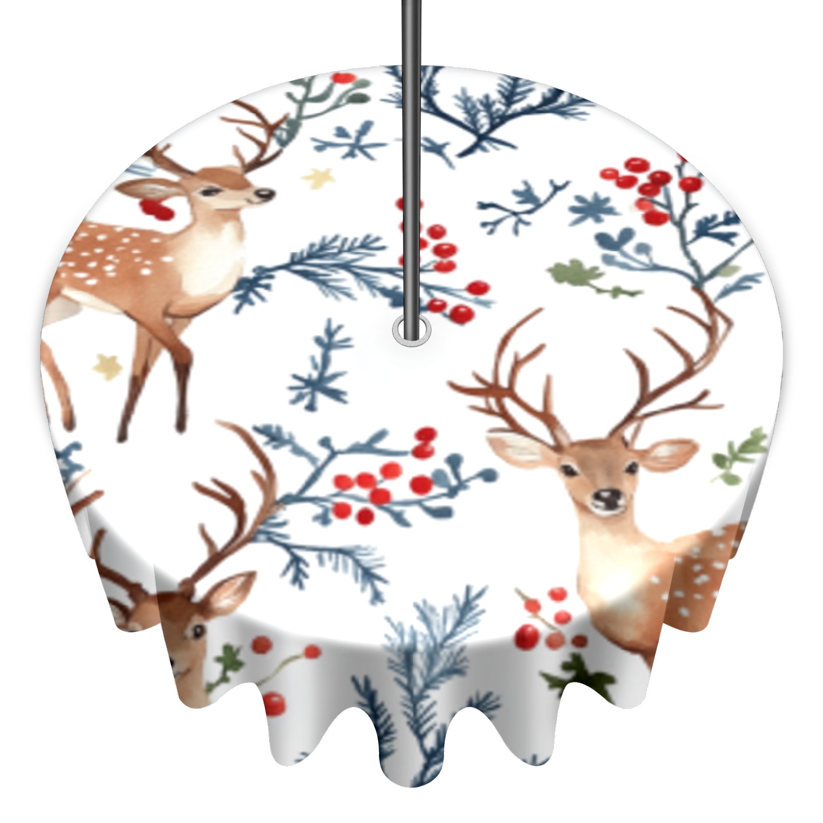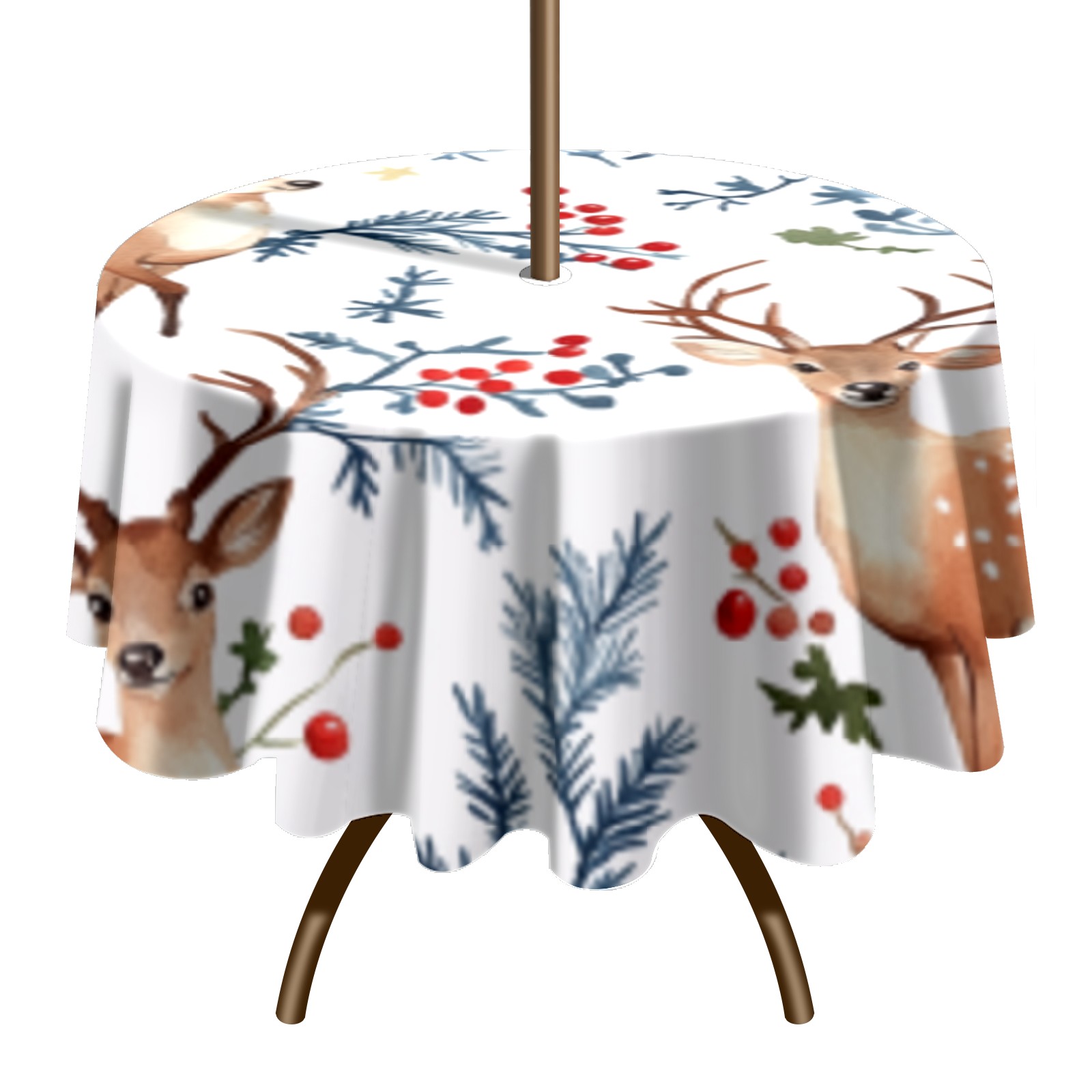 Round Tablecloth with Adjustable Zippered Umbrella Hole Polyester Table Cover Easy Install for Patio, Restaurant & Outdoor Dining Deer And Berry Pattern (60in)
